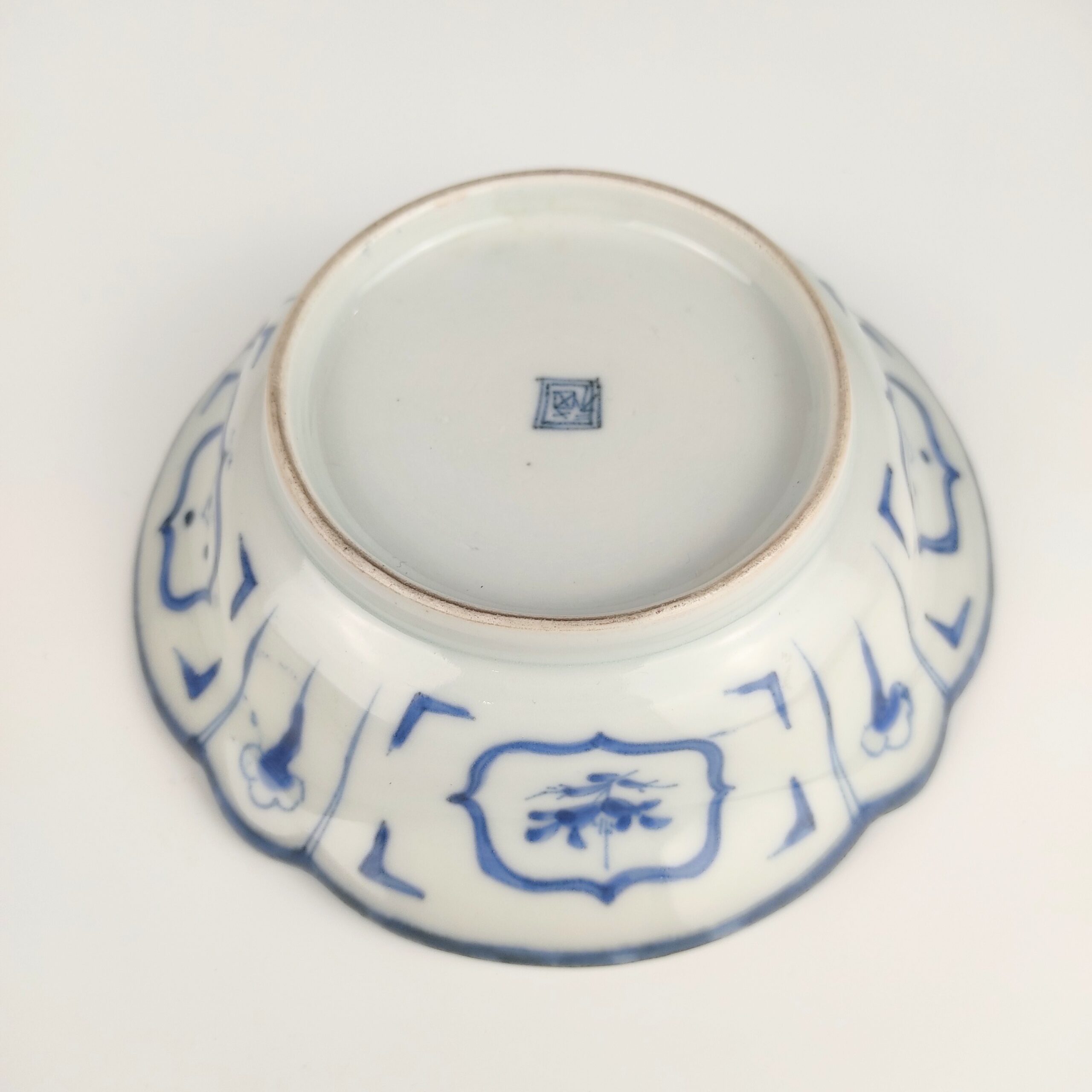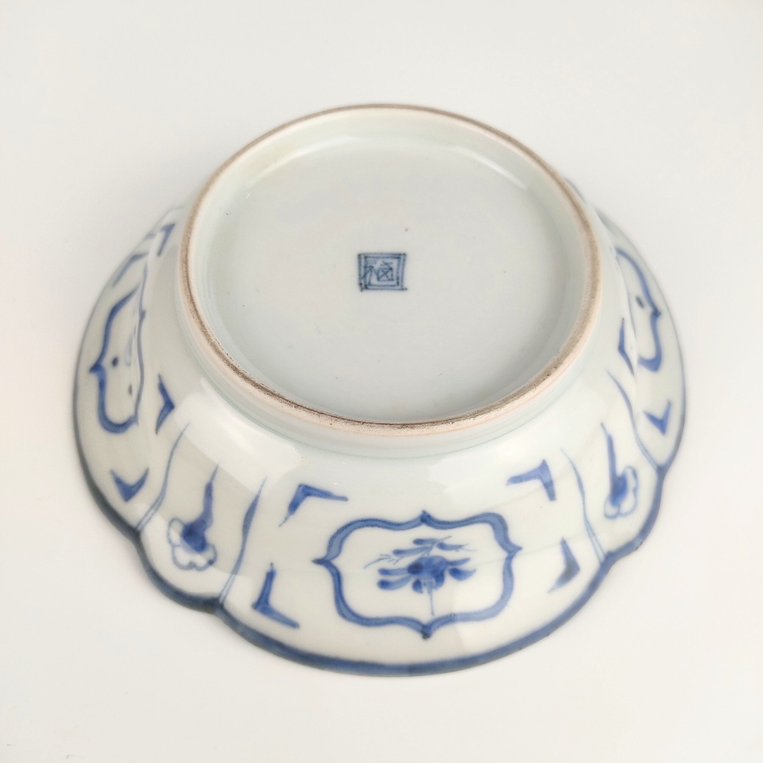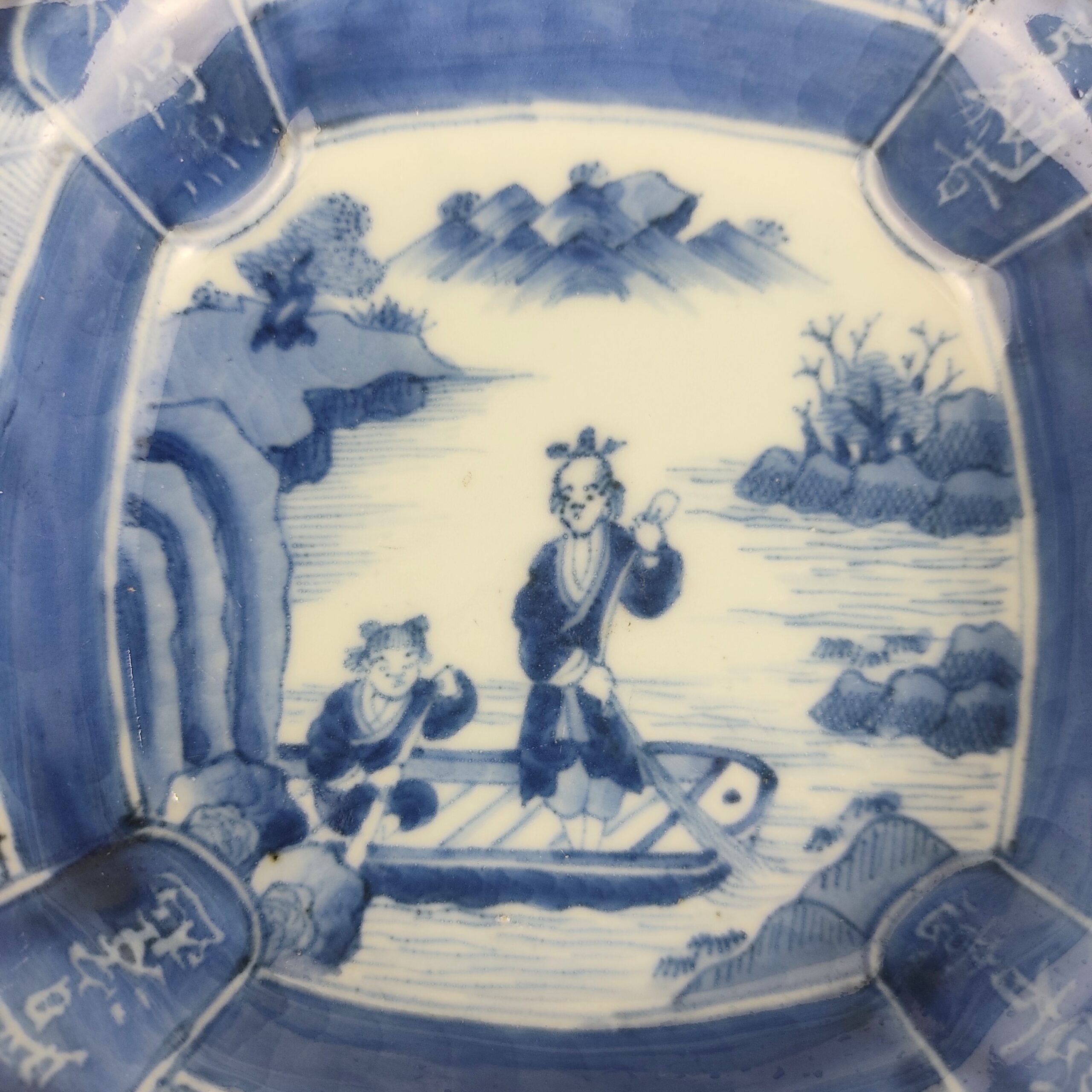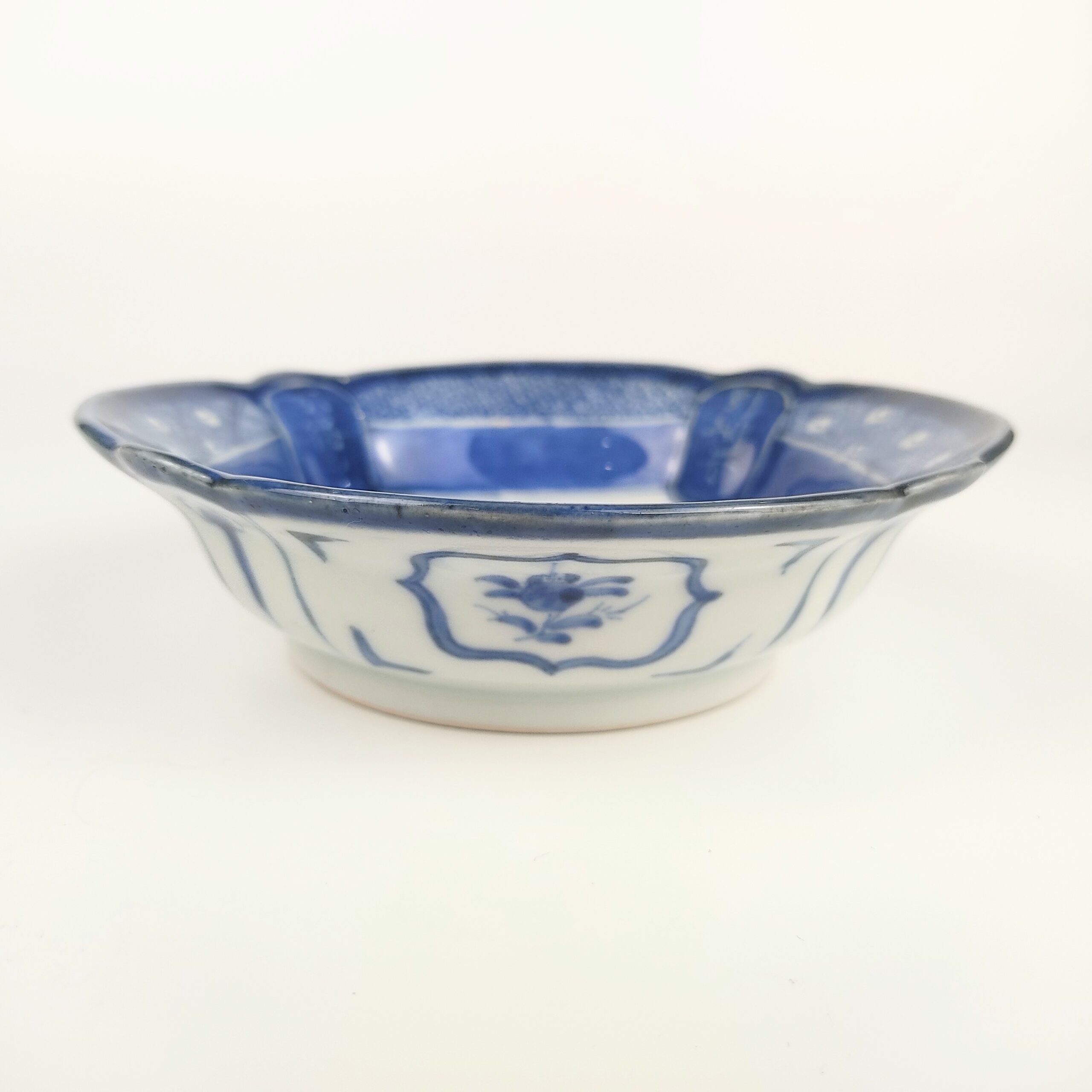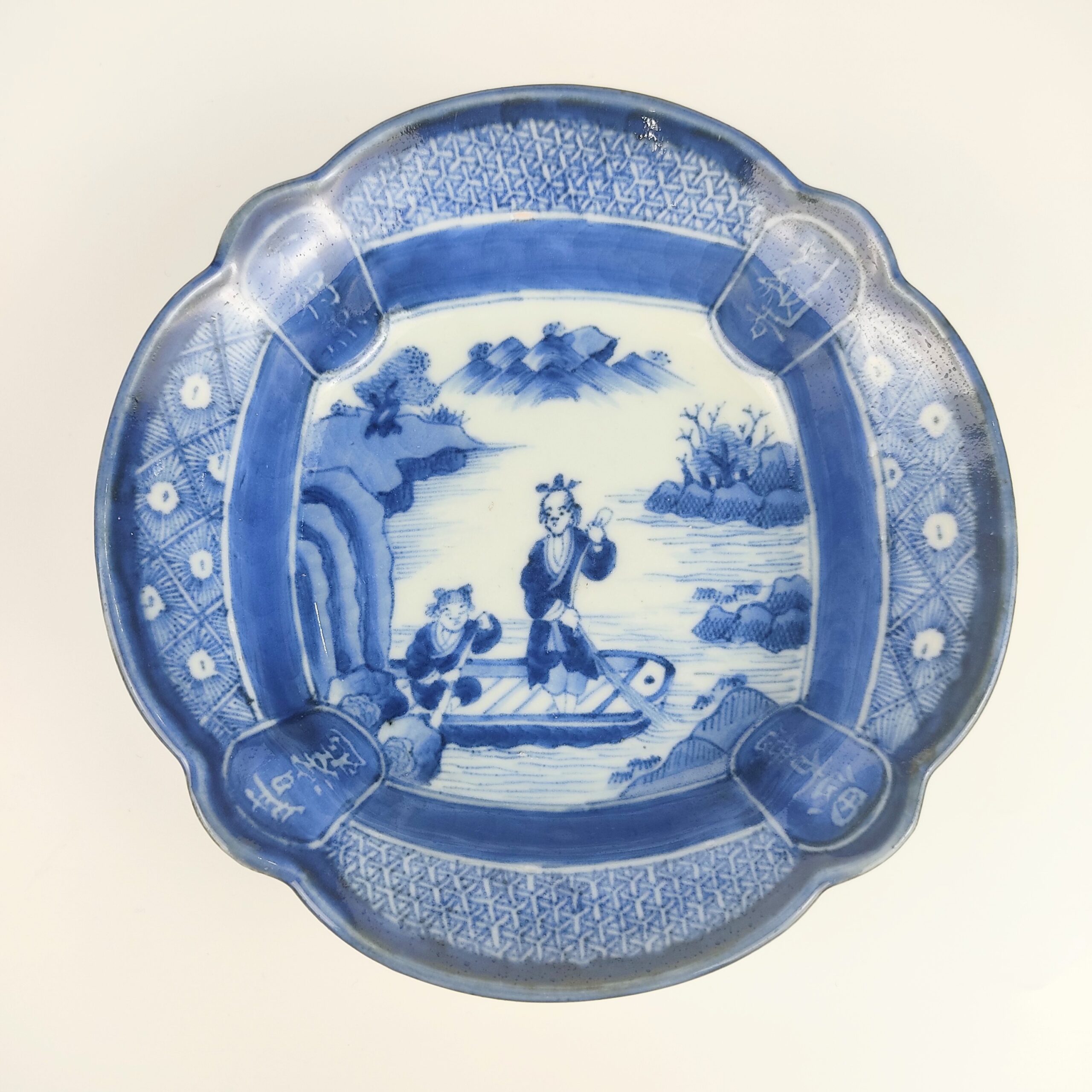 japanese antique Imari ware blue and white bowl with design of man drawing a net