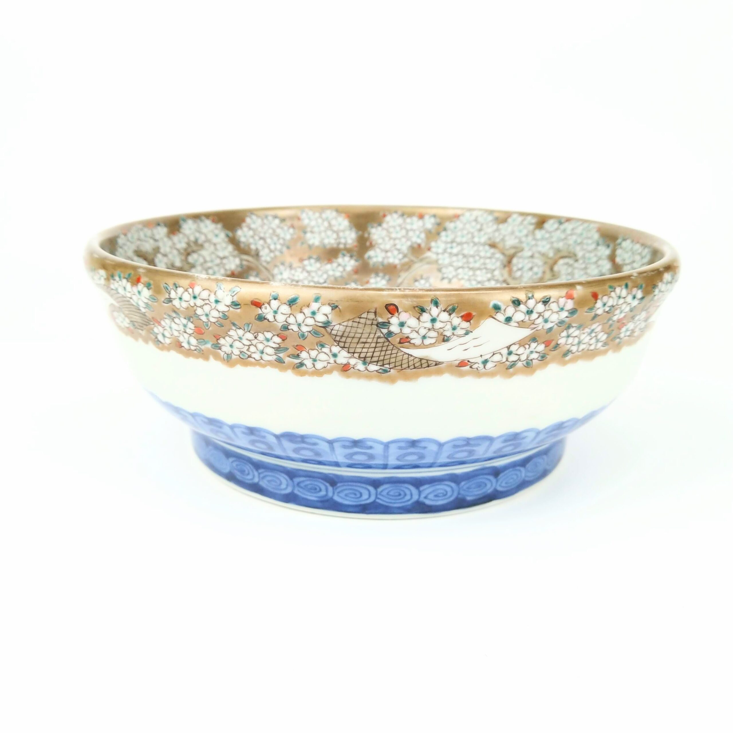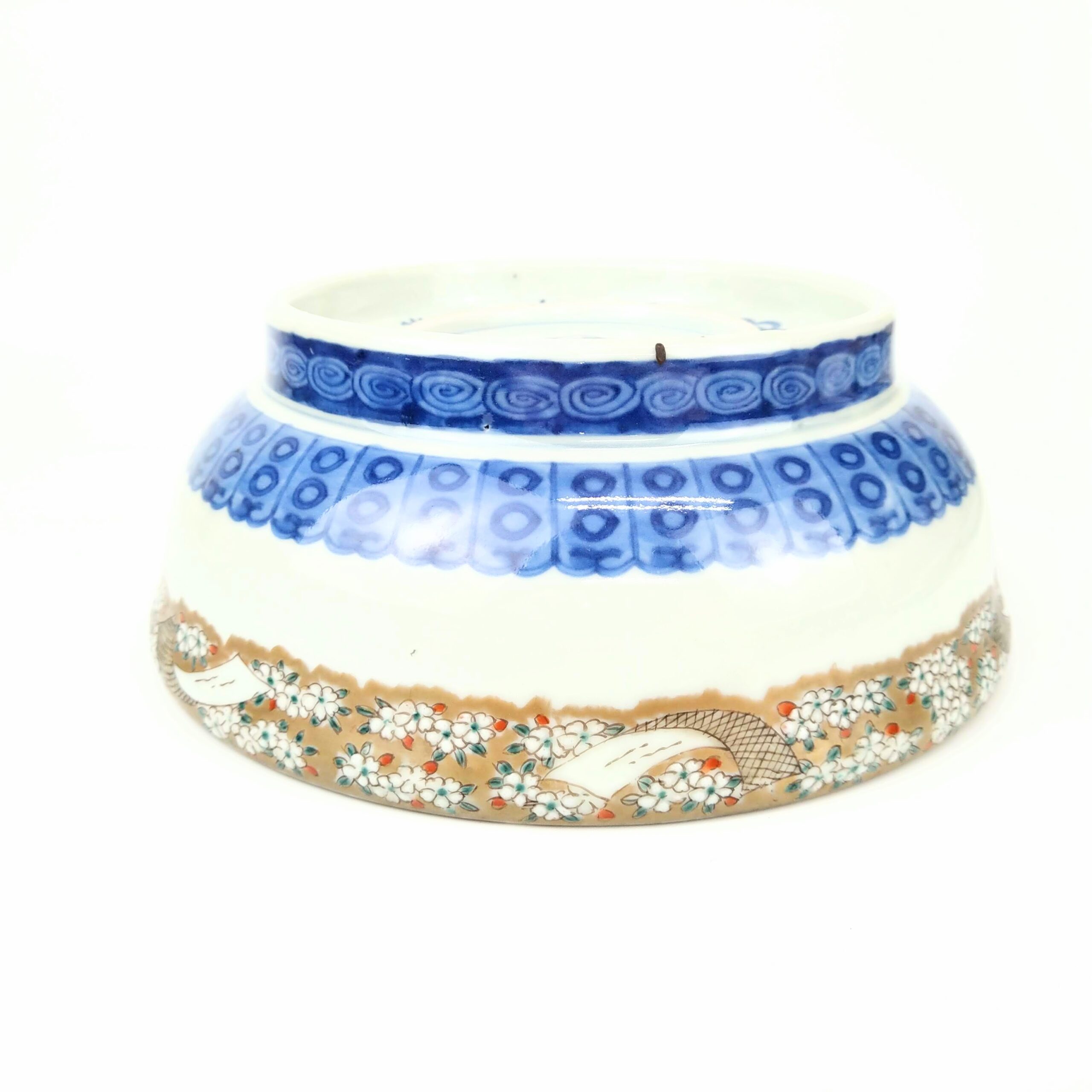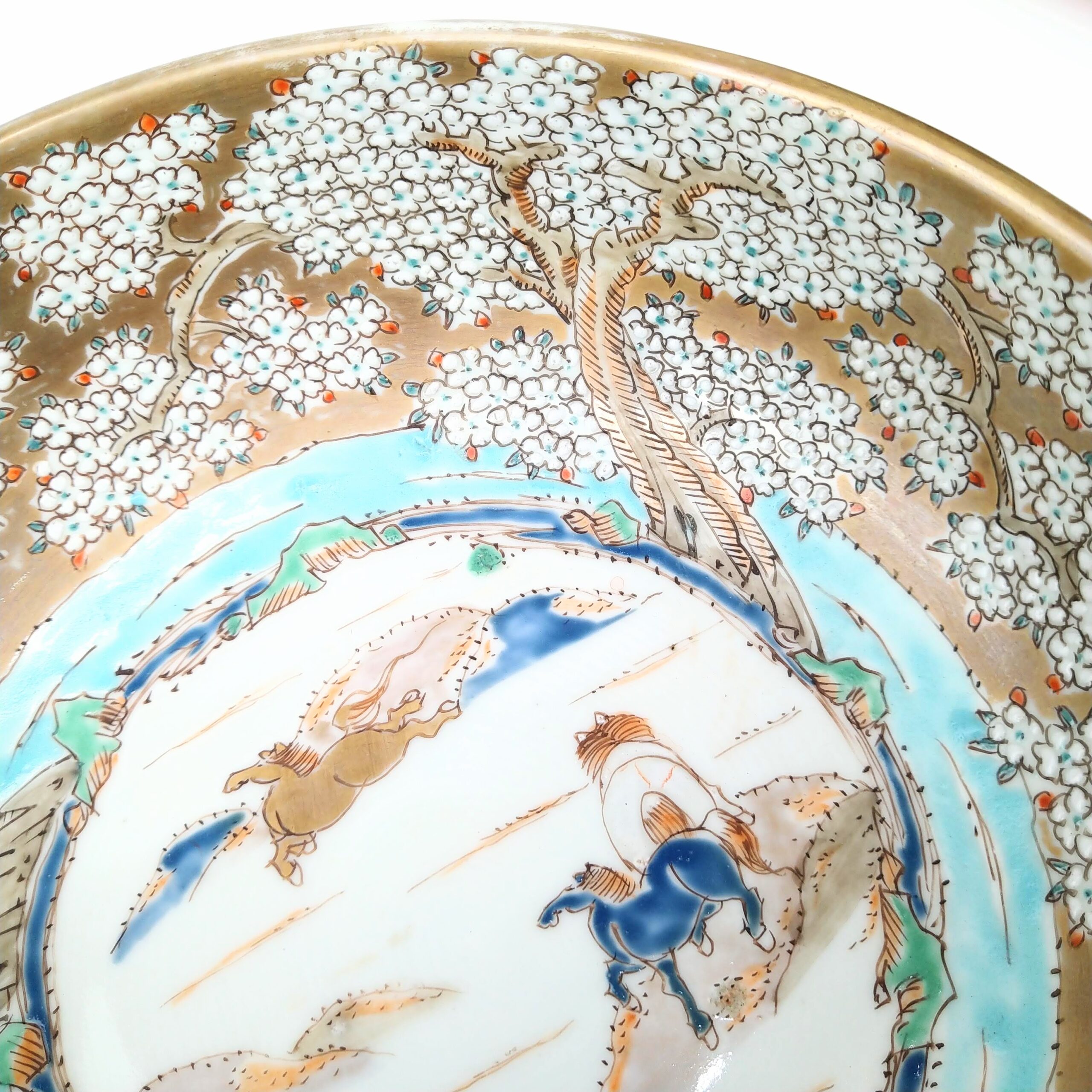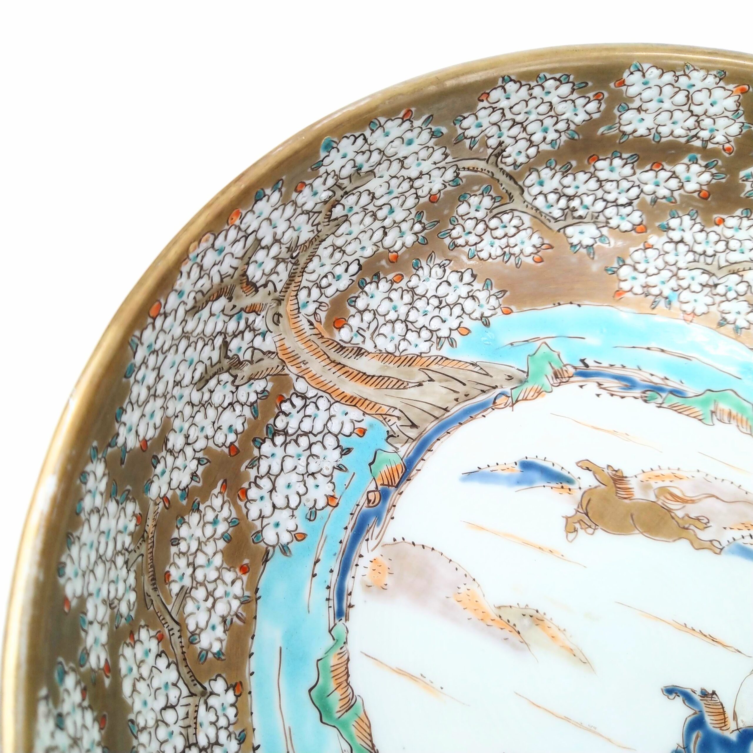 japanese antique Imari ware colored bowl with design of cherry blossom and horse
