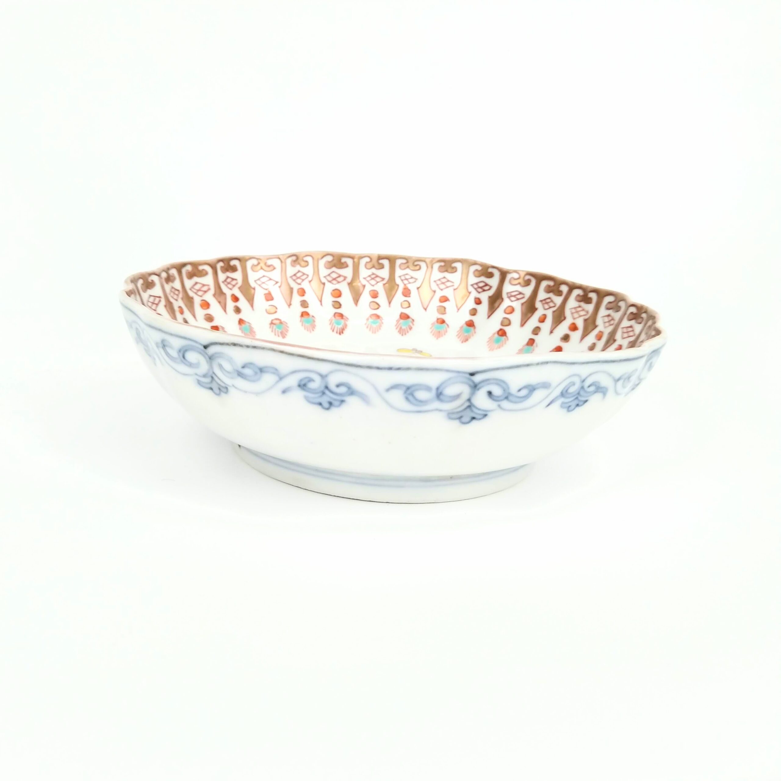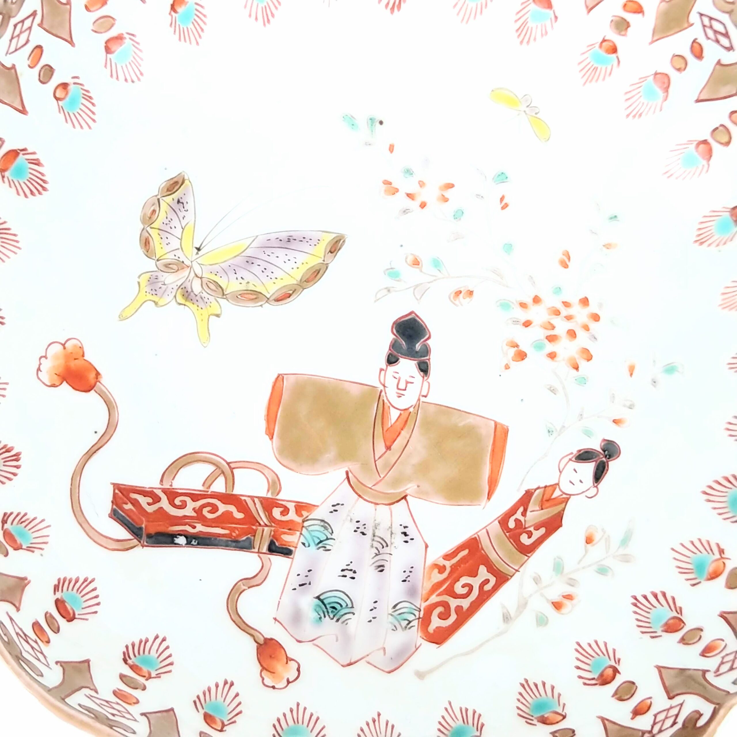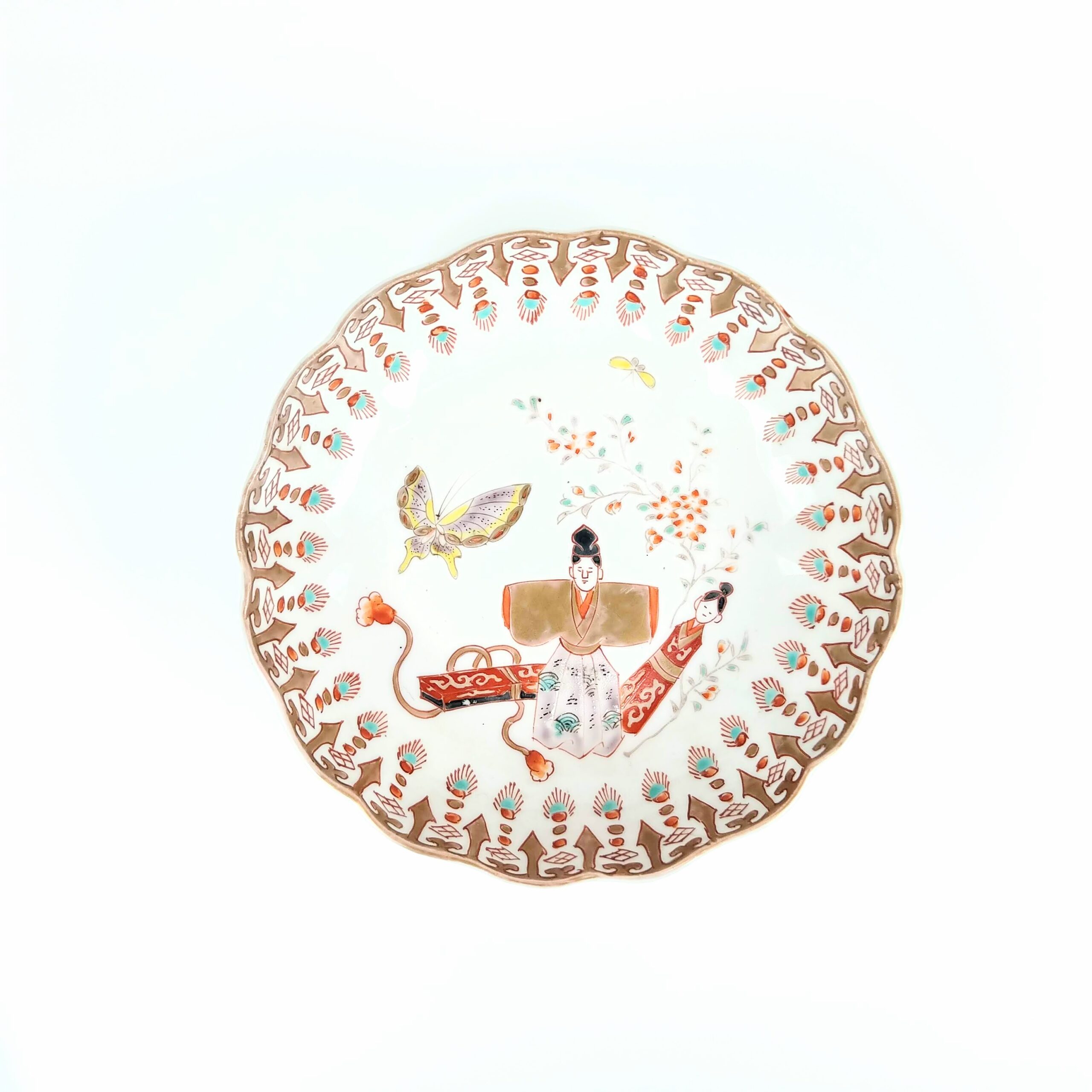 japanese antique Imari ware colored bowl with design of standing japanese dolls and butterfly