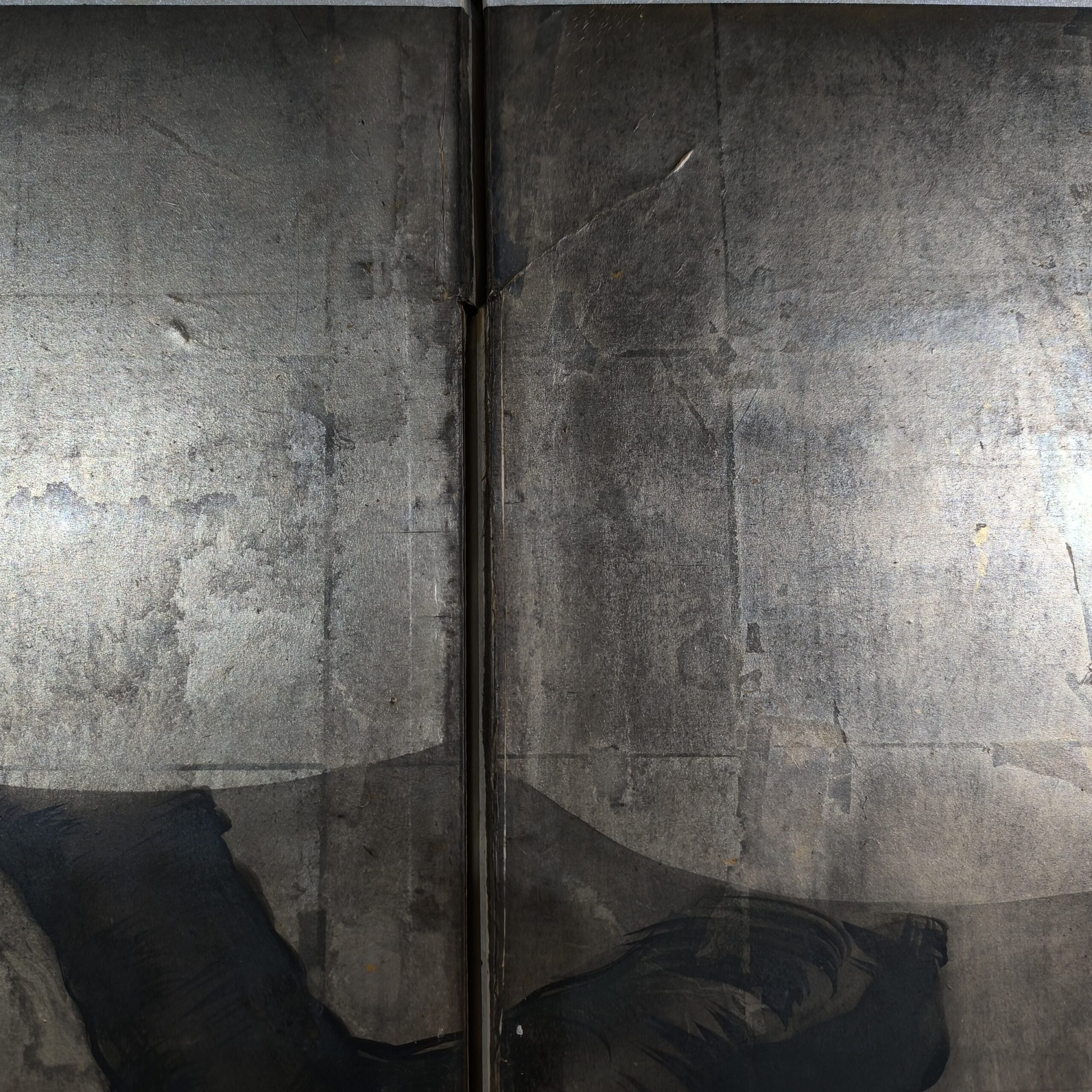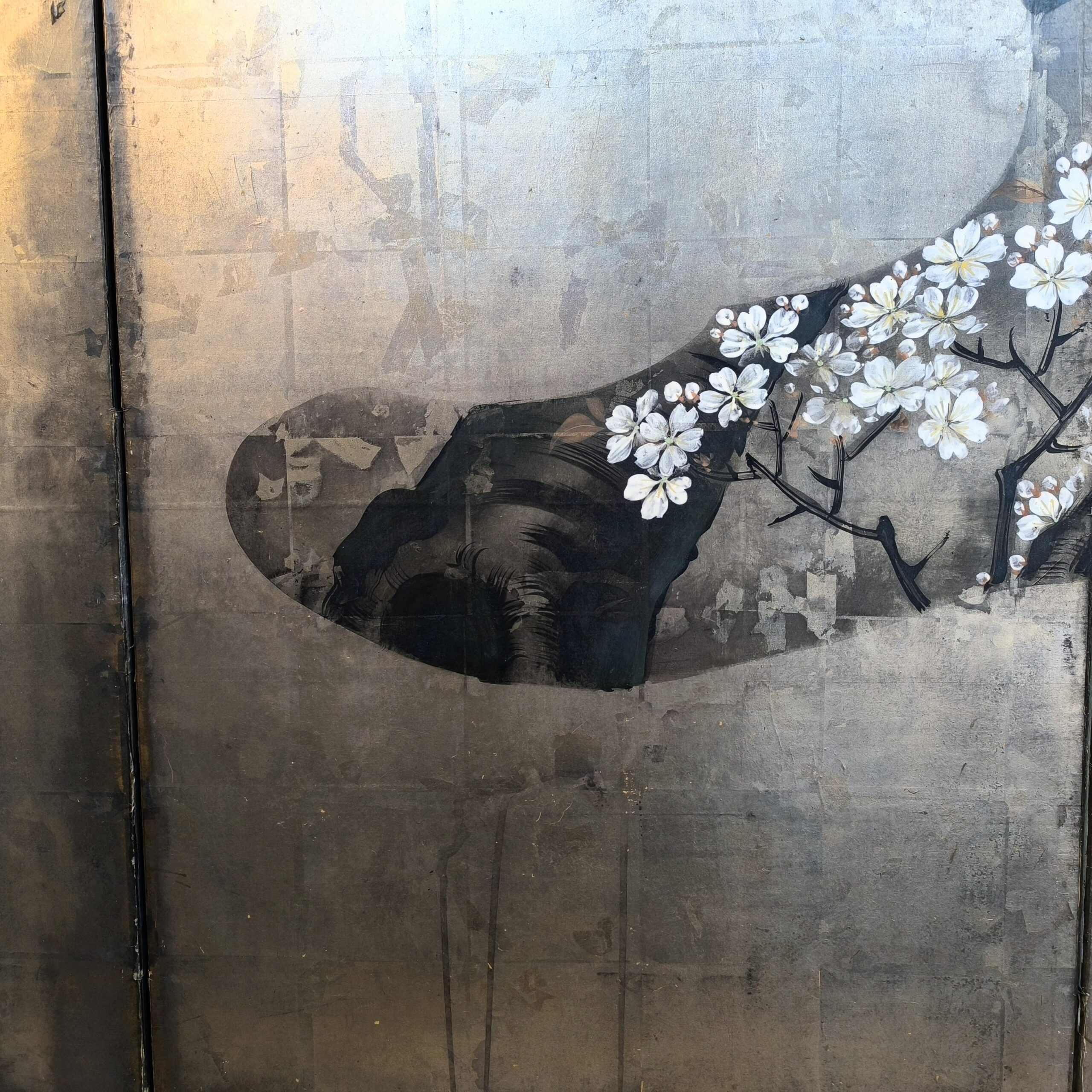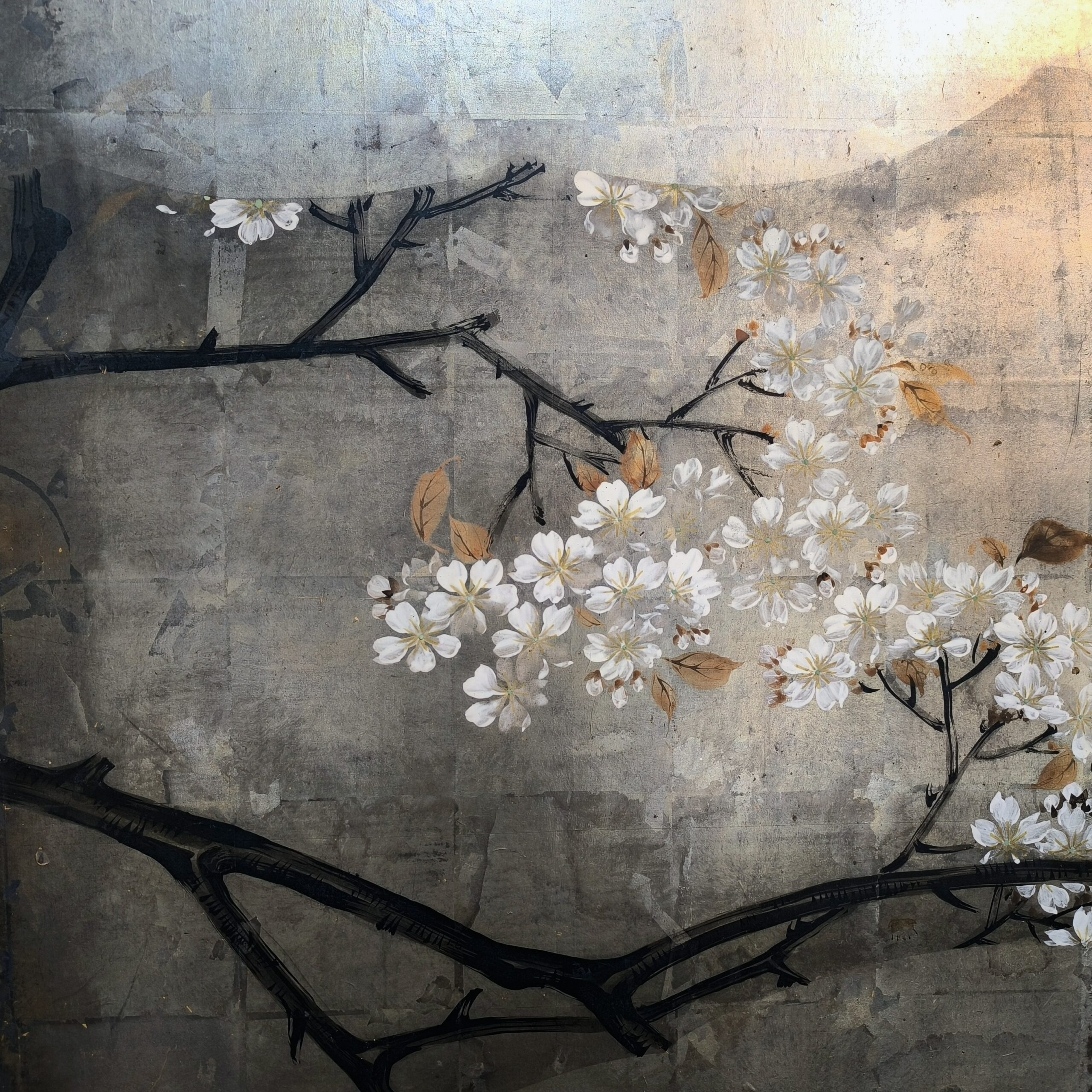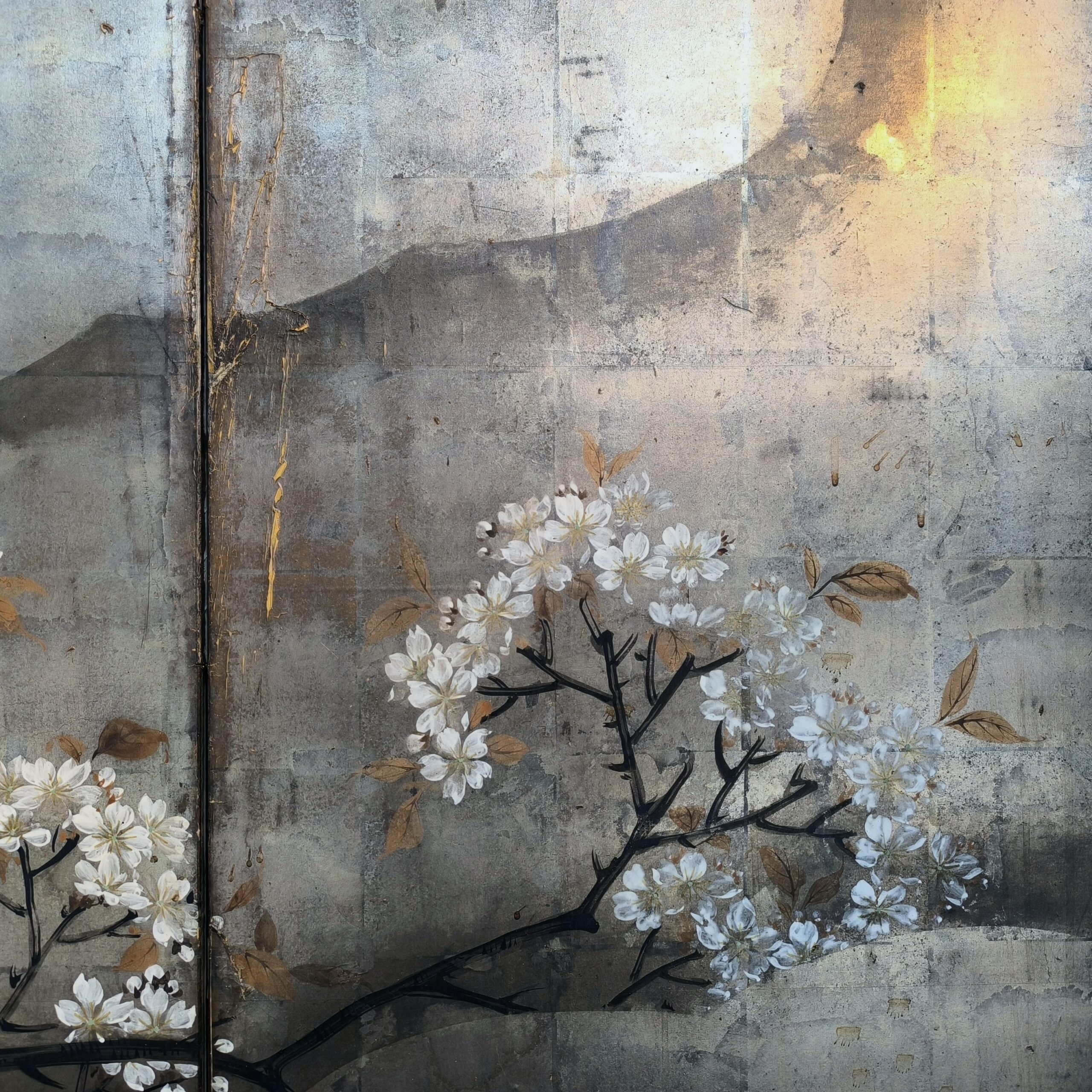 Silver-ground folding screens are relatively rare; the silver leaf, weathered just right, creates a sense of quiet melancholy, and the large cherry tree glimpsed through the silver clouds lends the screen an air of both fantasy and mystery.