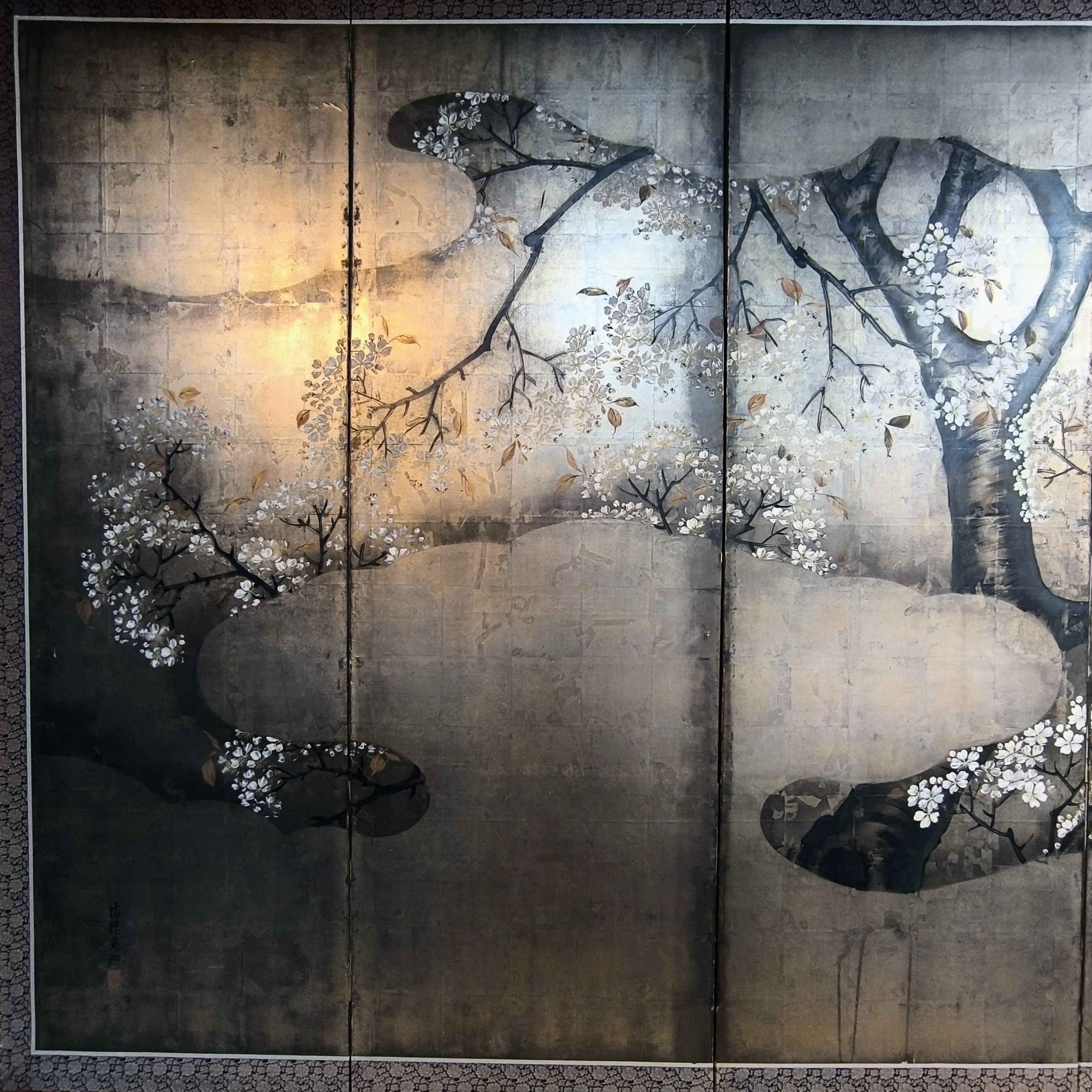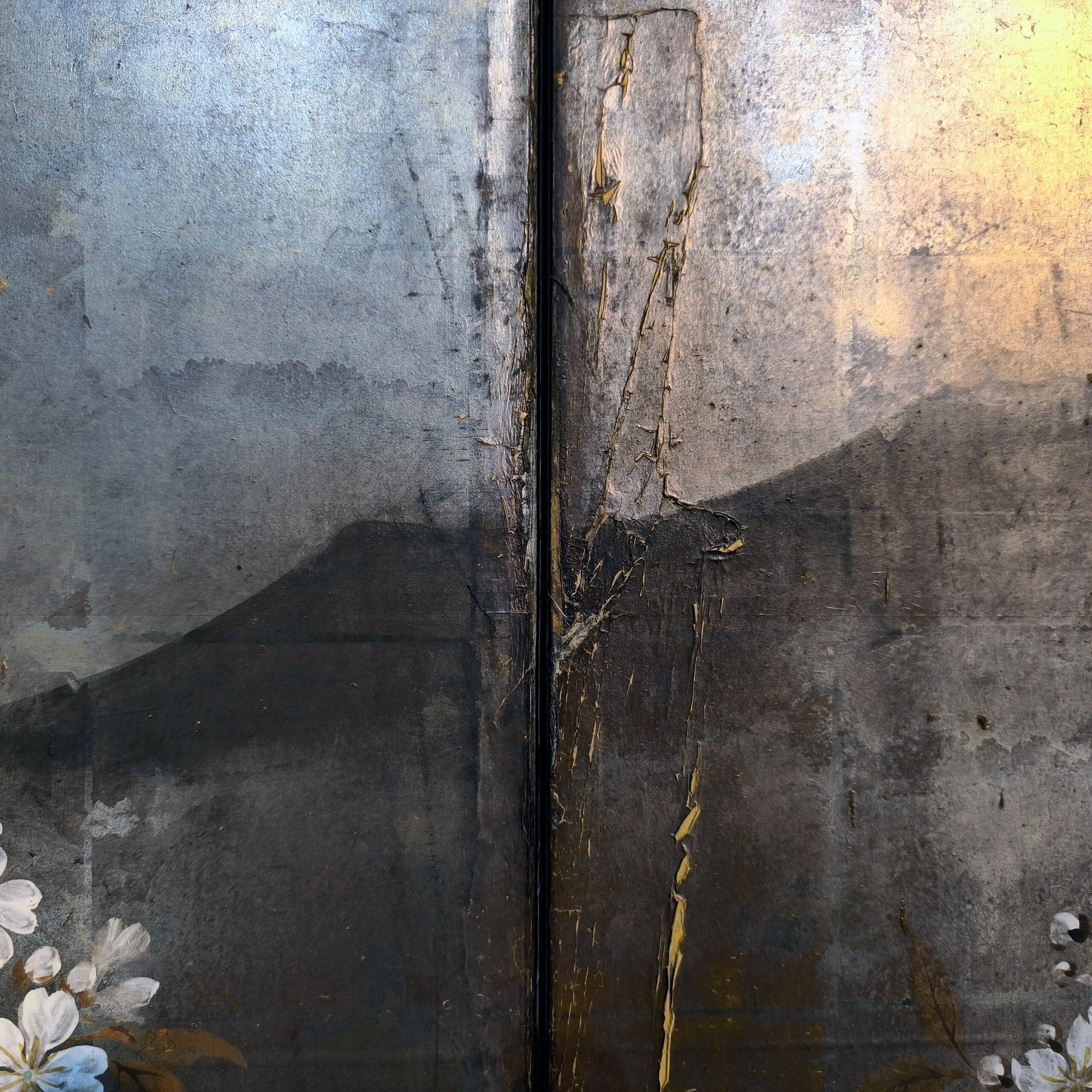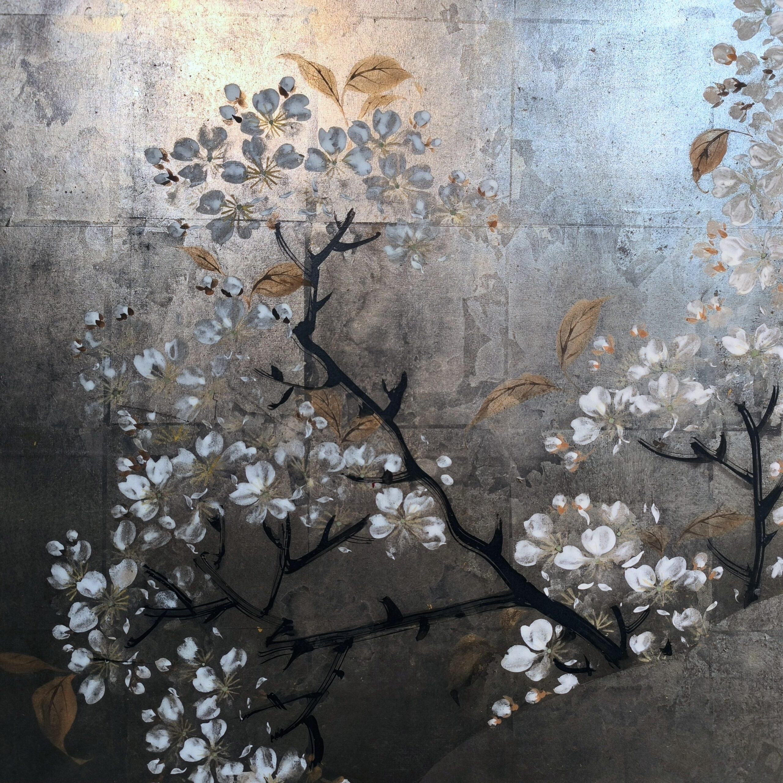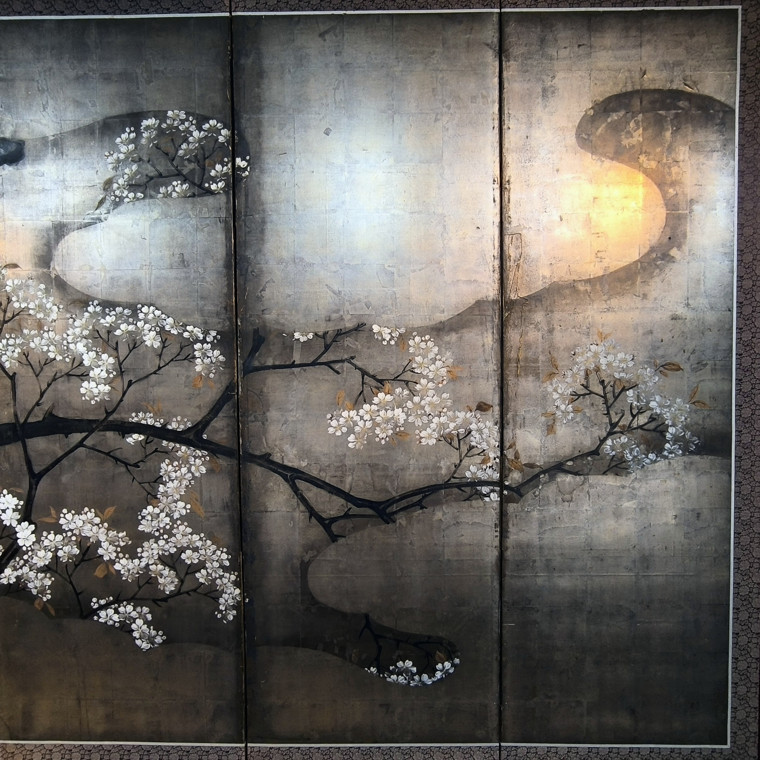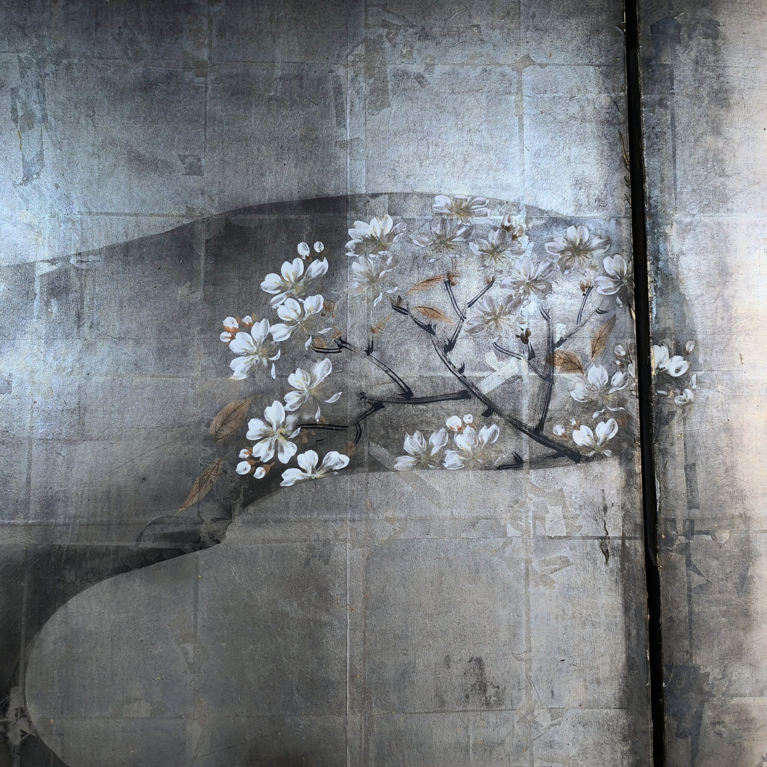 Silver-ground folding screens are relatively rare; the silver leaf, weathered just right, creates a sense of quiet melancholy, and the large cherry tree glimpsed through the silver clouds lends the screen an air of both fantasy and mystery.