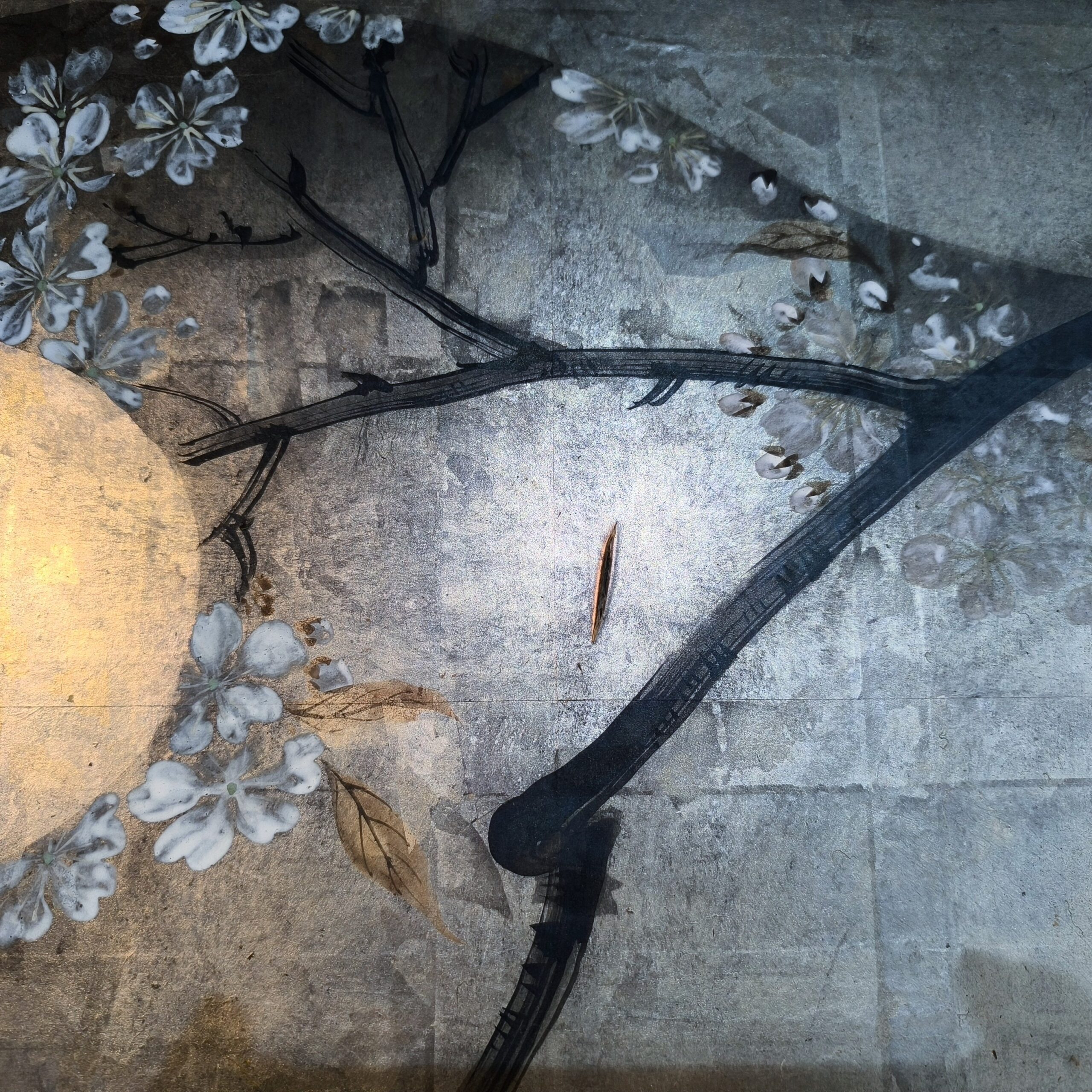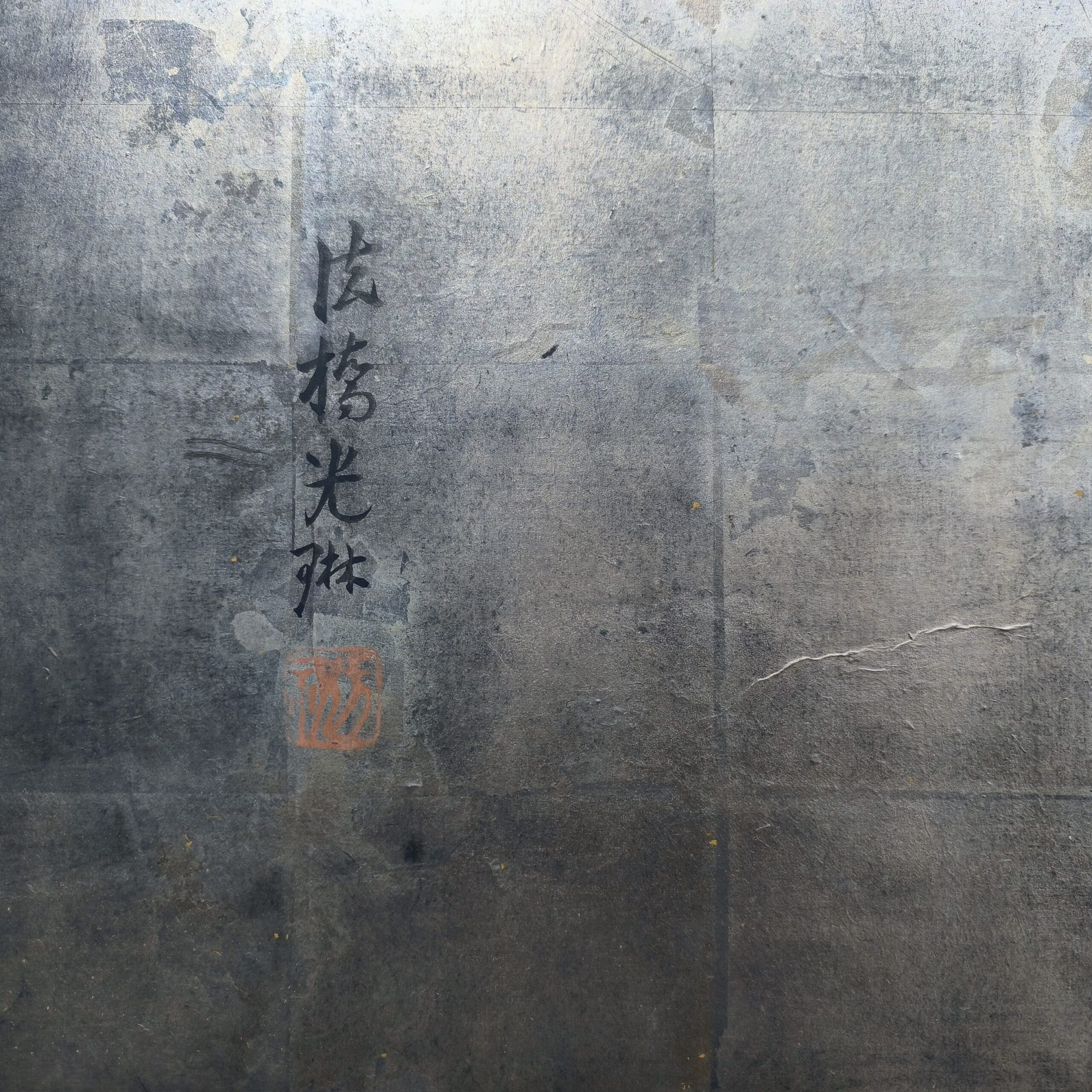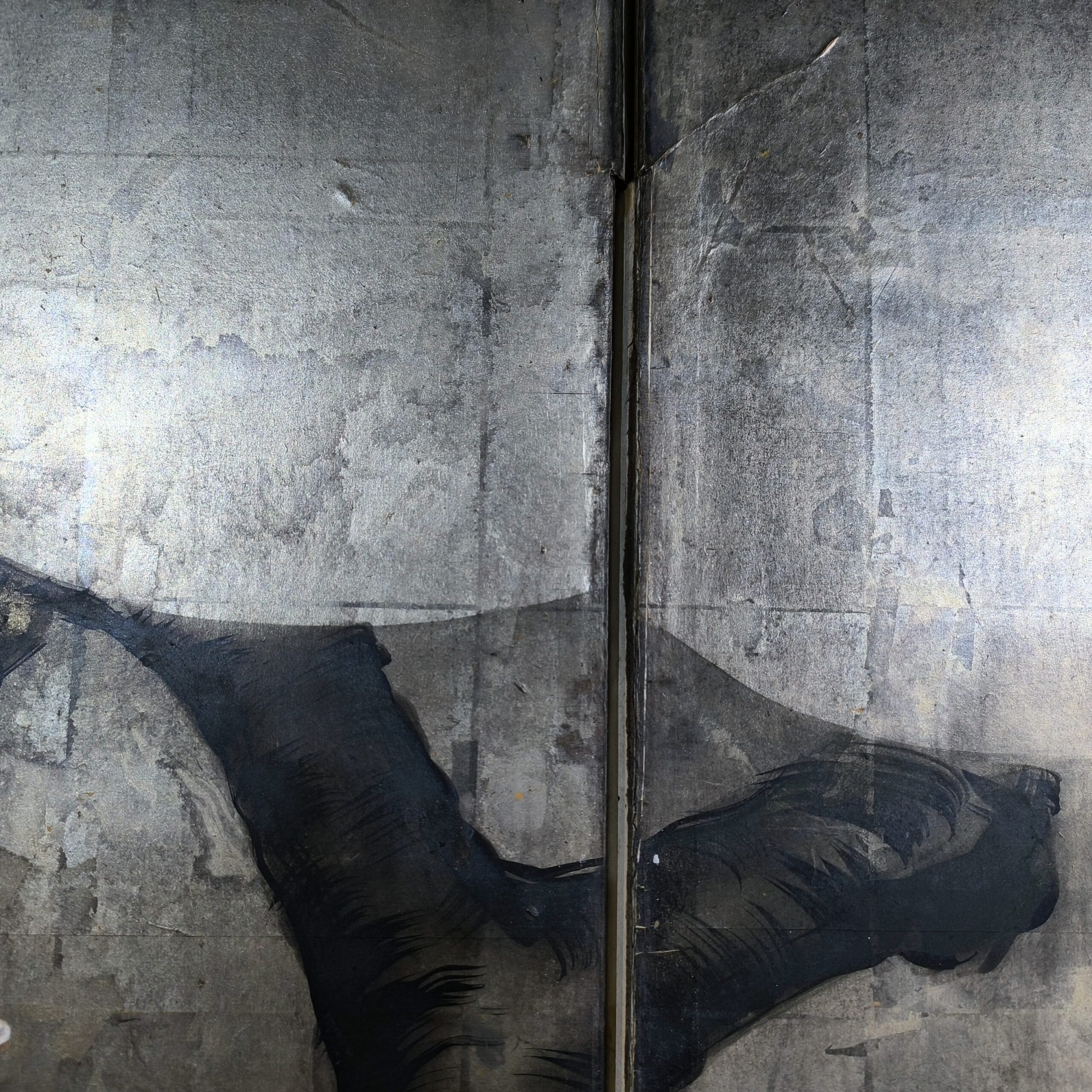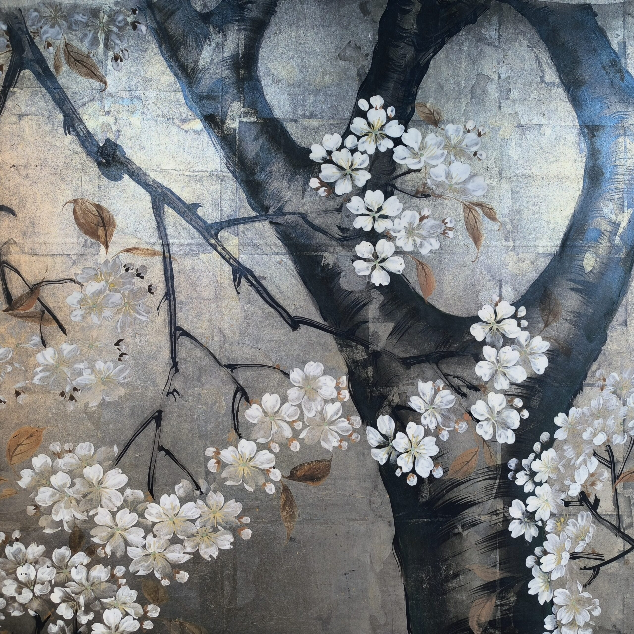 Silver-ground folding screens are relatively rare; the silver leaf, weathered just right, creates a sense of quiet melancholy, and the large cherry tree glimpsed through the silver clouds lends the screen an air of both fantasy and mystery.
