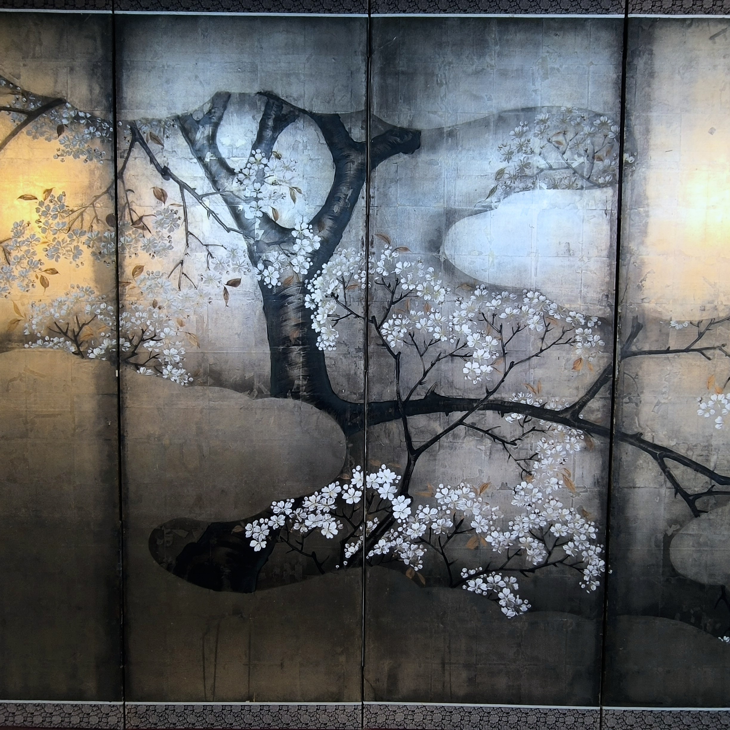 A folding screen is made of multiple boards attached with paper or silk and connected with hinges, and can be folded.They were used as room partitions, wind shields, decorations for ceremonies and rituals, and for viewing as works of art.Originally, they were placed on the floor at an angle, but today they are often spread straight out and displayed on the wall like a painting.The most popular type is the one with a picture painted on the front on a gold leaf background.The size and color of the gold leaf differs depending on the period, and the period is considered from the natural mineral pigments used and the composition of the painting.