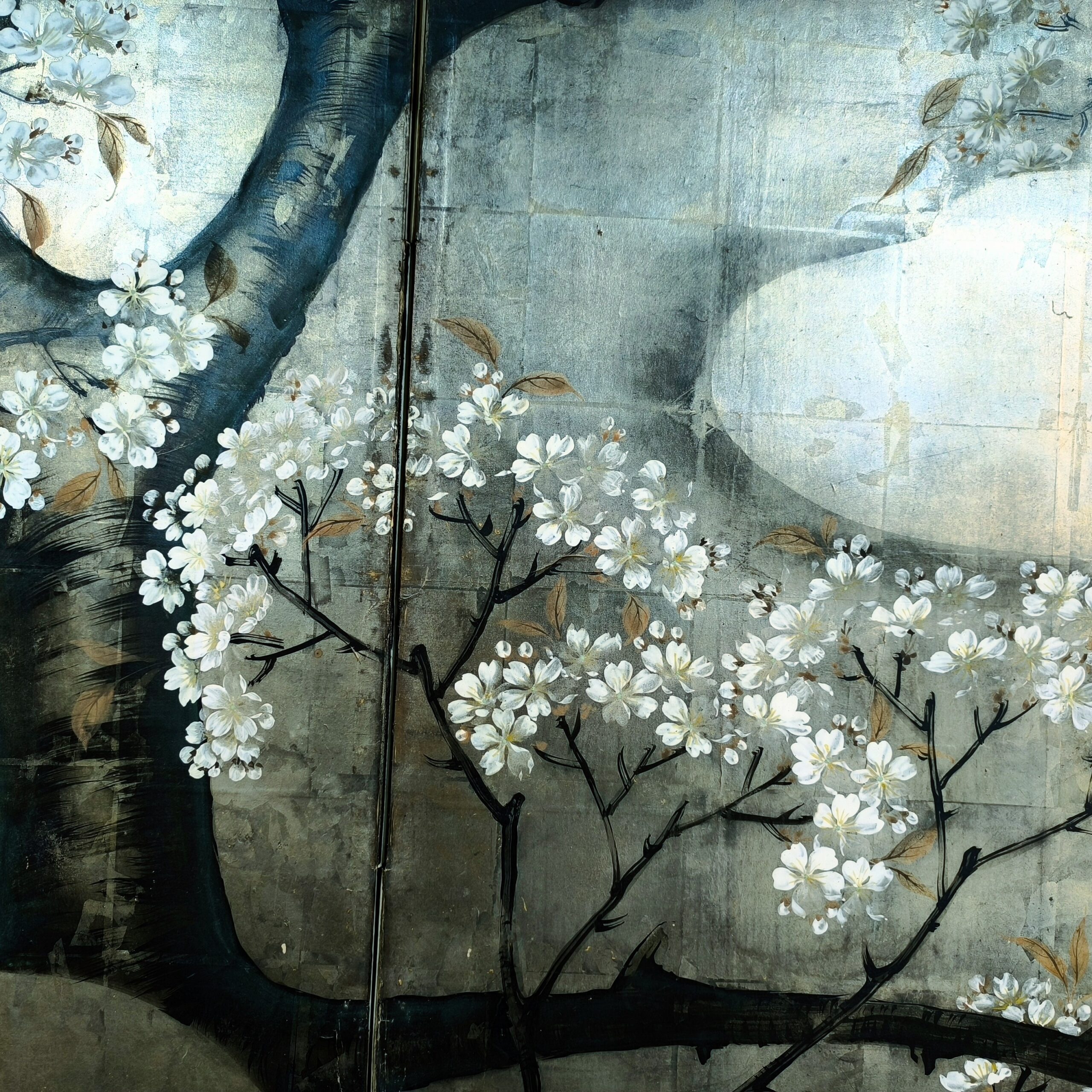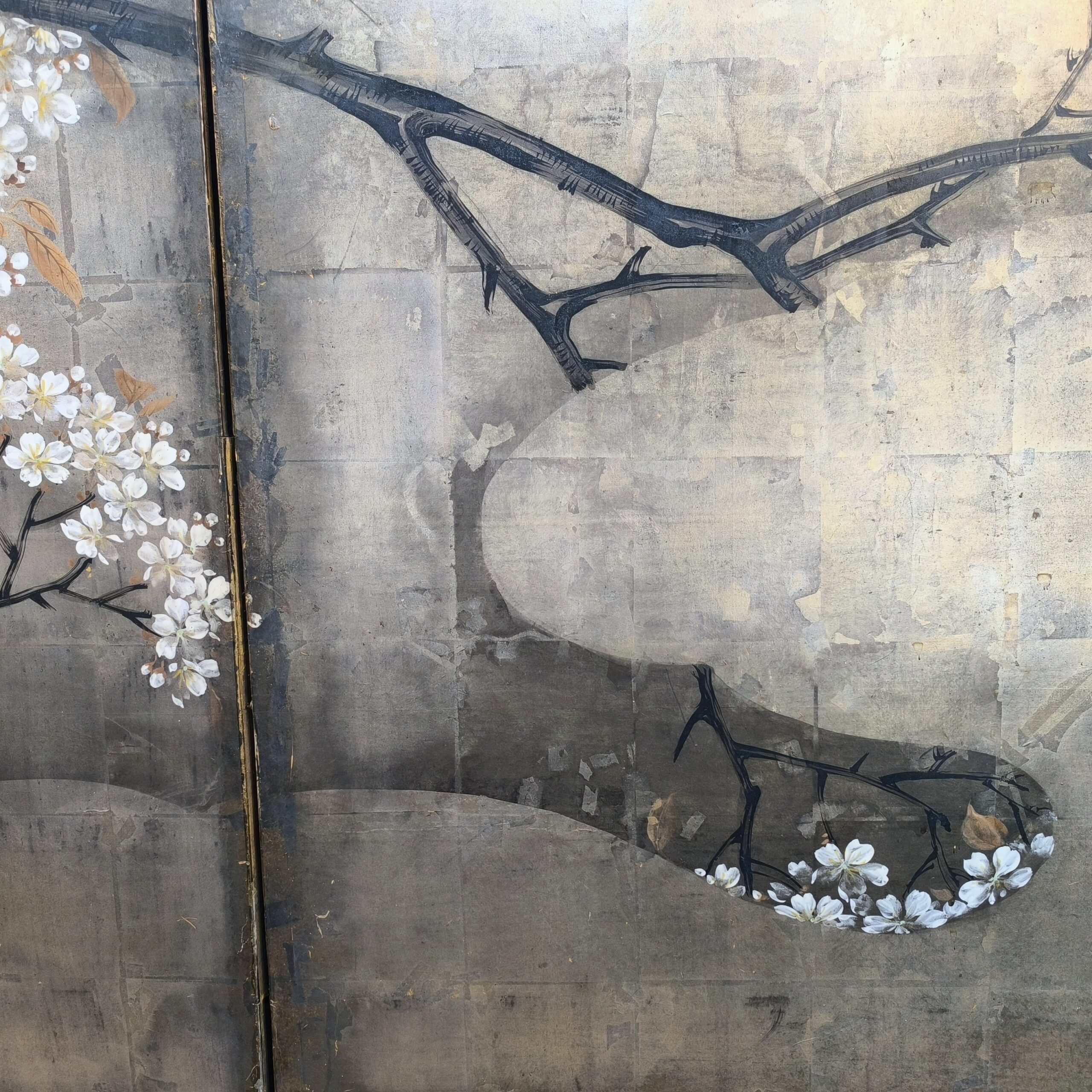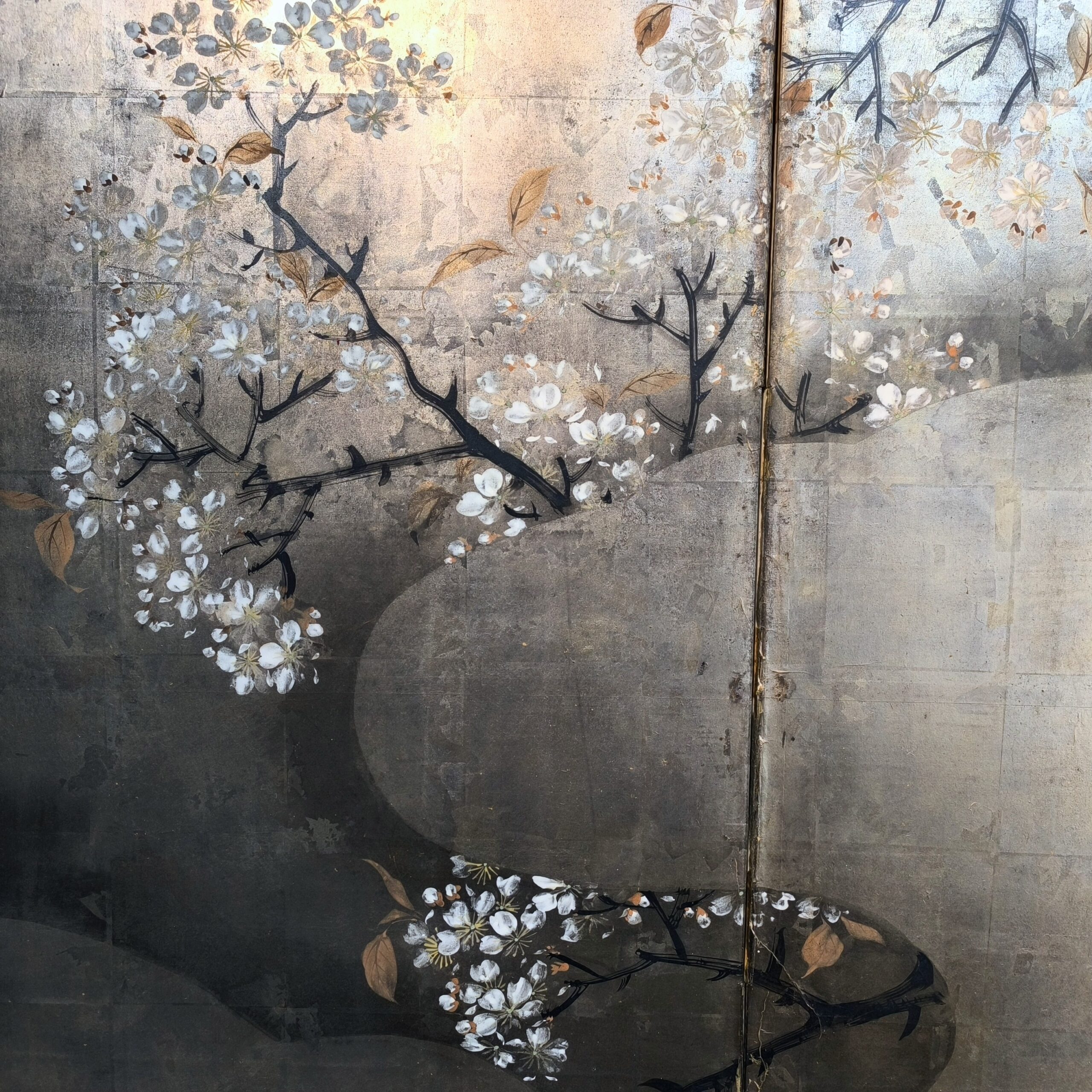 japanese antique Six hold paper screen paited in ink and color on a silver ground with cherry blossom