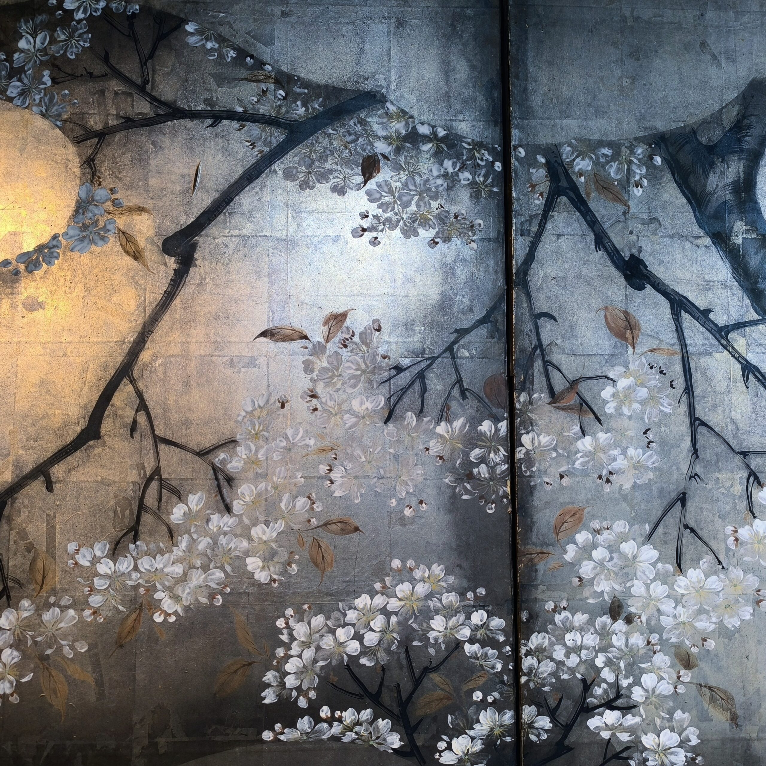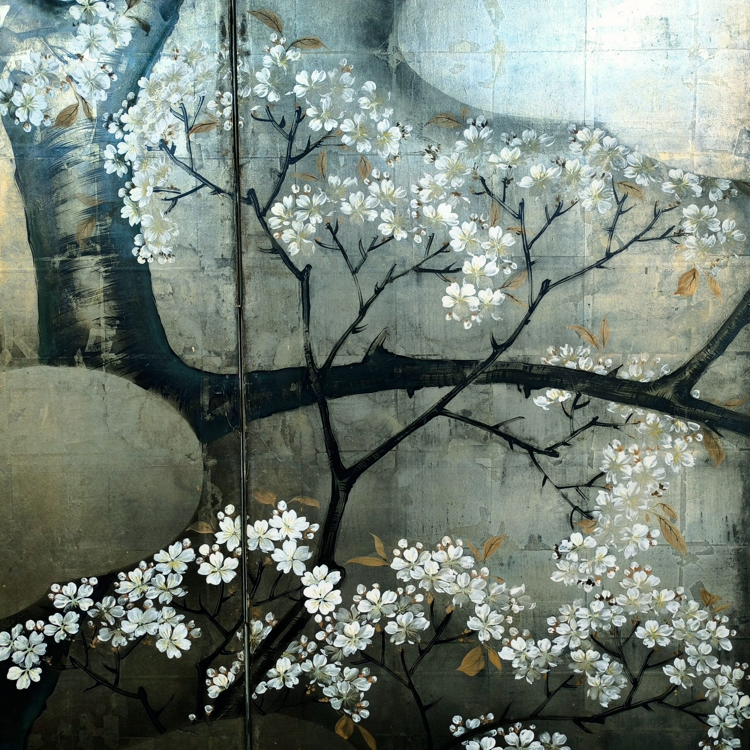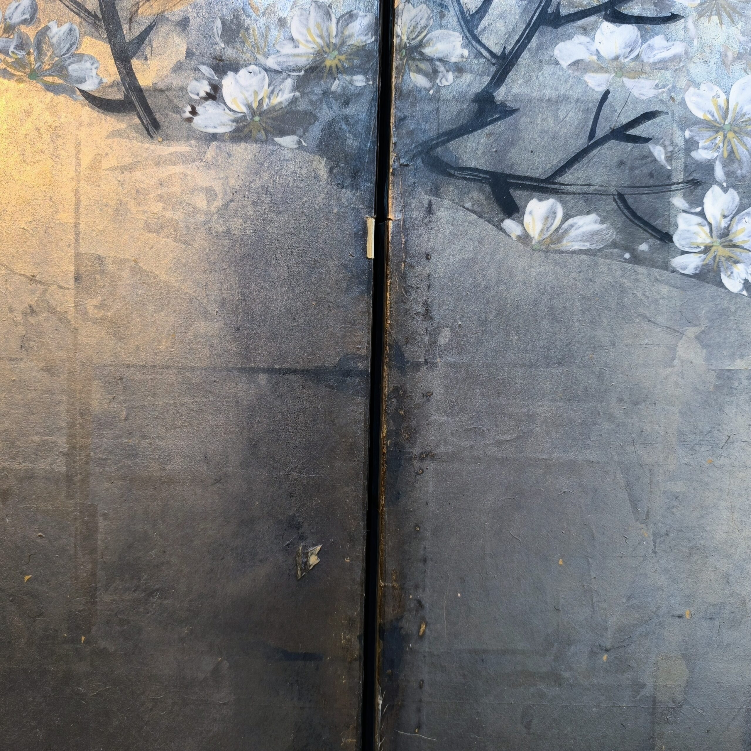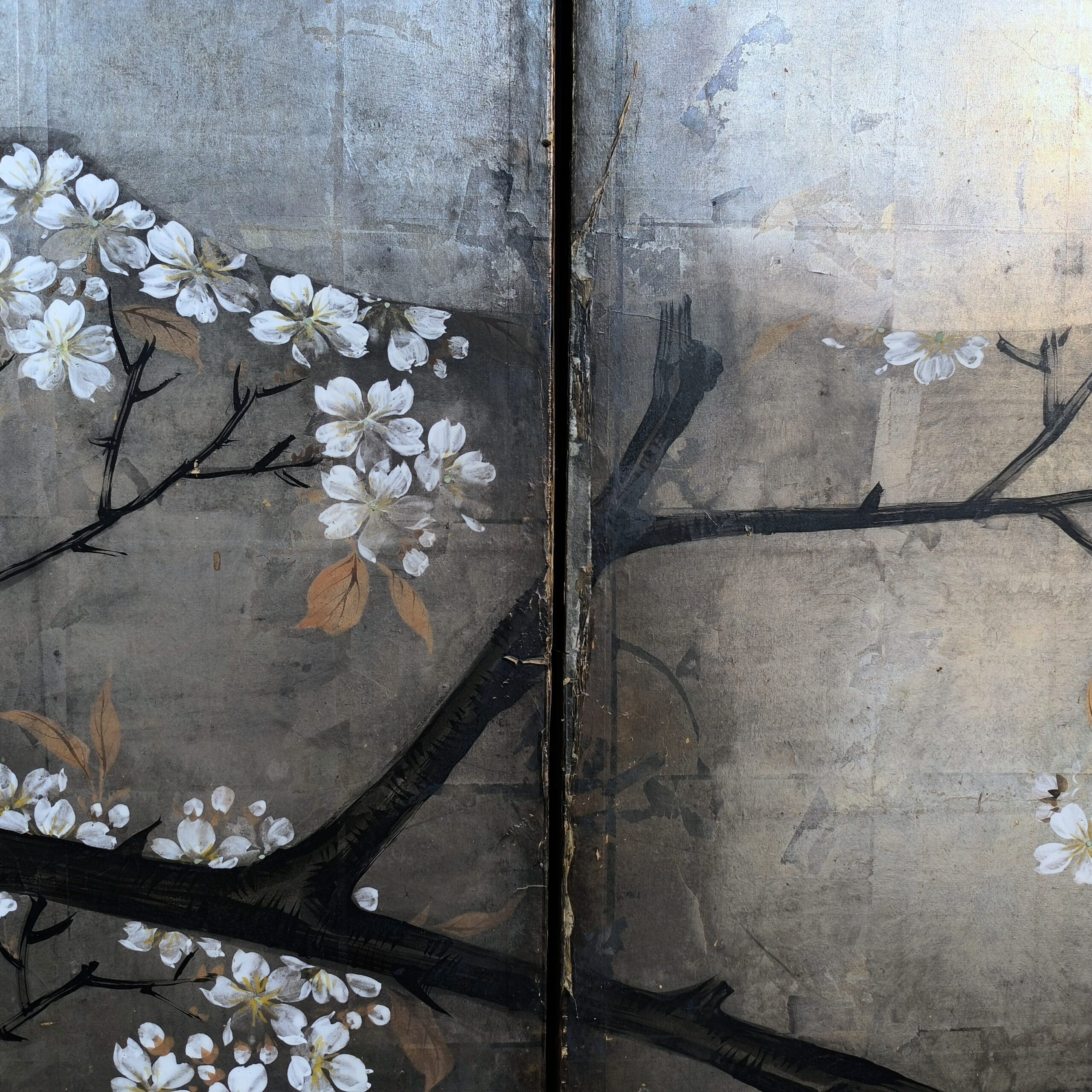 japanese antique Six hold paper screen paited in ink and color on a silver ground with cherry blossom