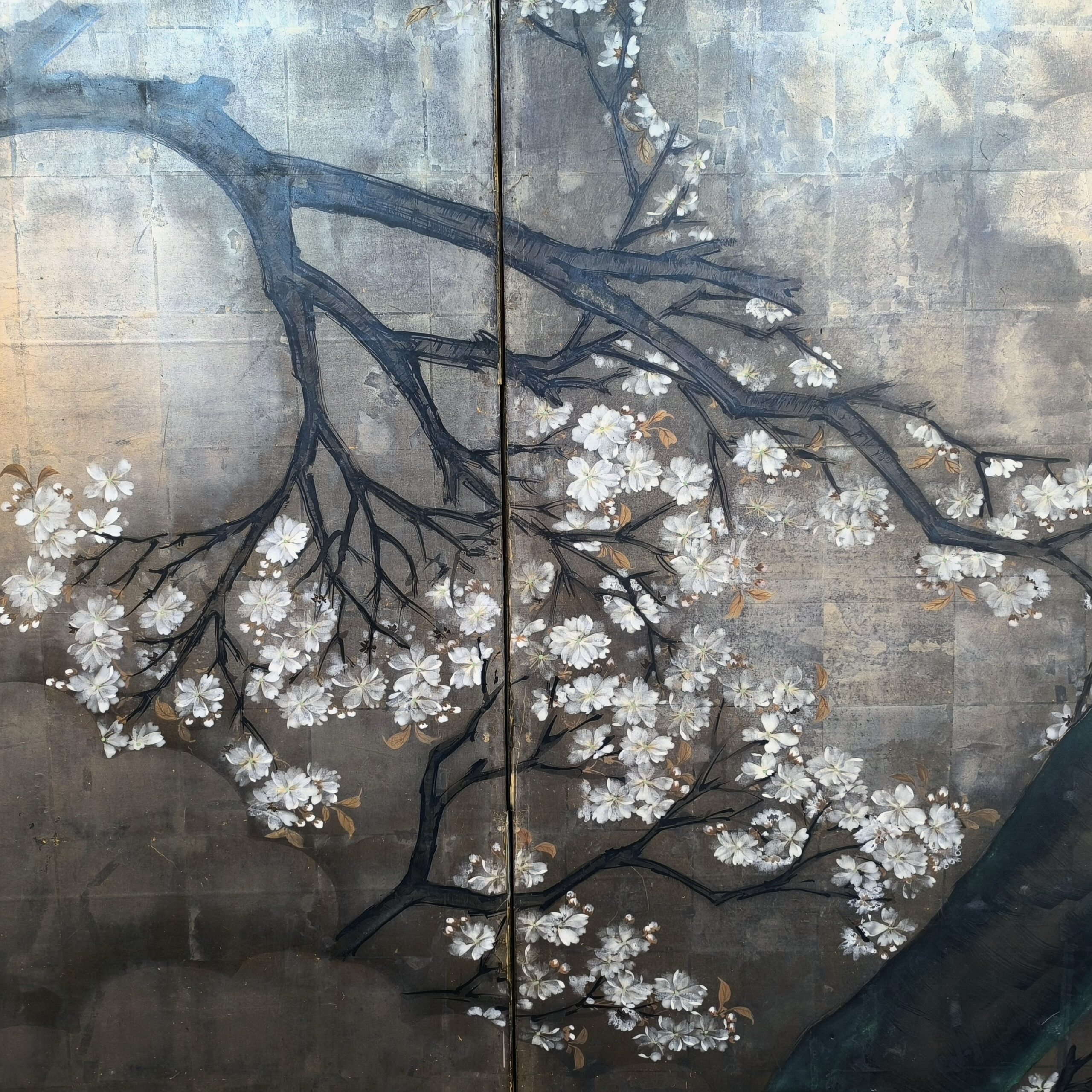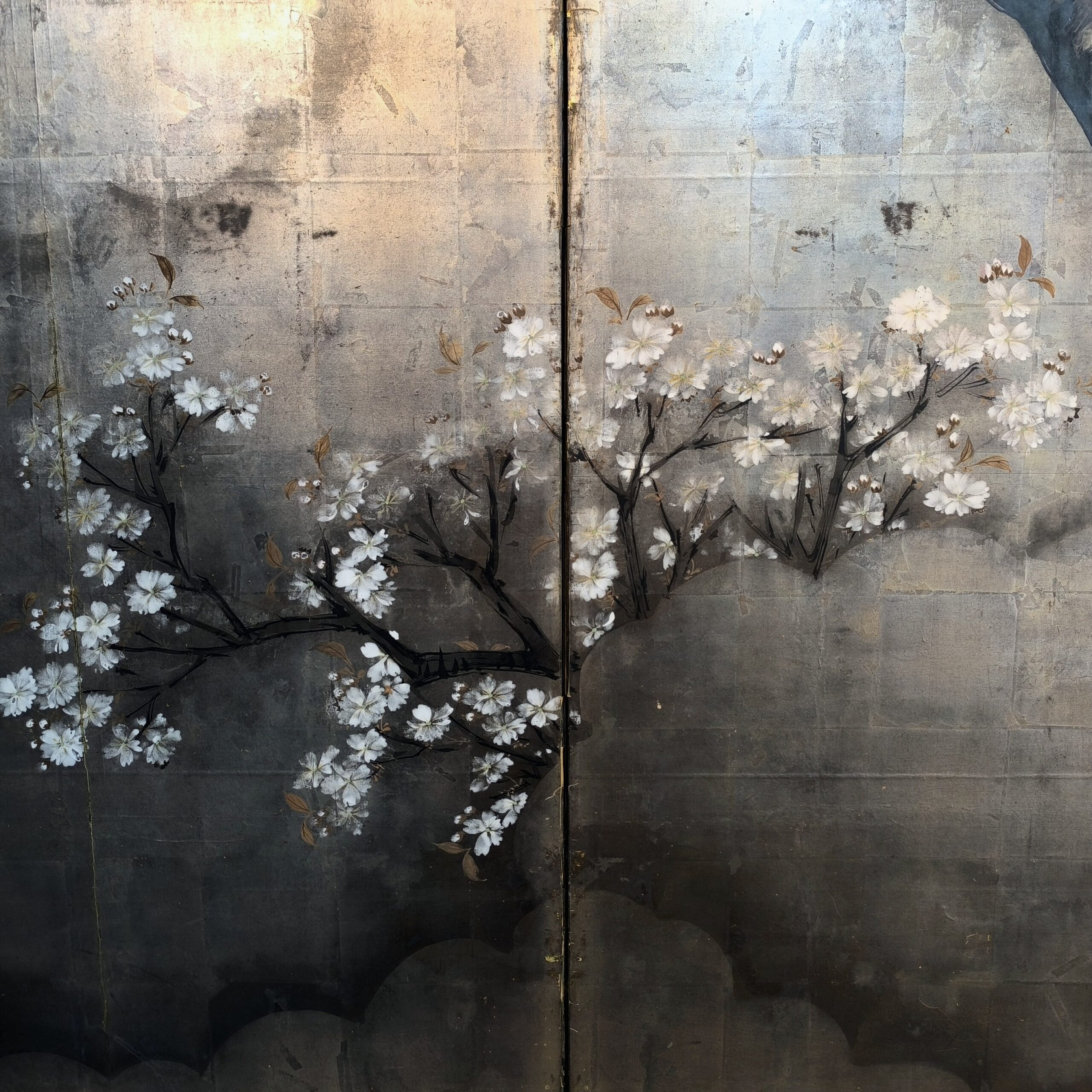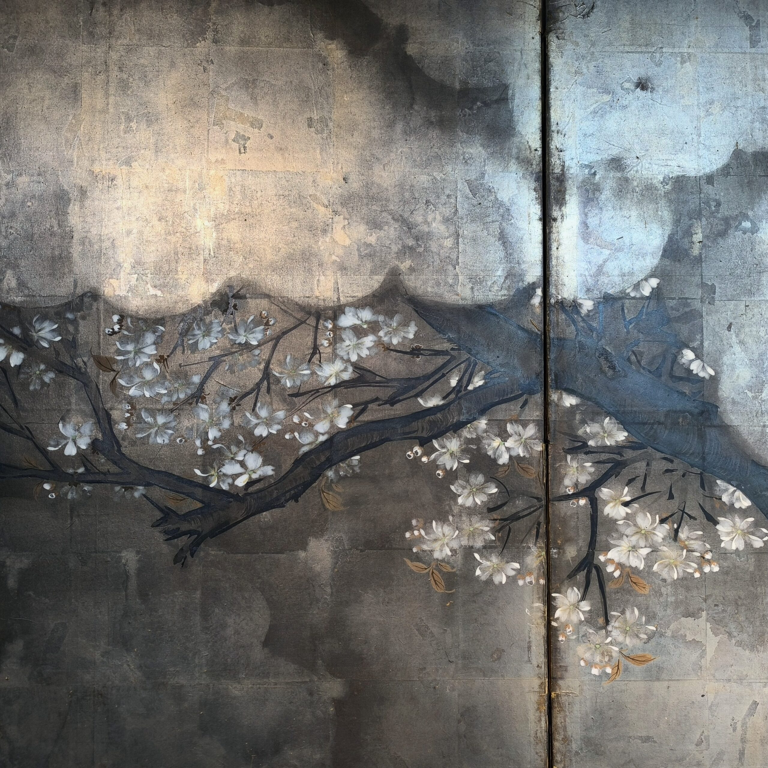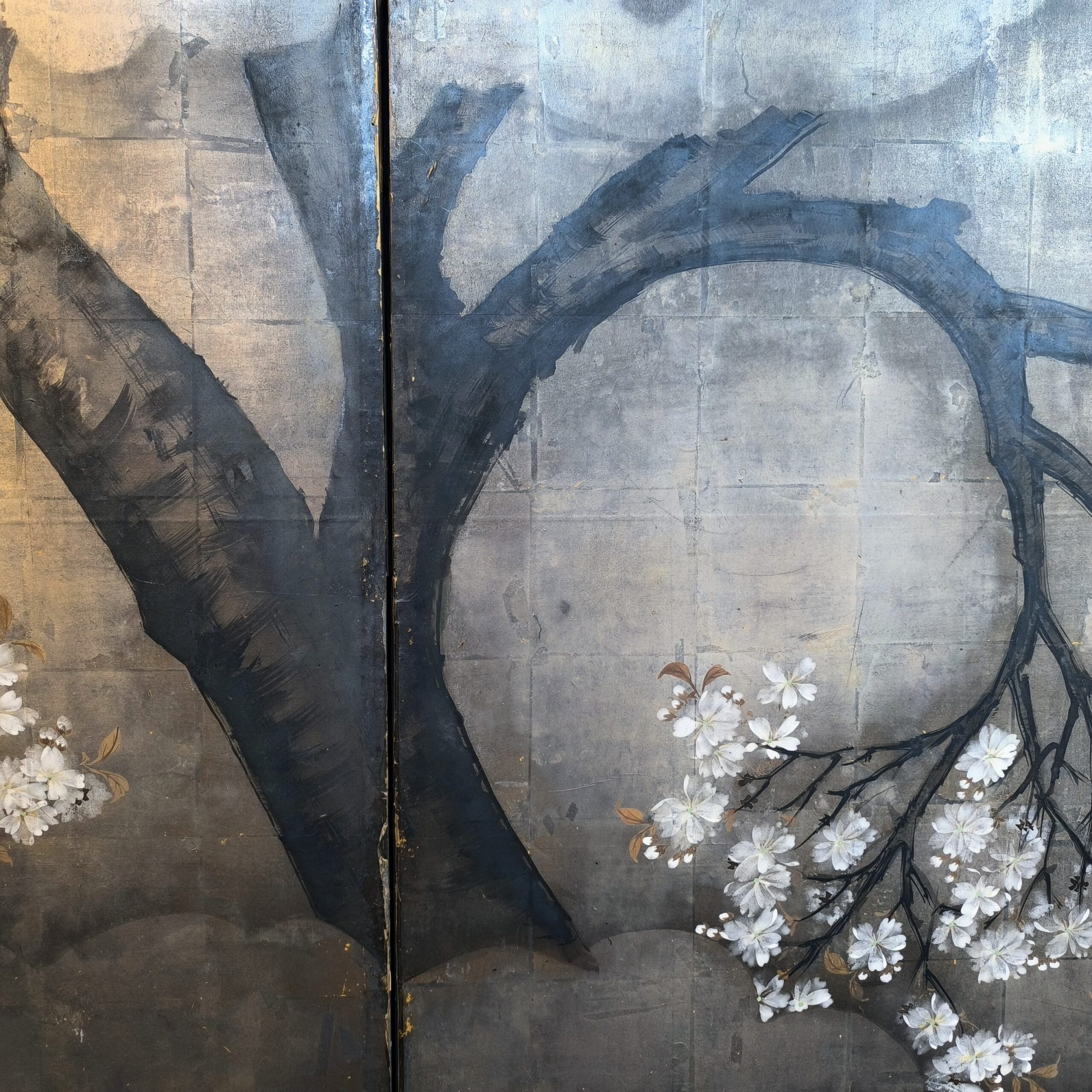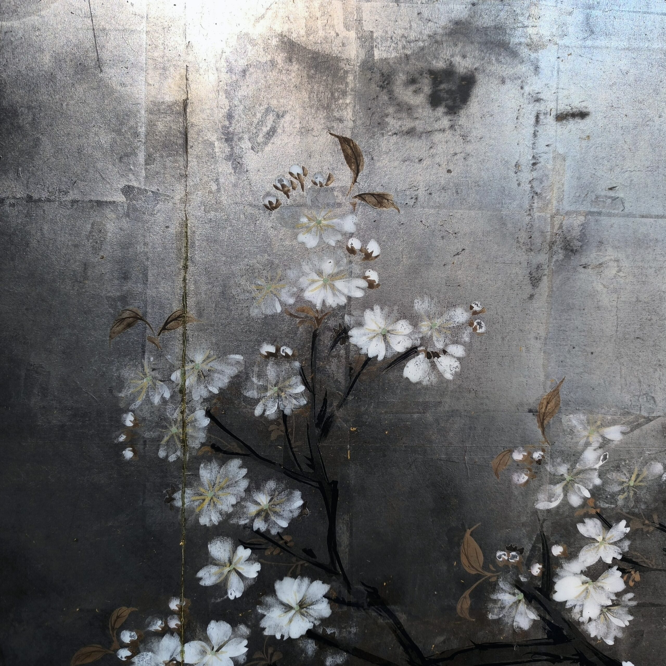 Silver-ground folding screens are relatively rare; the silver leaf, weathered just right, creates a sense of quiet melancholy, and the large cherry tree glimpsed through the silver clouds lends the screen an air of both fantasy and mystery.