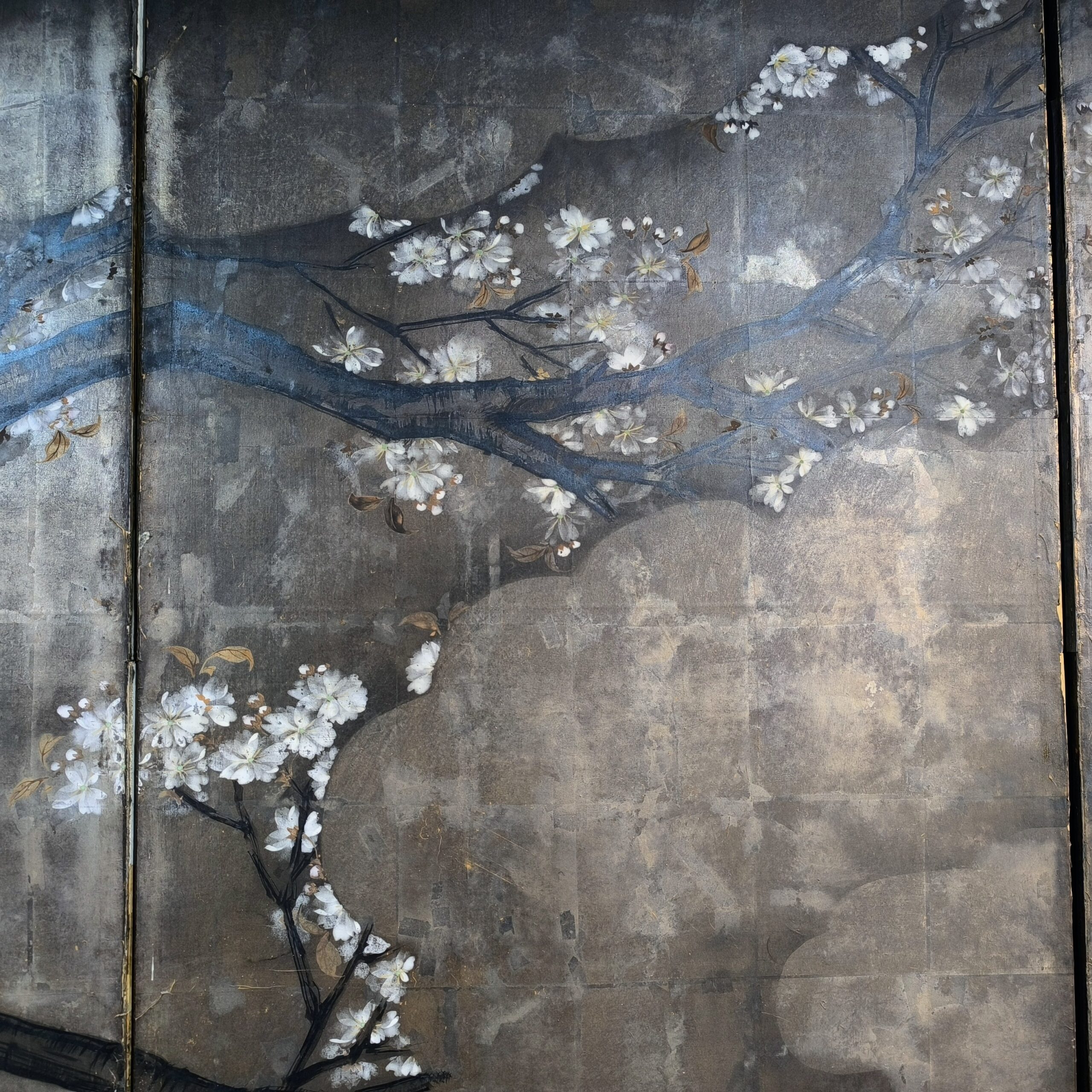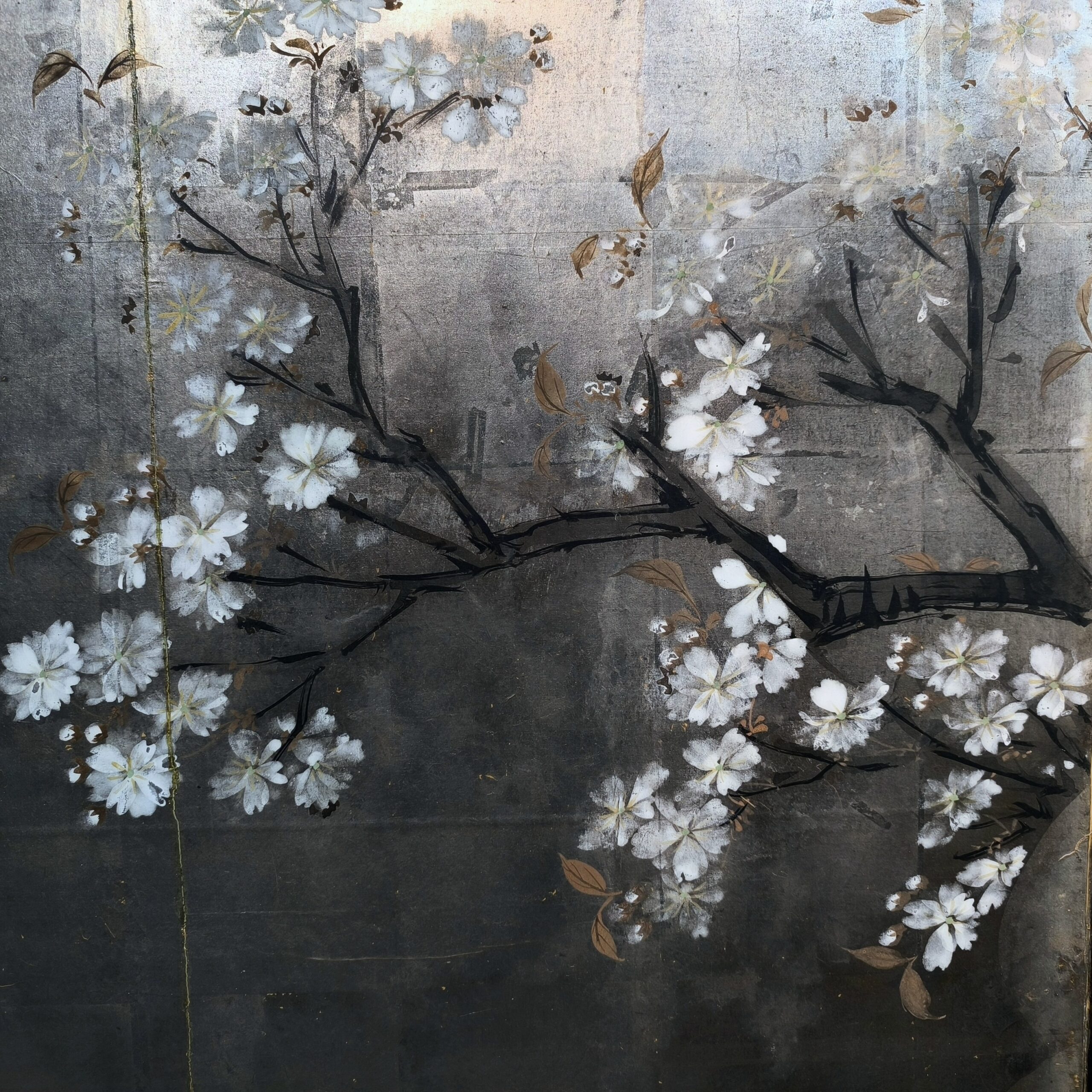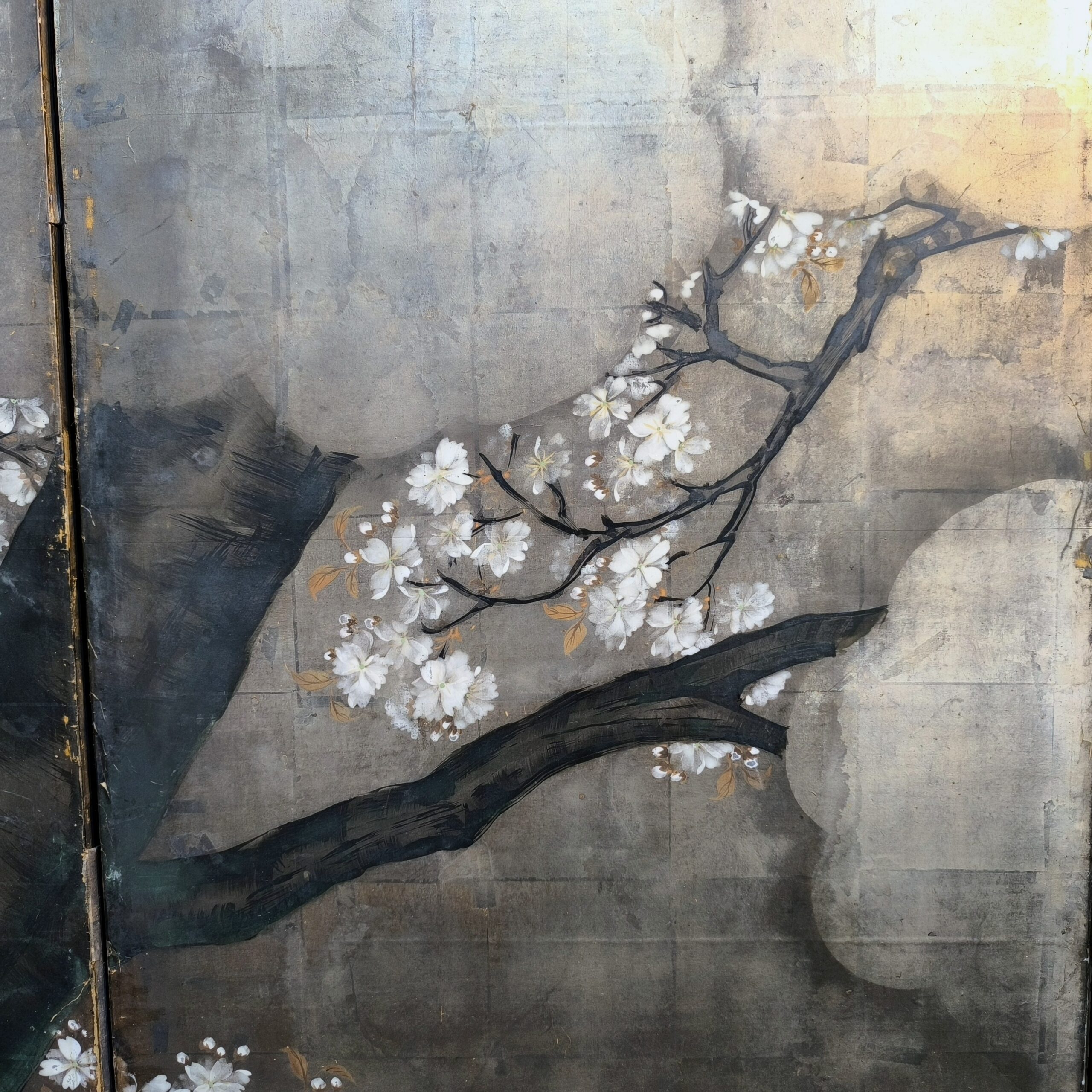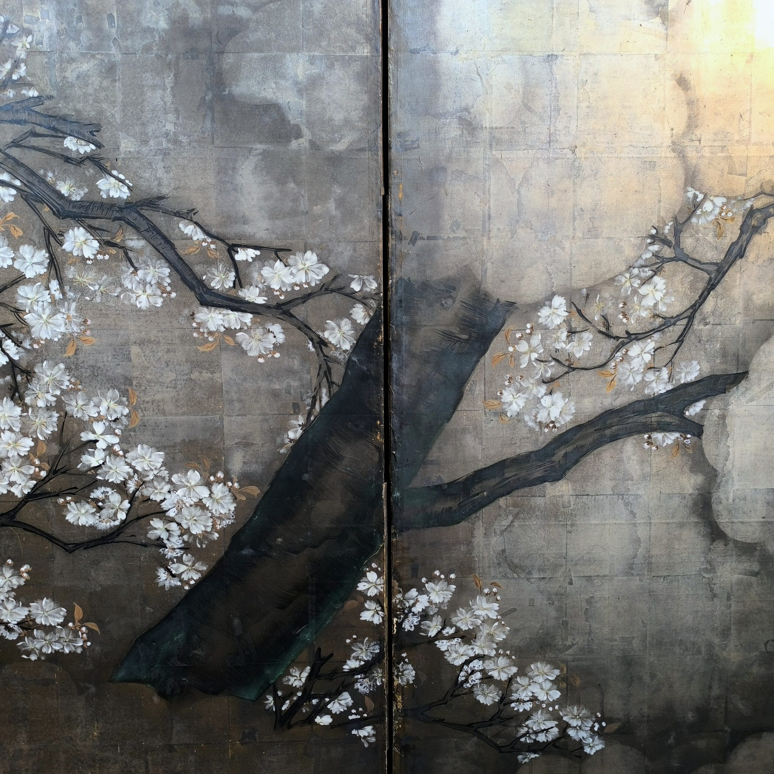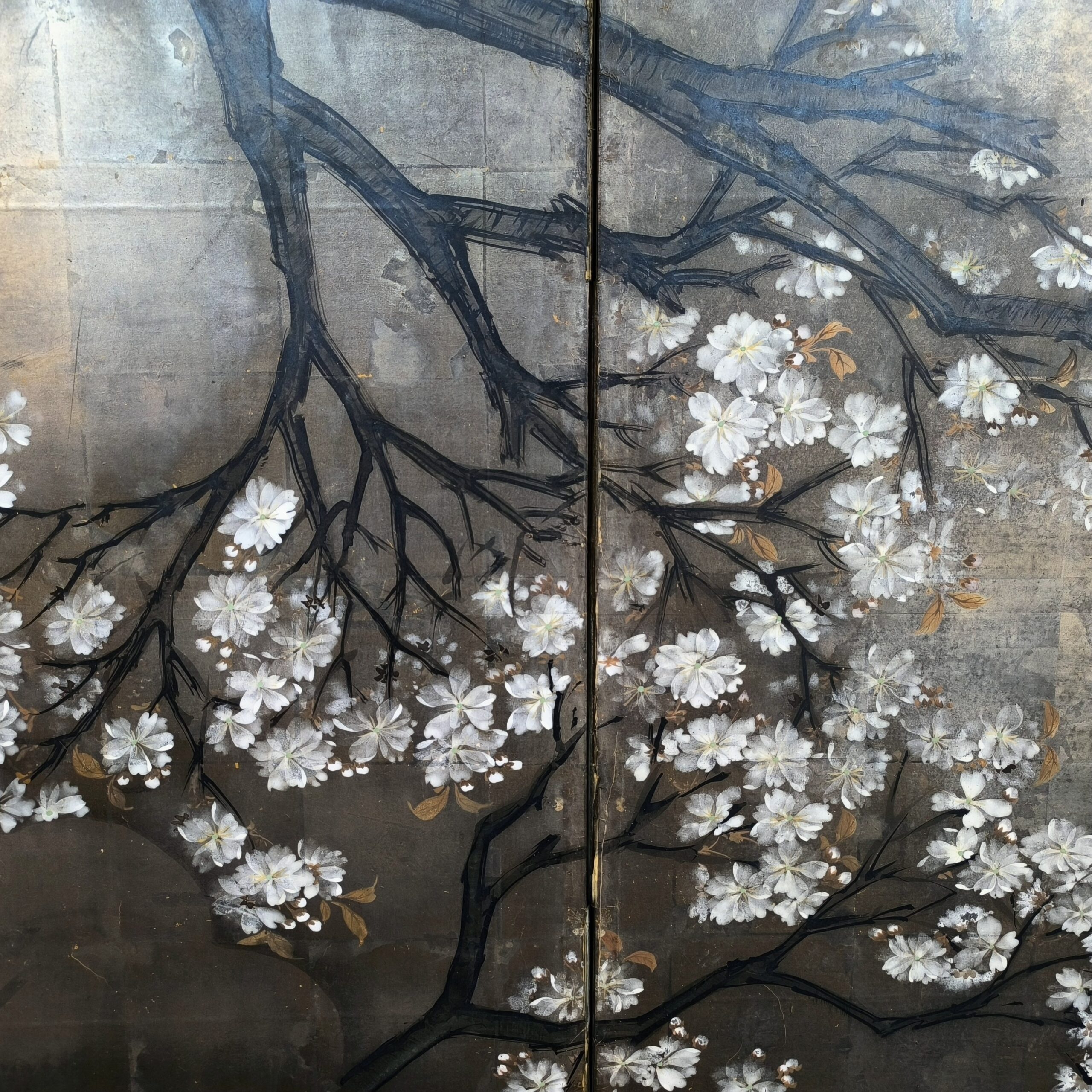 Silver-ground folding screens are relatively rare; the silver leaf, weathered just right, creates a sense of quiet melancholy, and the large cherry tree glimpsed through the silver clouds lends the screen an air of both fantasy and mystery.
