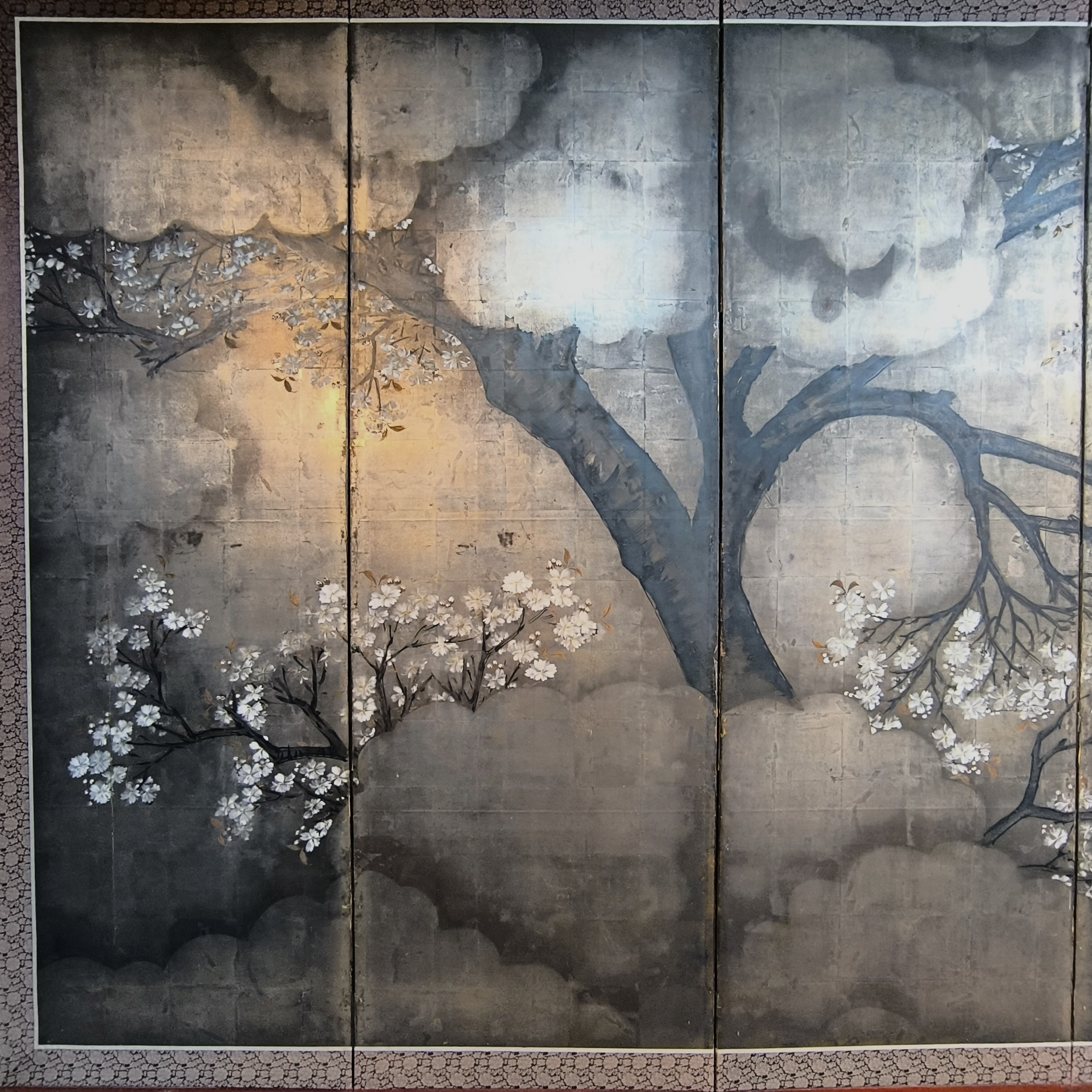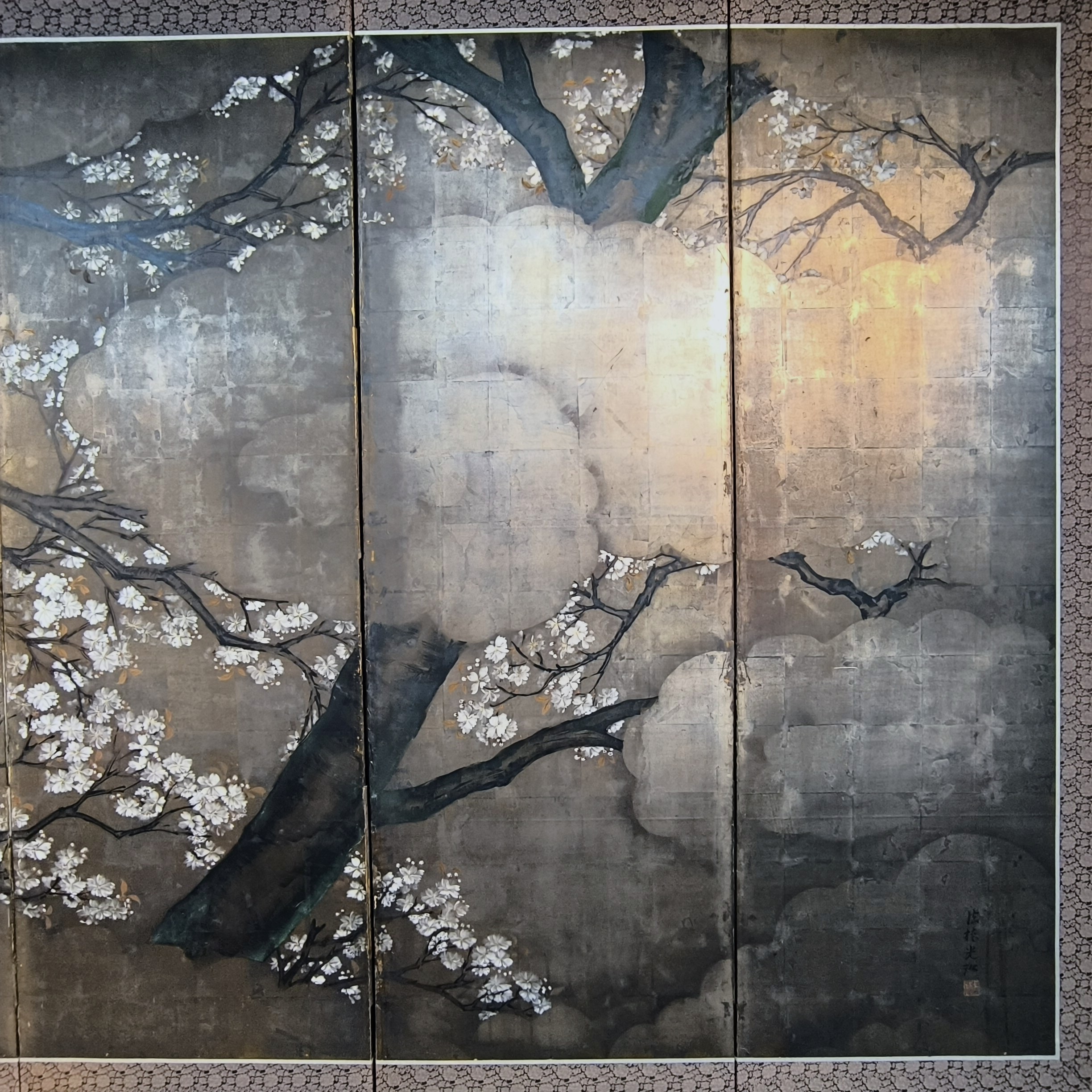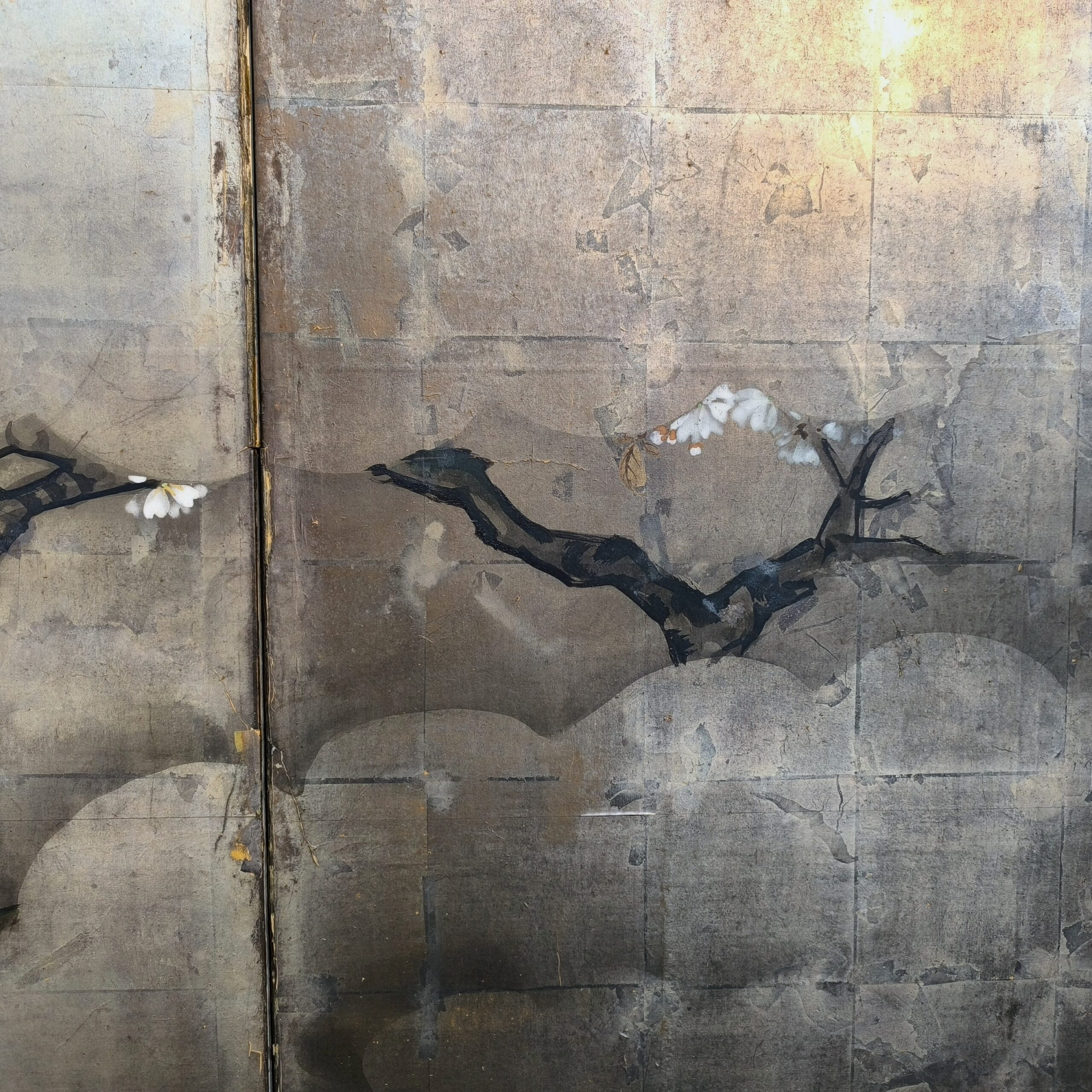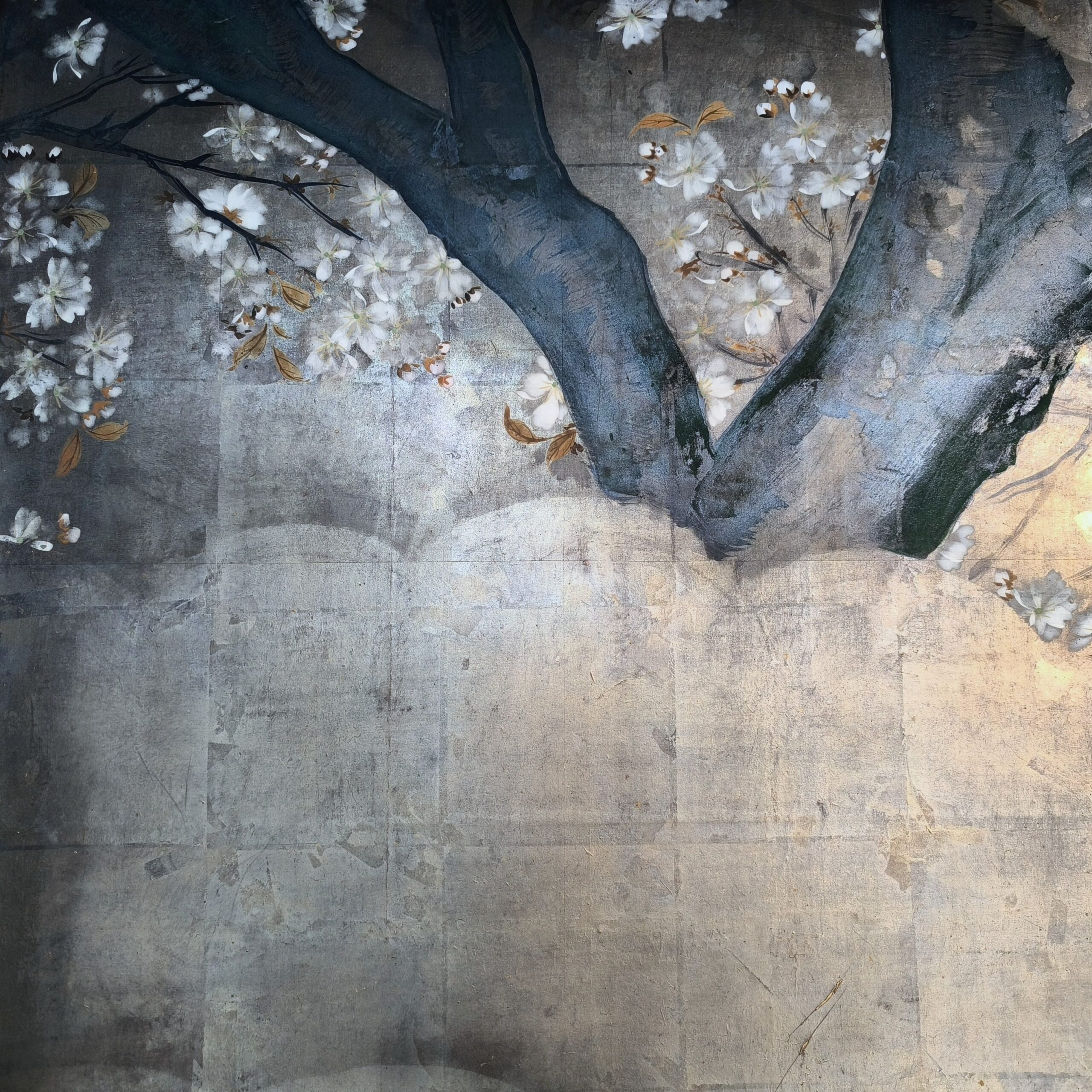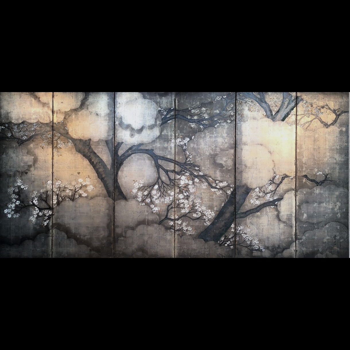 Silver-ground folding screens are relatively rare; the silver leaf, weathered just right, creates a sense of quiet melancholy, and the large cherry tree glimpsed through the silver clouds lends the screen an air of both fantasy and mystery.
