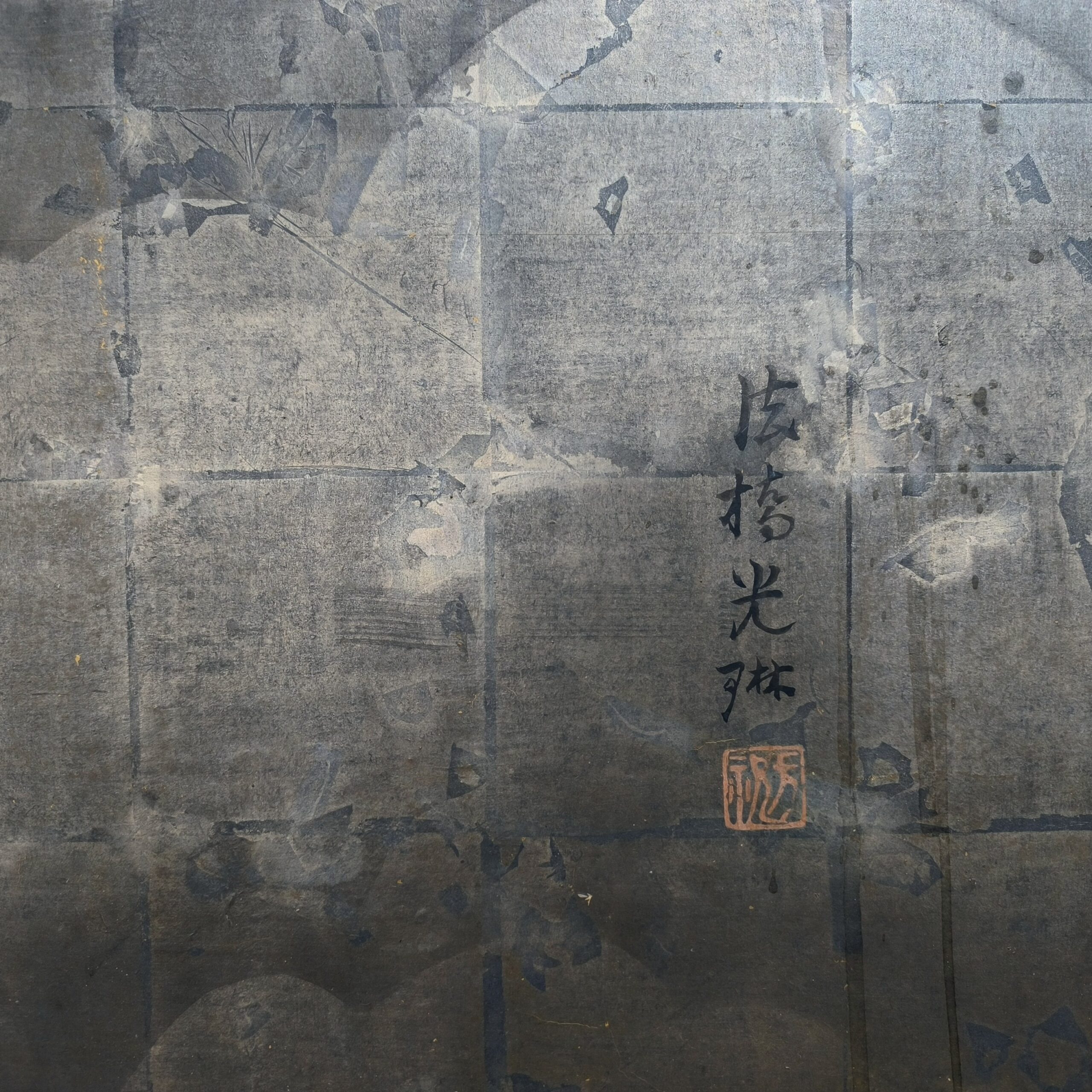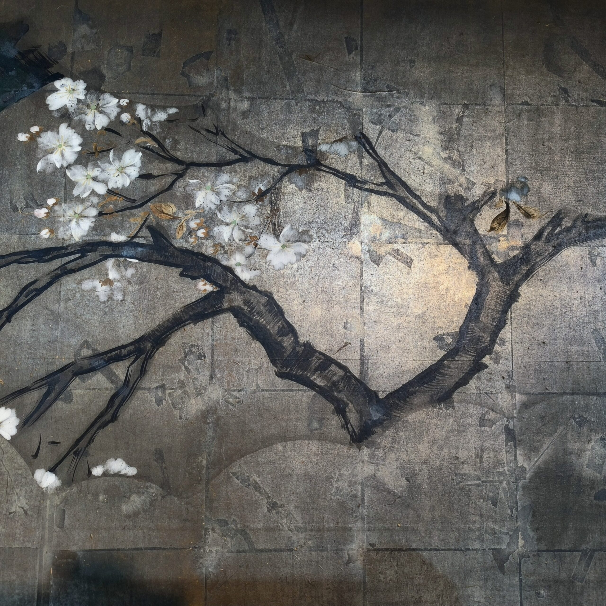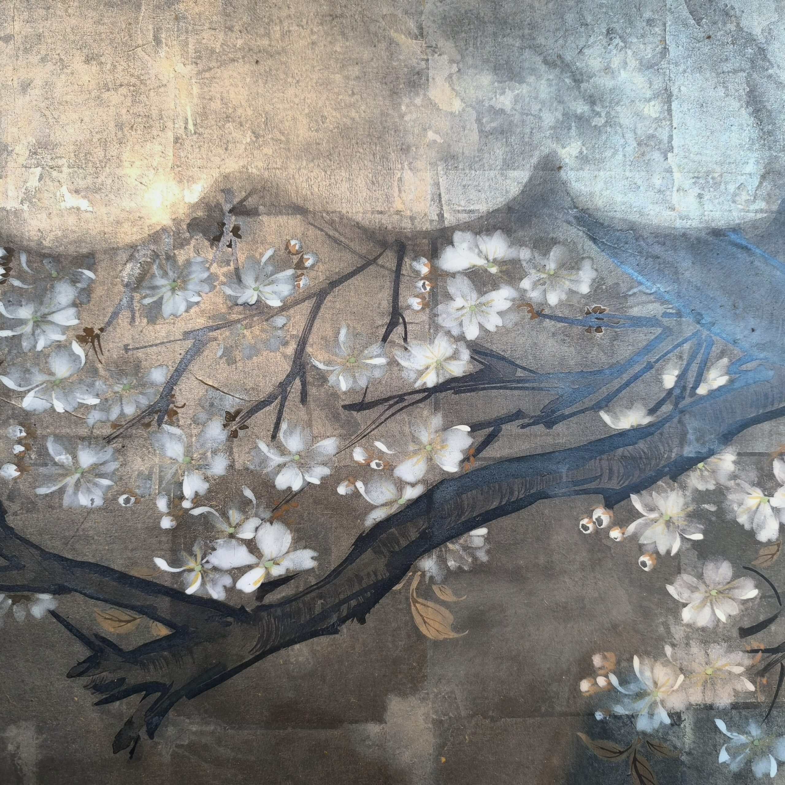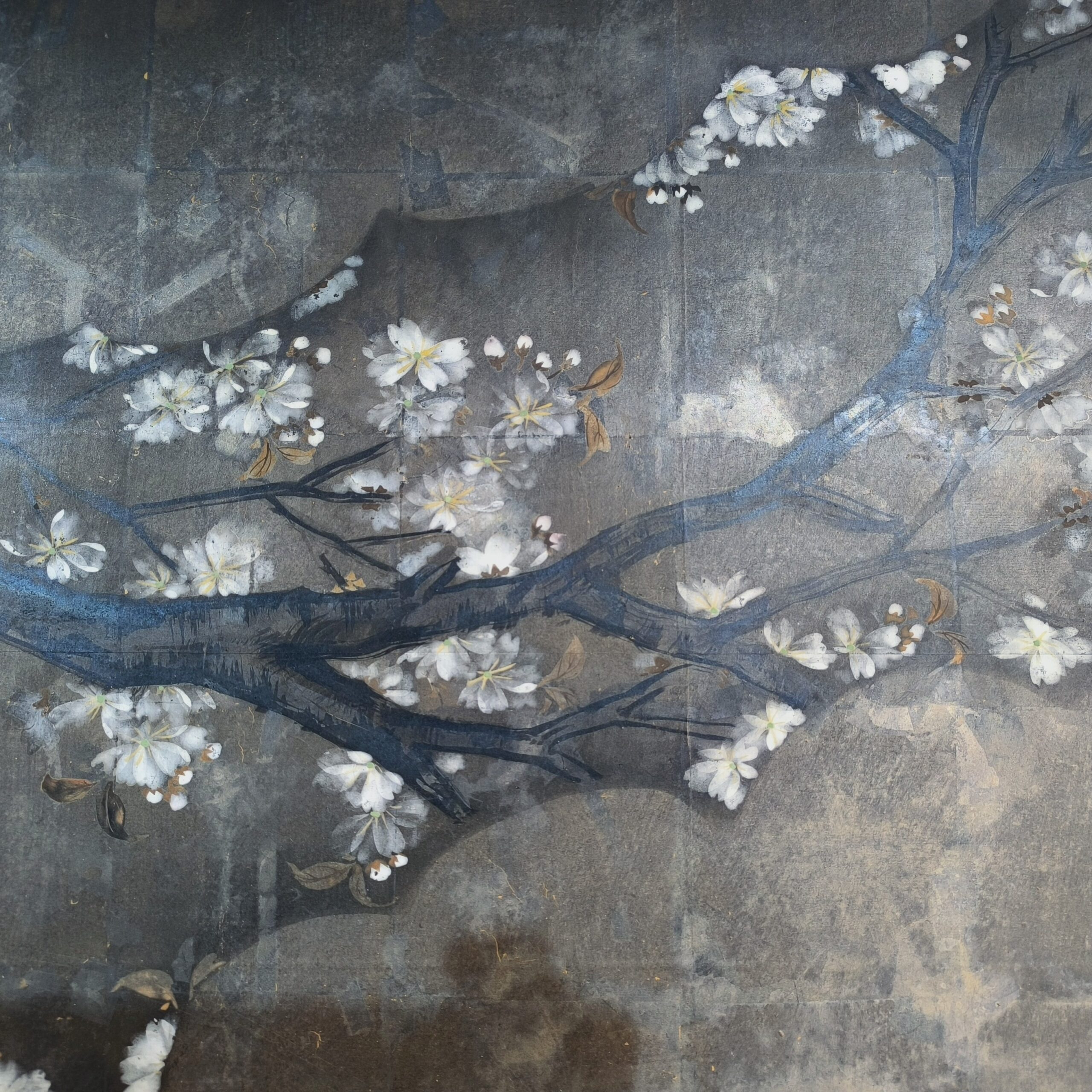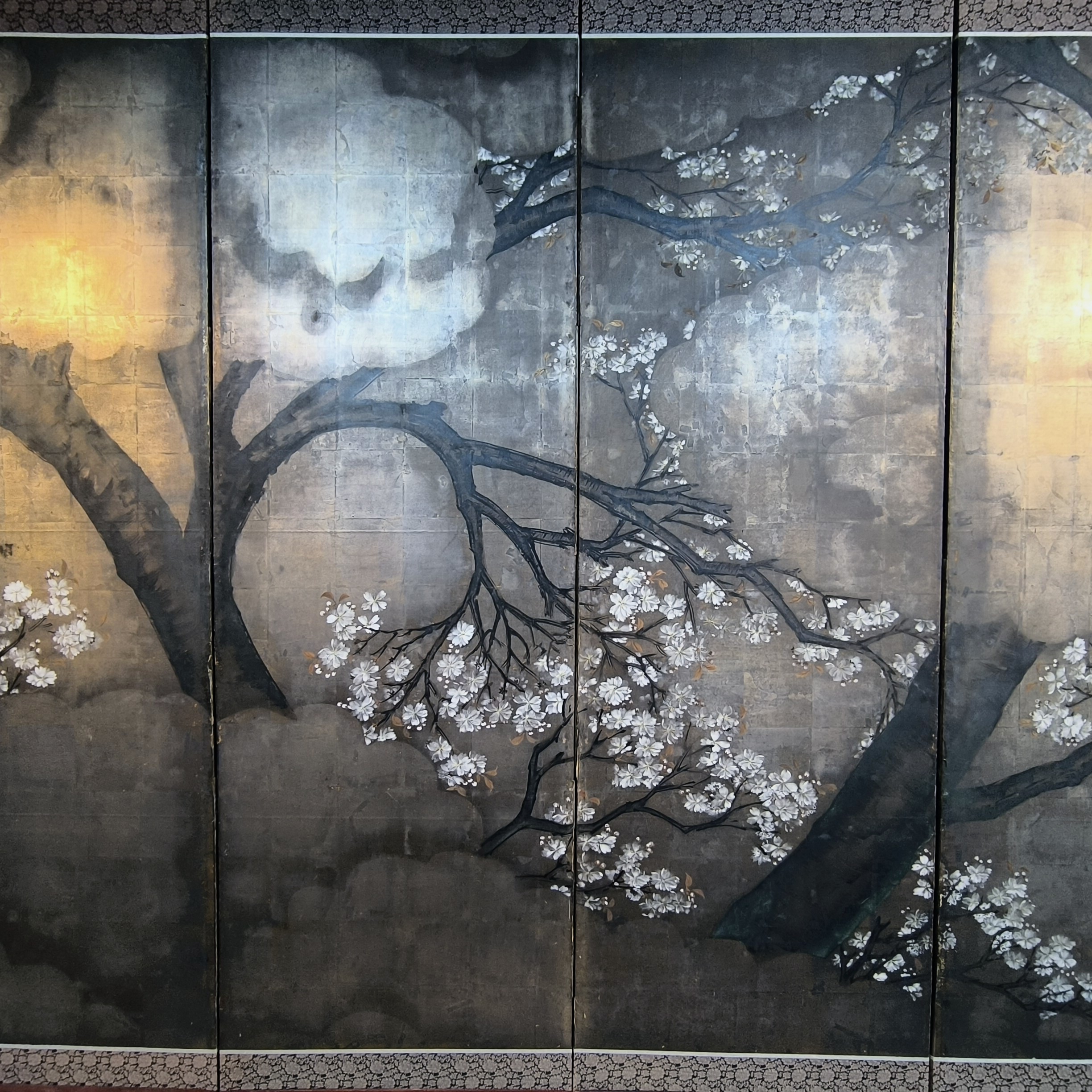 Silver-ground folding screens are relatively rare; the silver leaf, weathered just right, creates a sense of quiet melancholy, and the large cherry tree glimpsed through the silver clouds lends the screen an air of both fantasy and mystery.