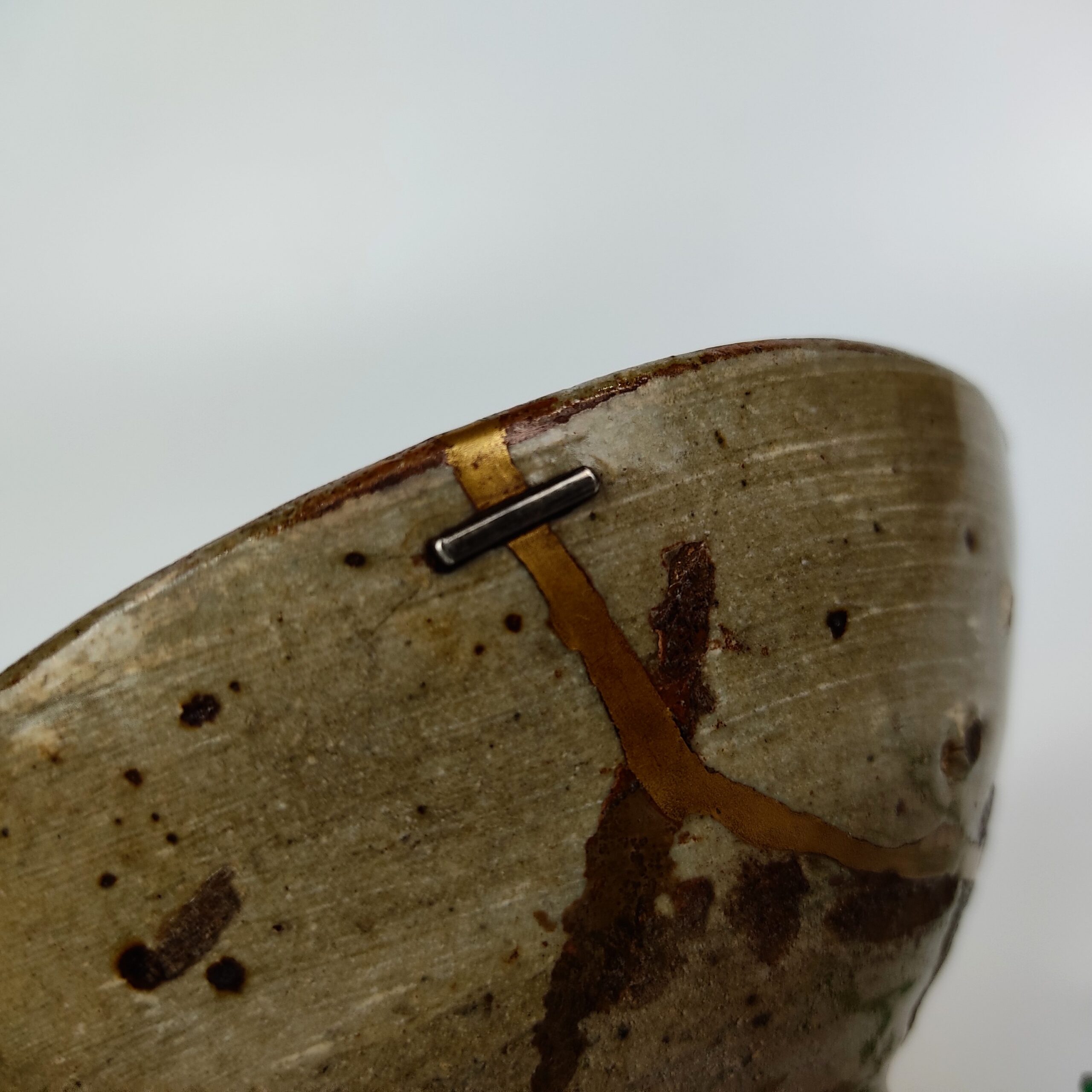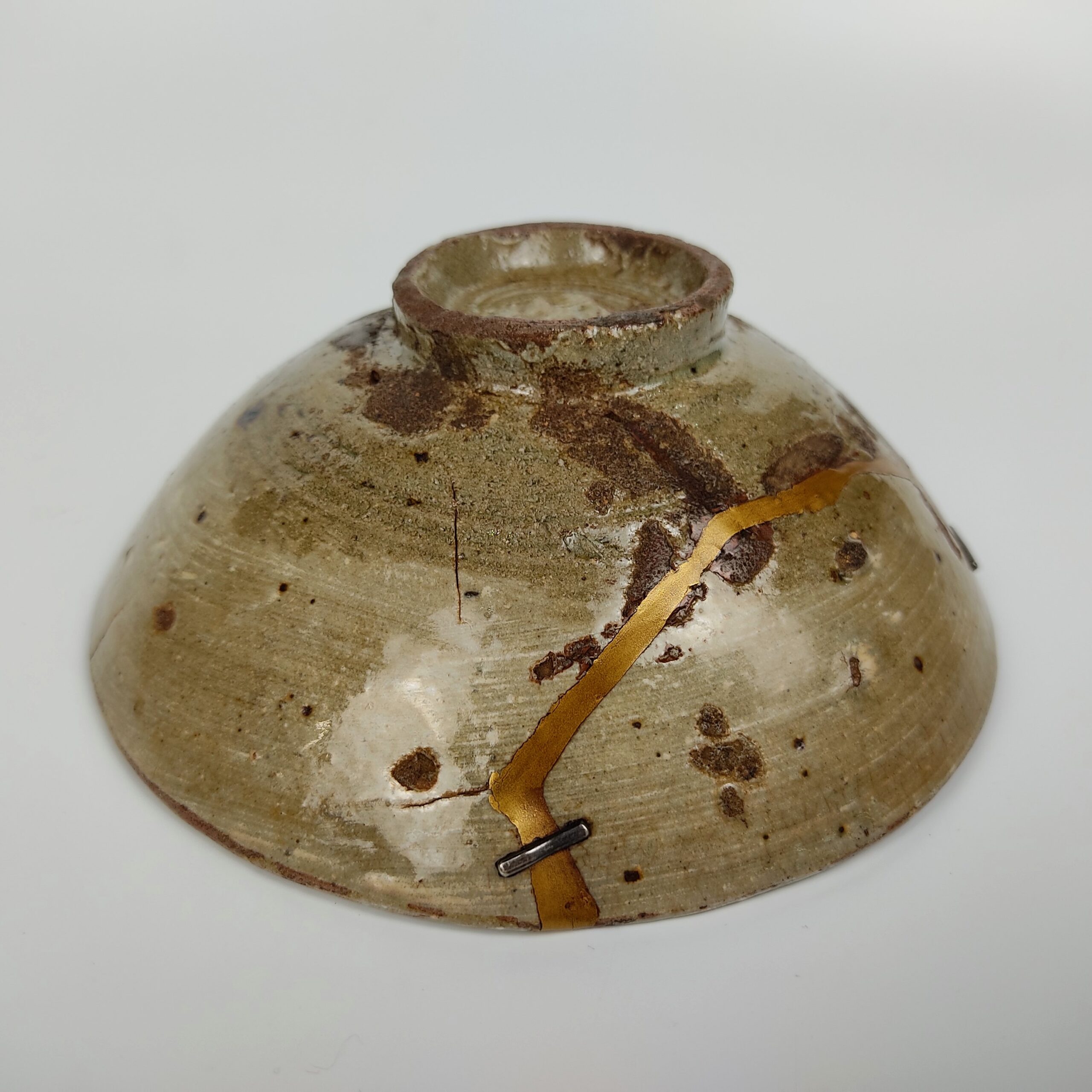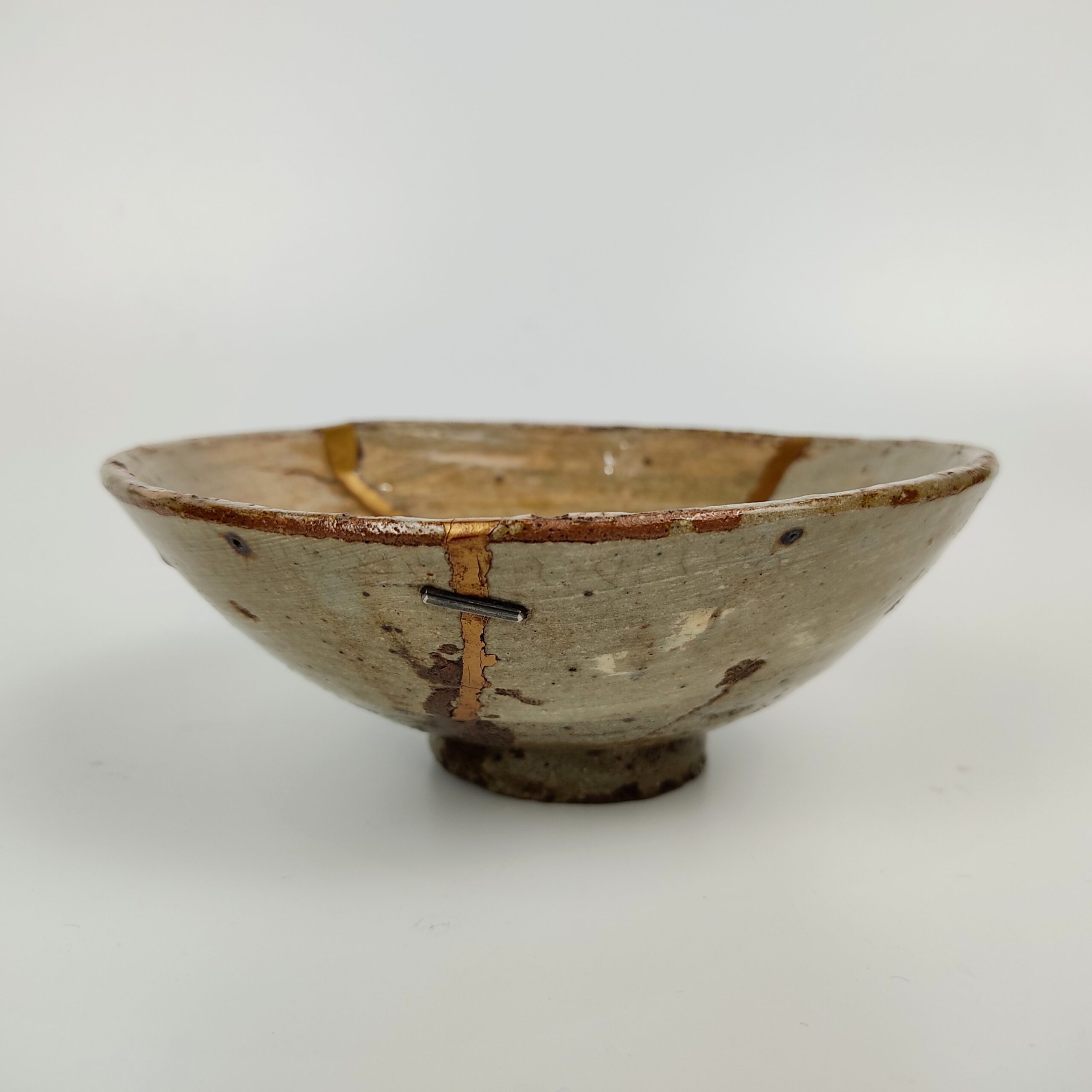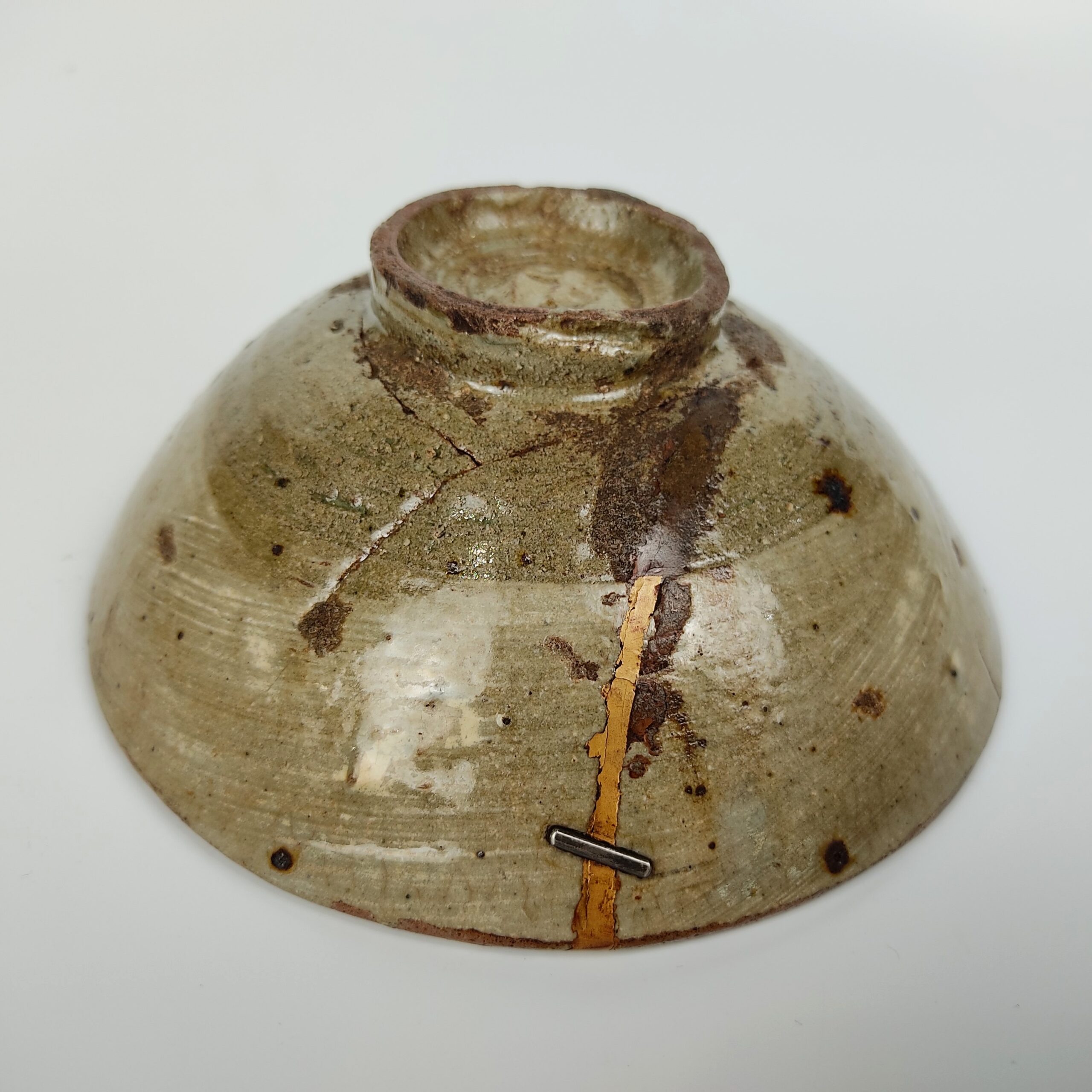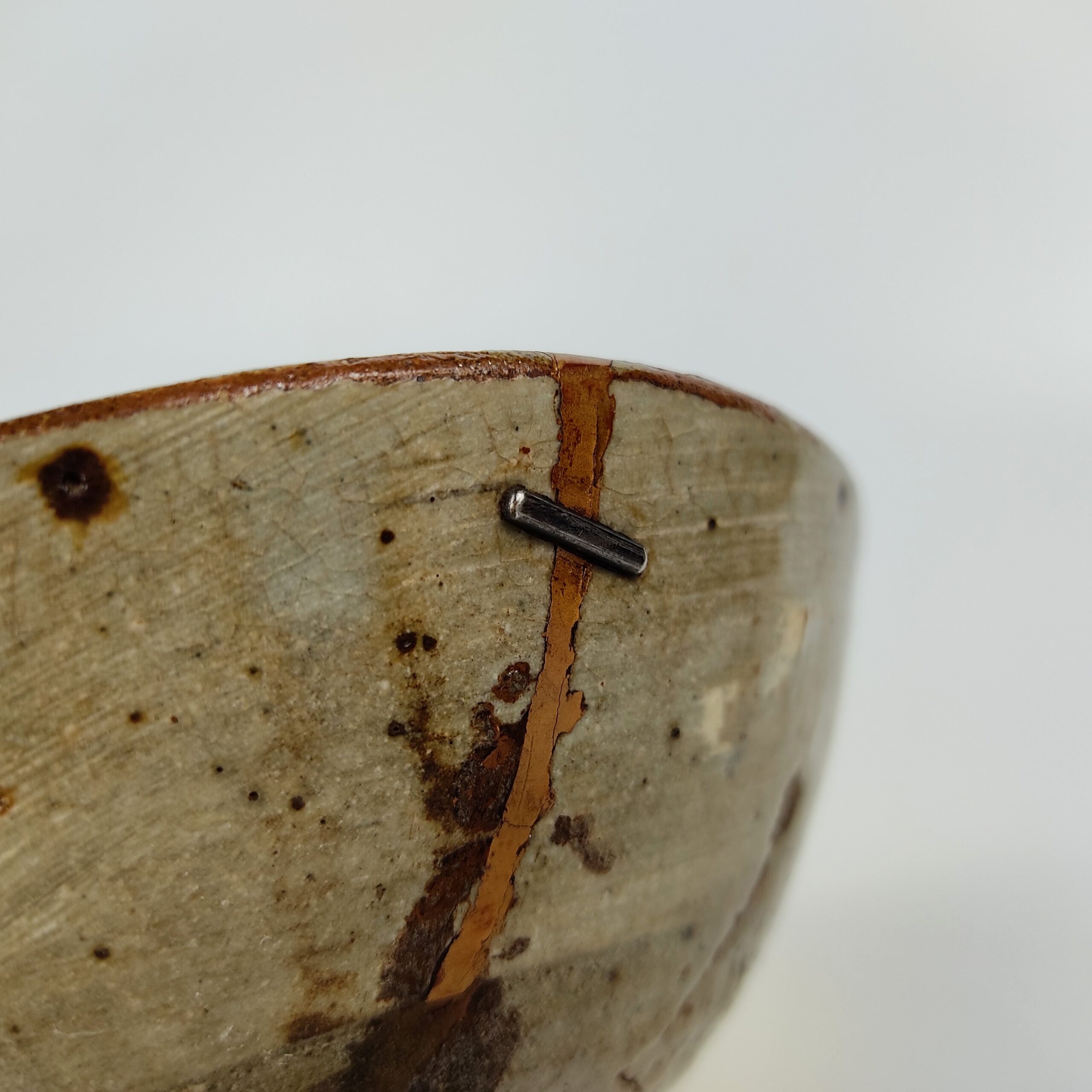 Korean antique pottery Hakeme tea bowl with gold lacquer repaired and silver clamp