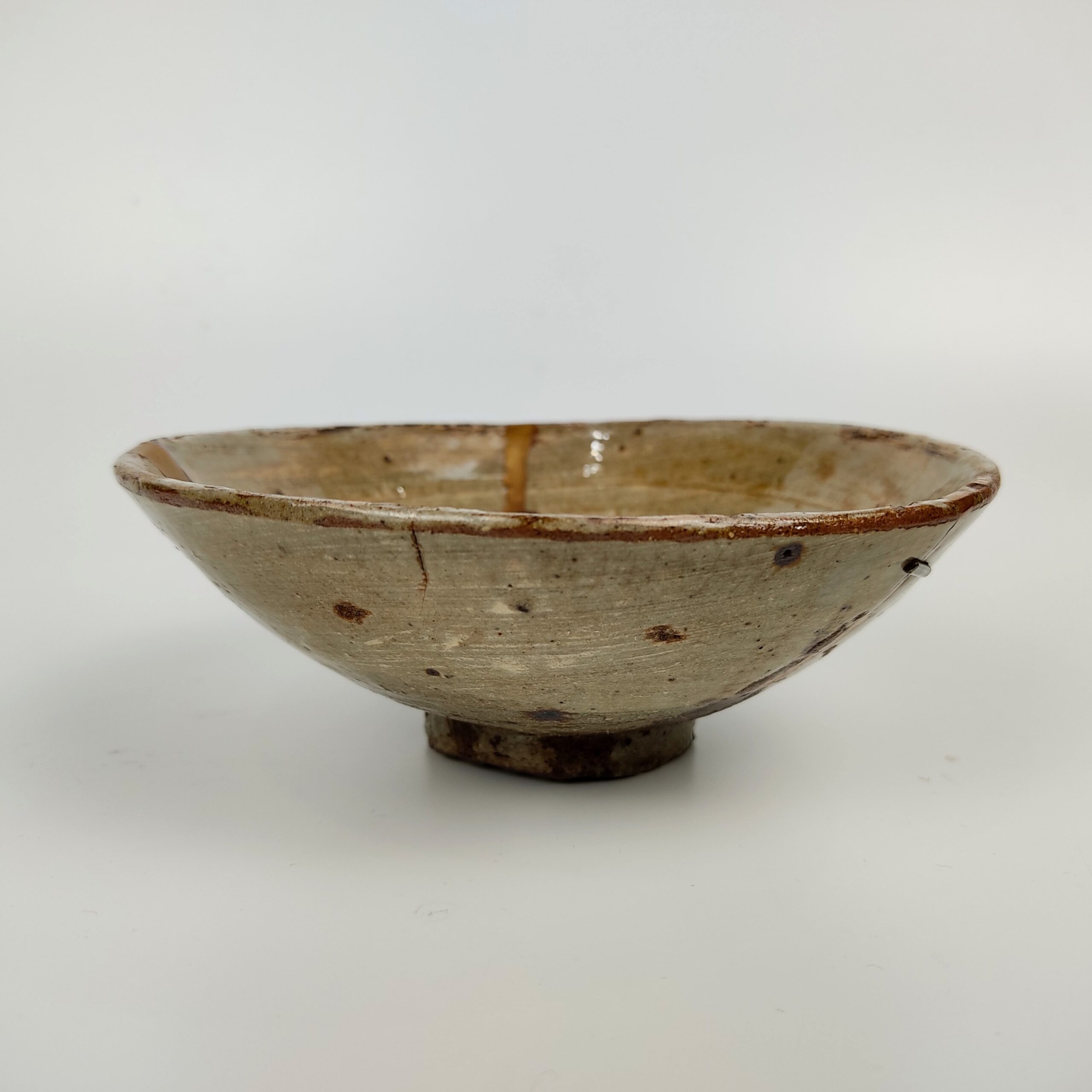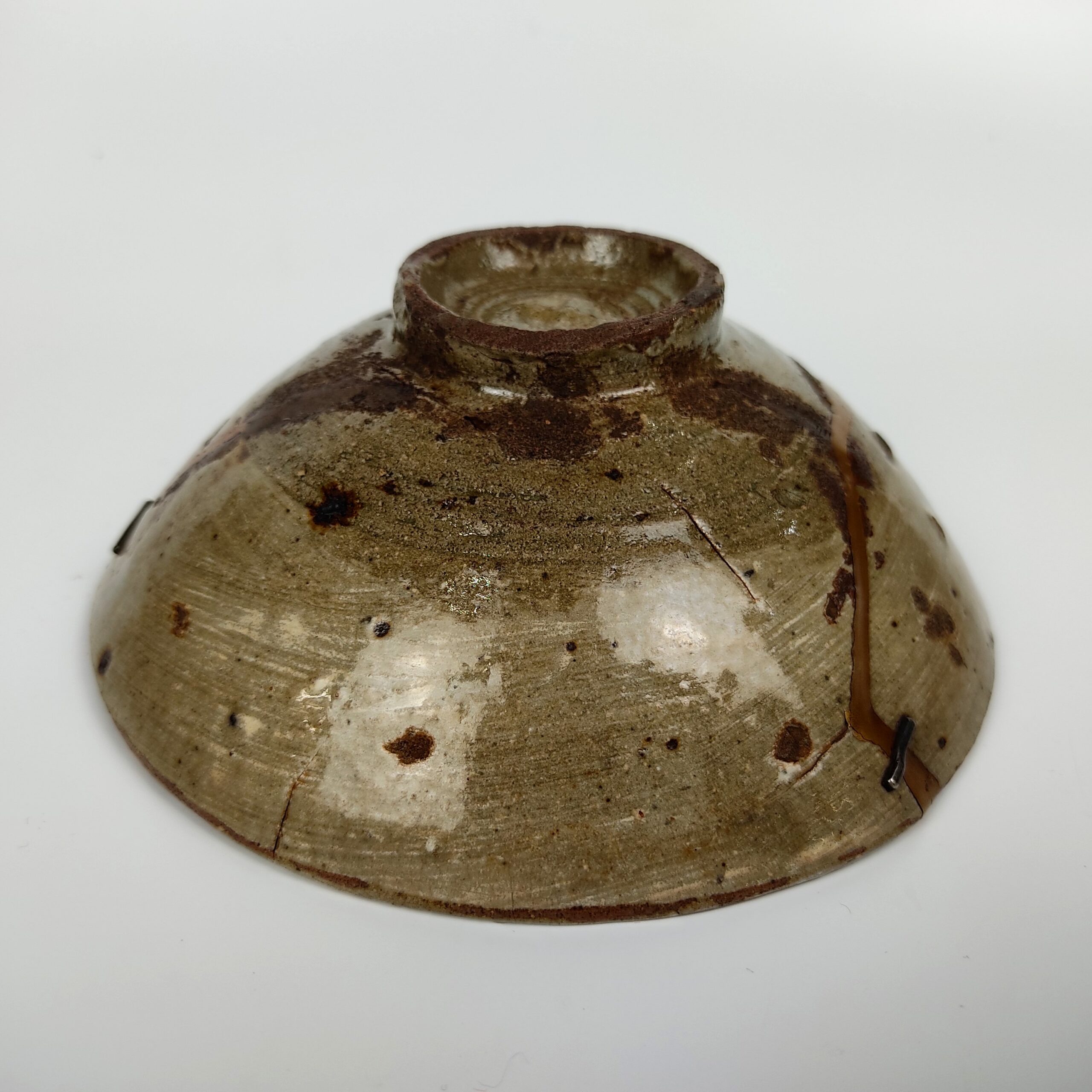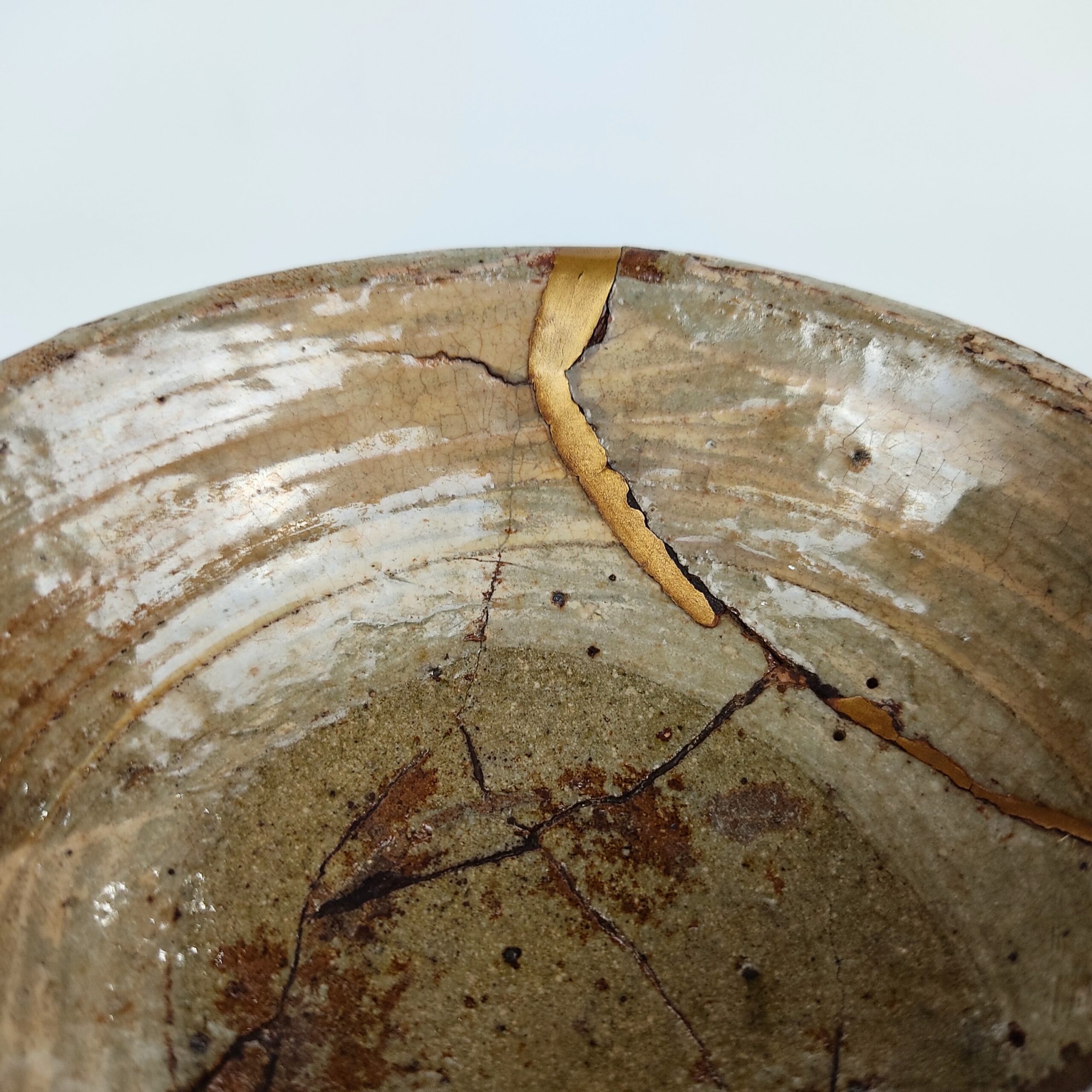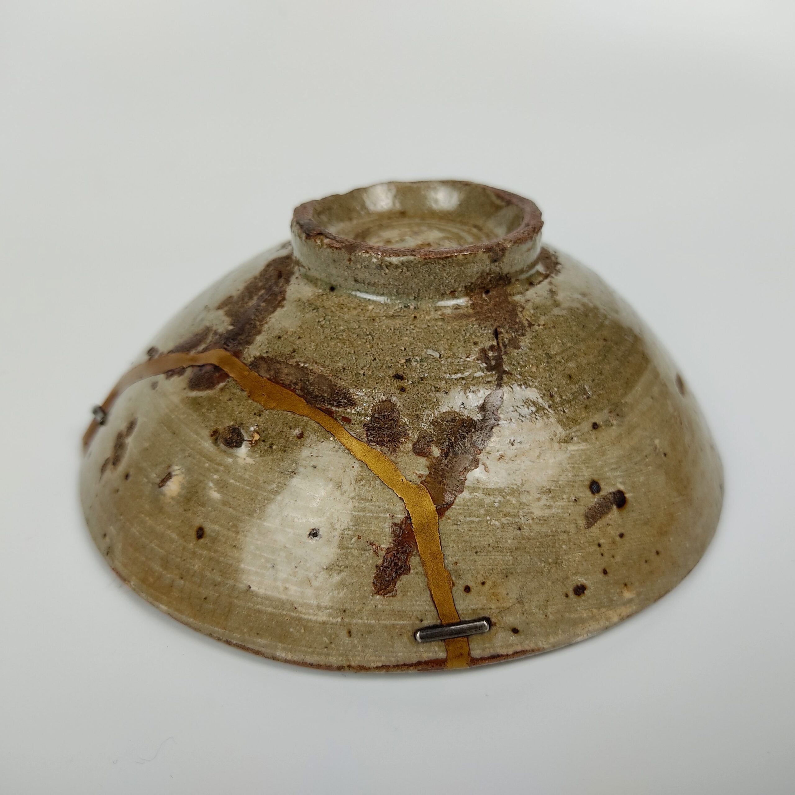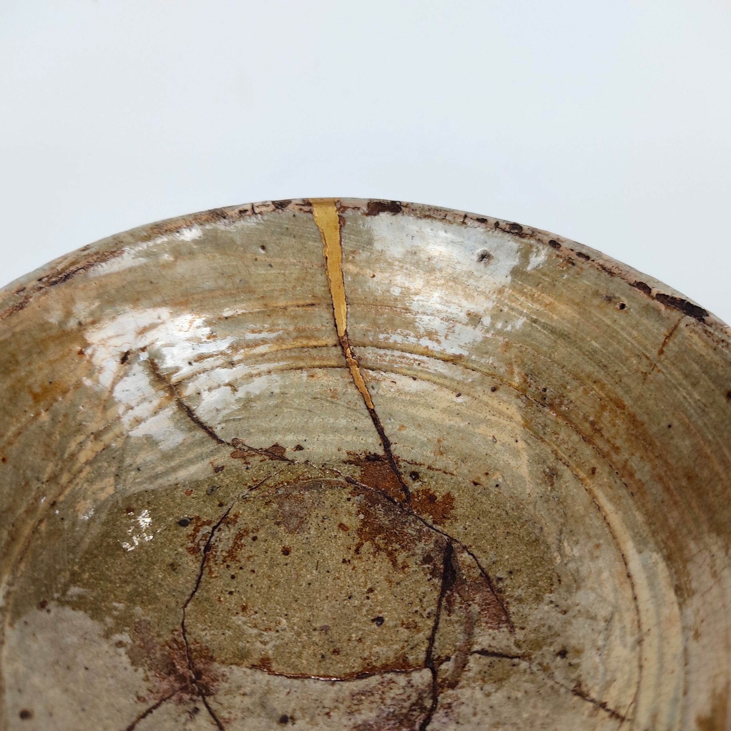 Korean antique pottery Hakeme tea bowl with gold lacquer repaired and silver clamp