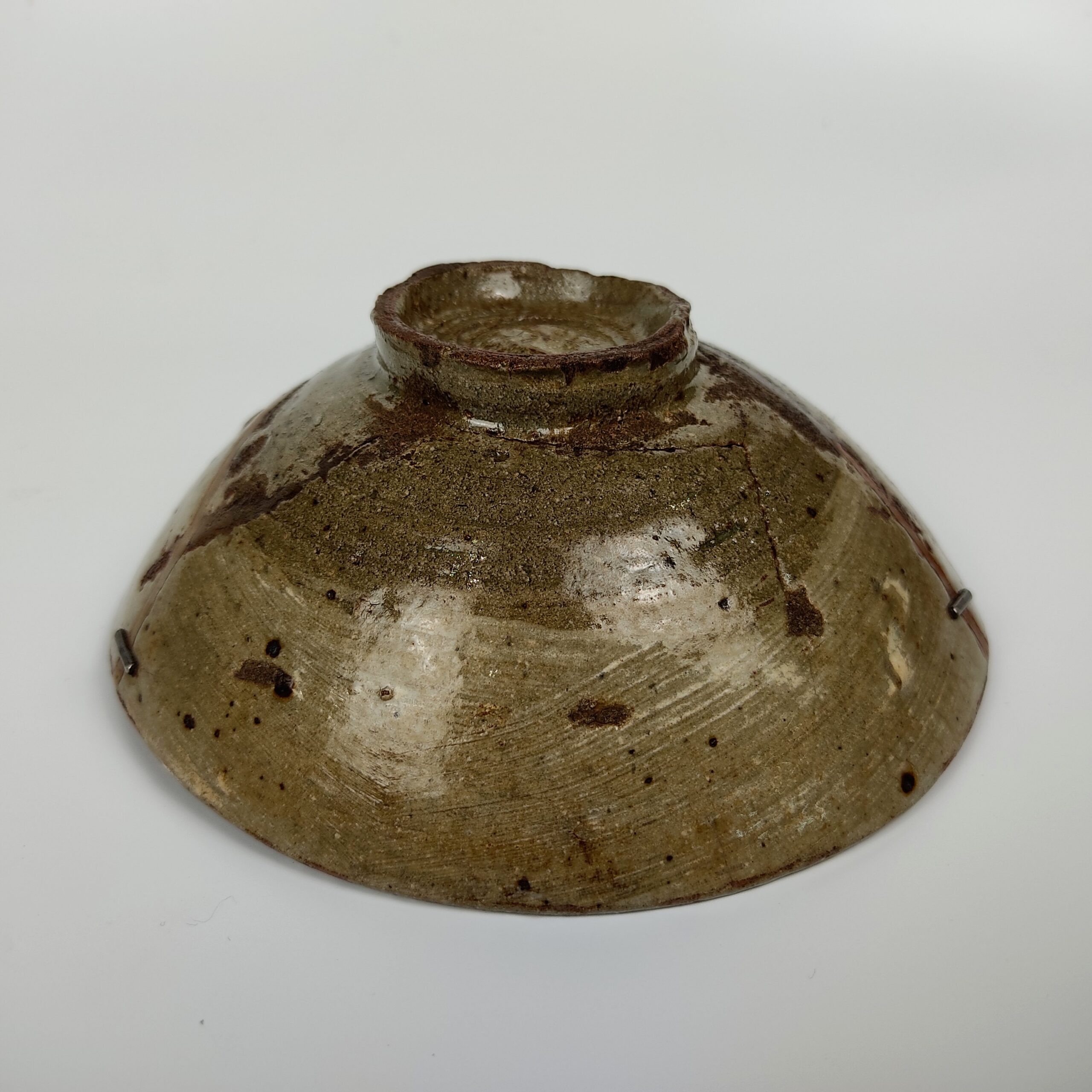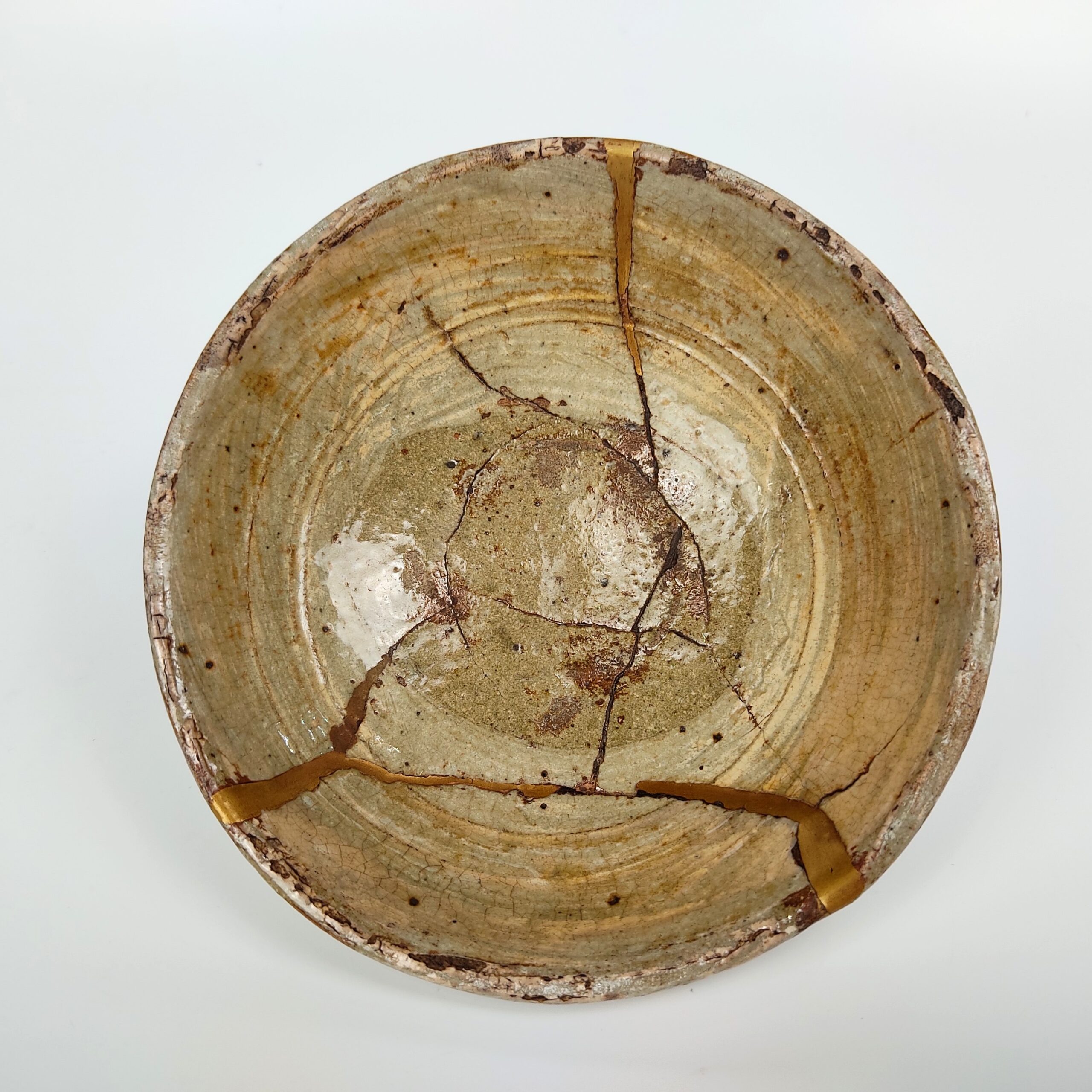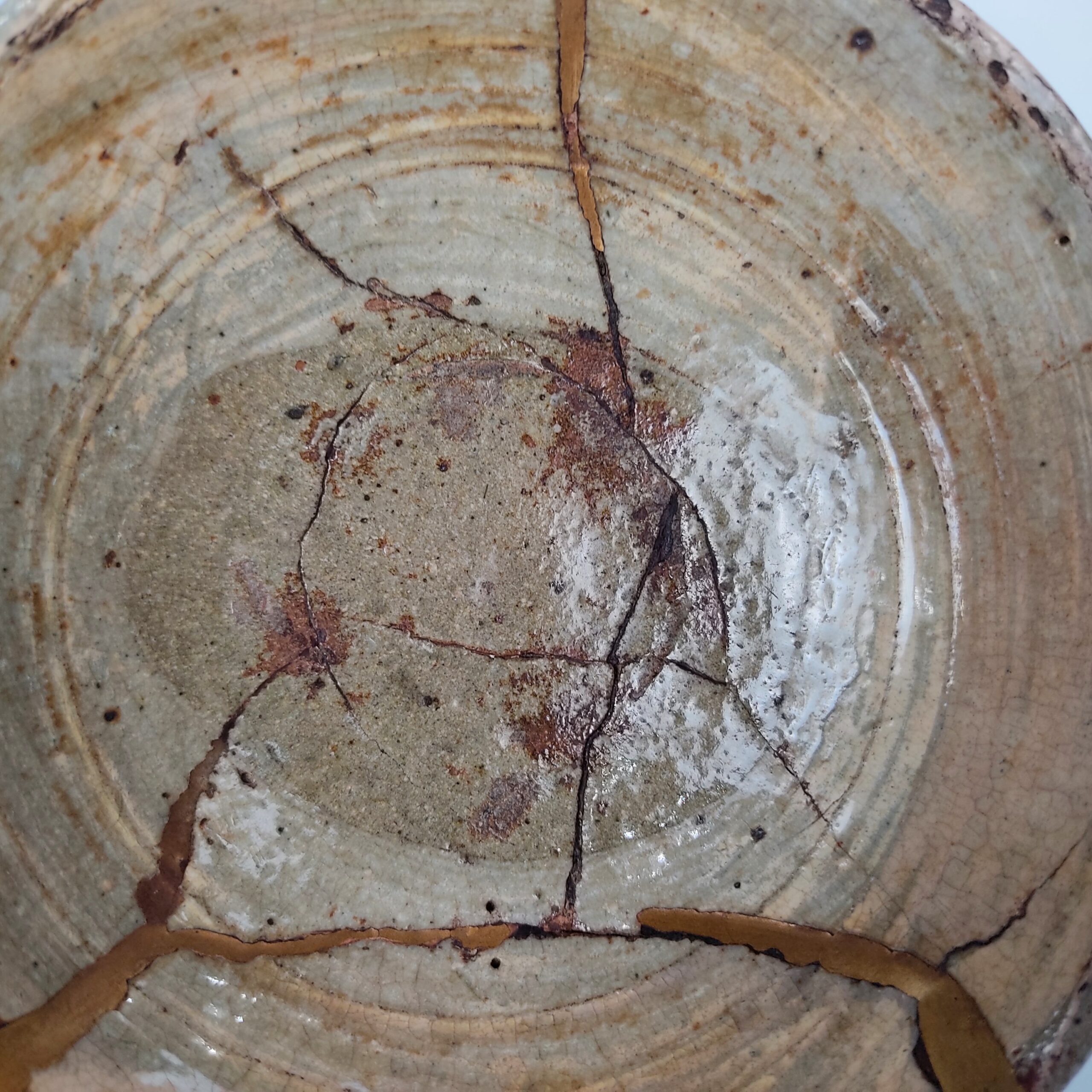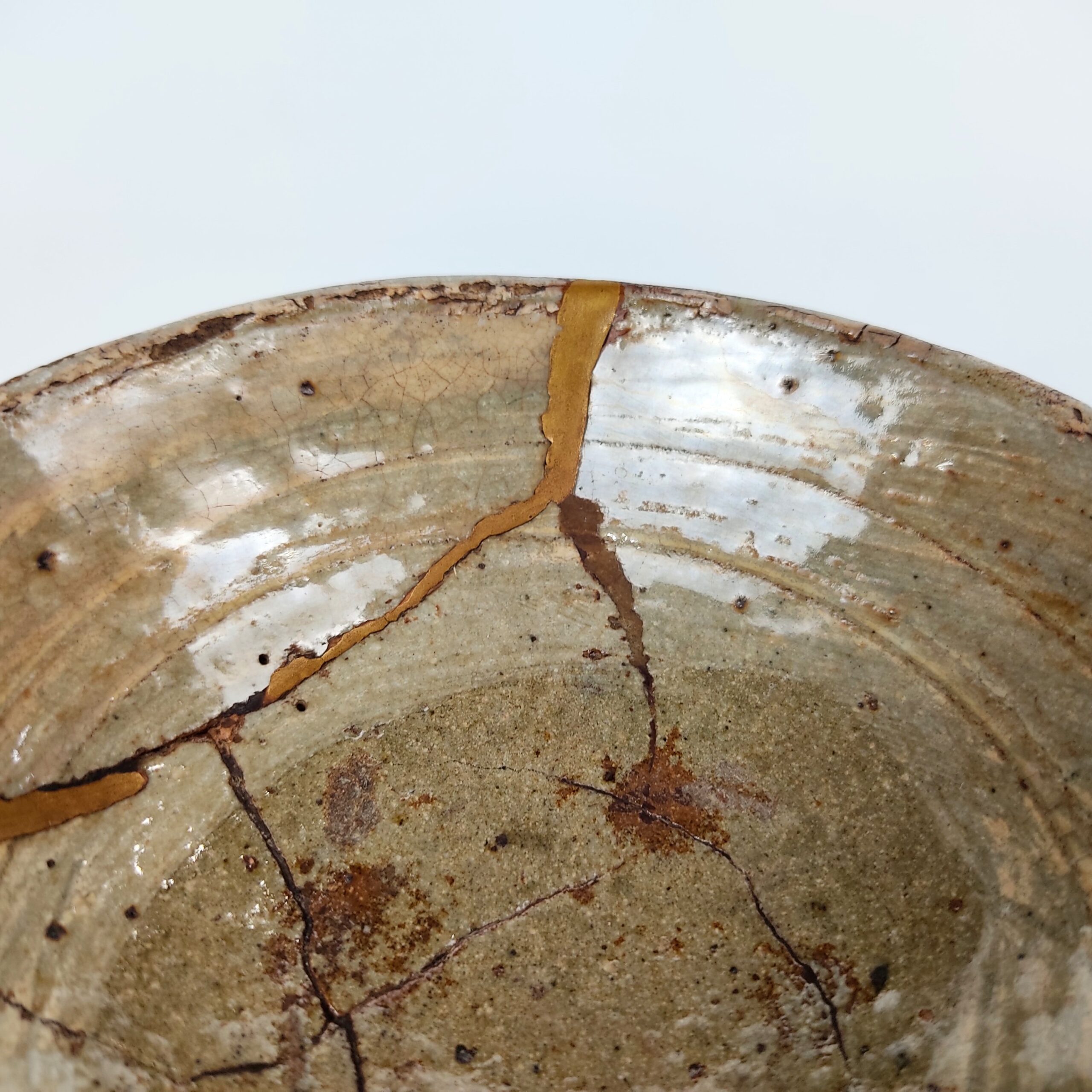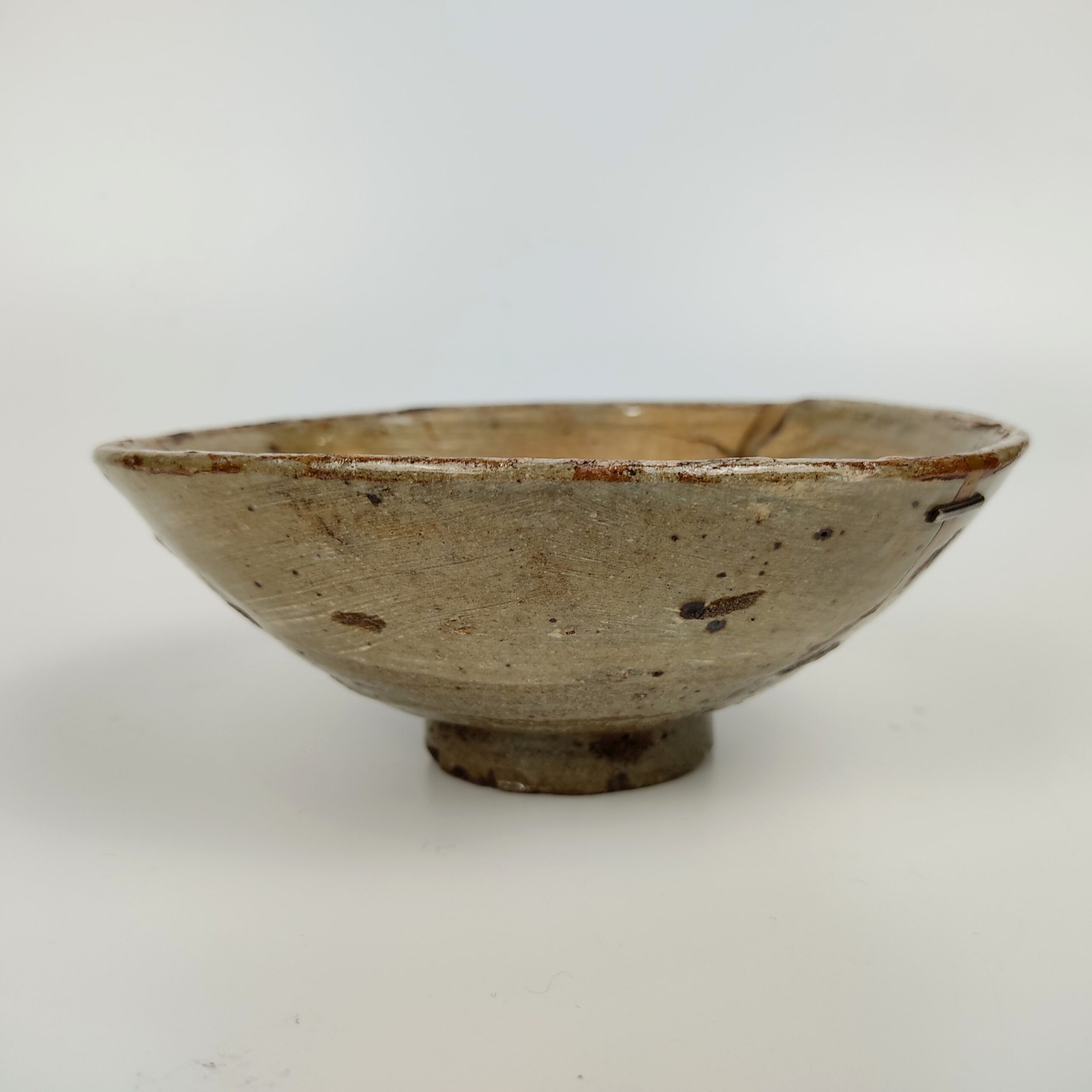 Korean antique pottery Hakeme tea bowl with gold lacquer repaired and silver clamp