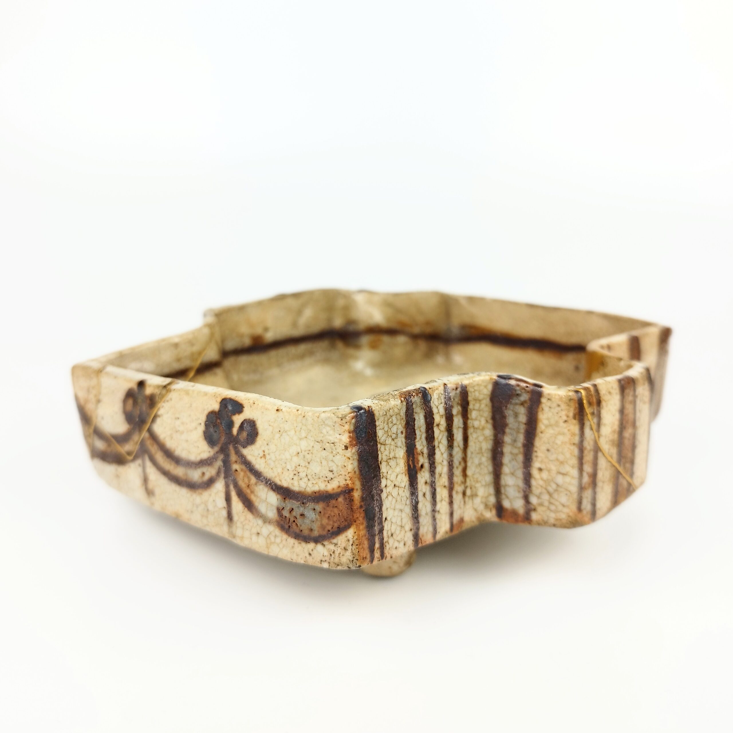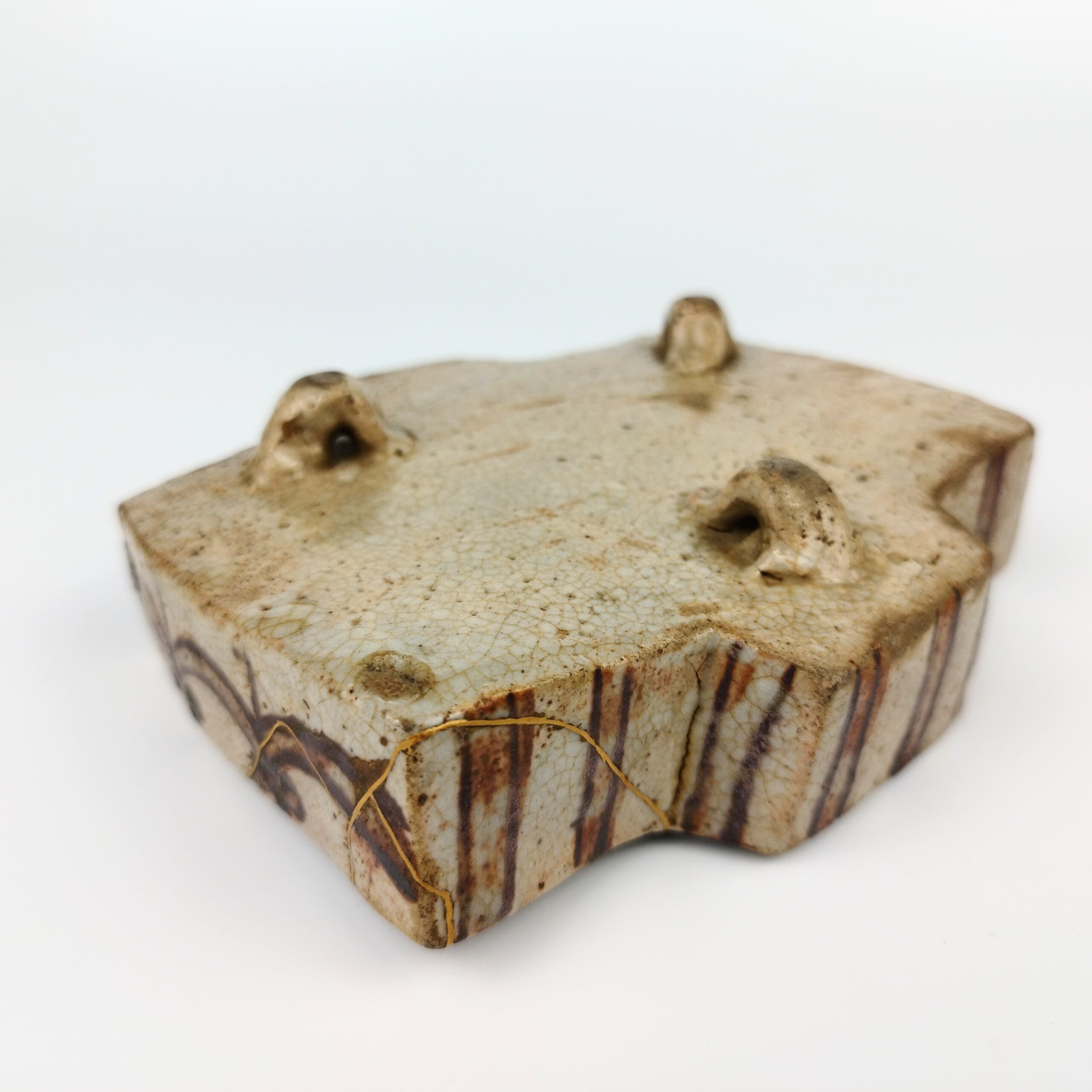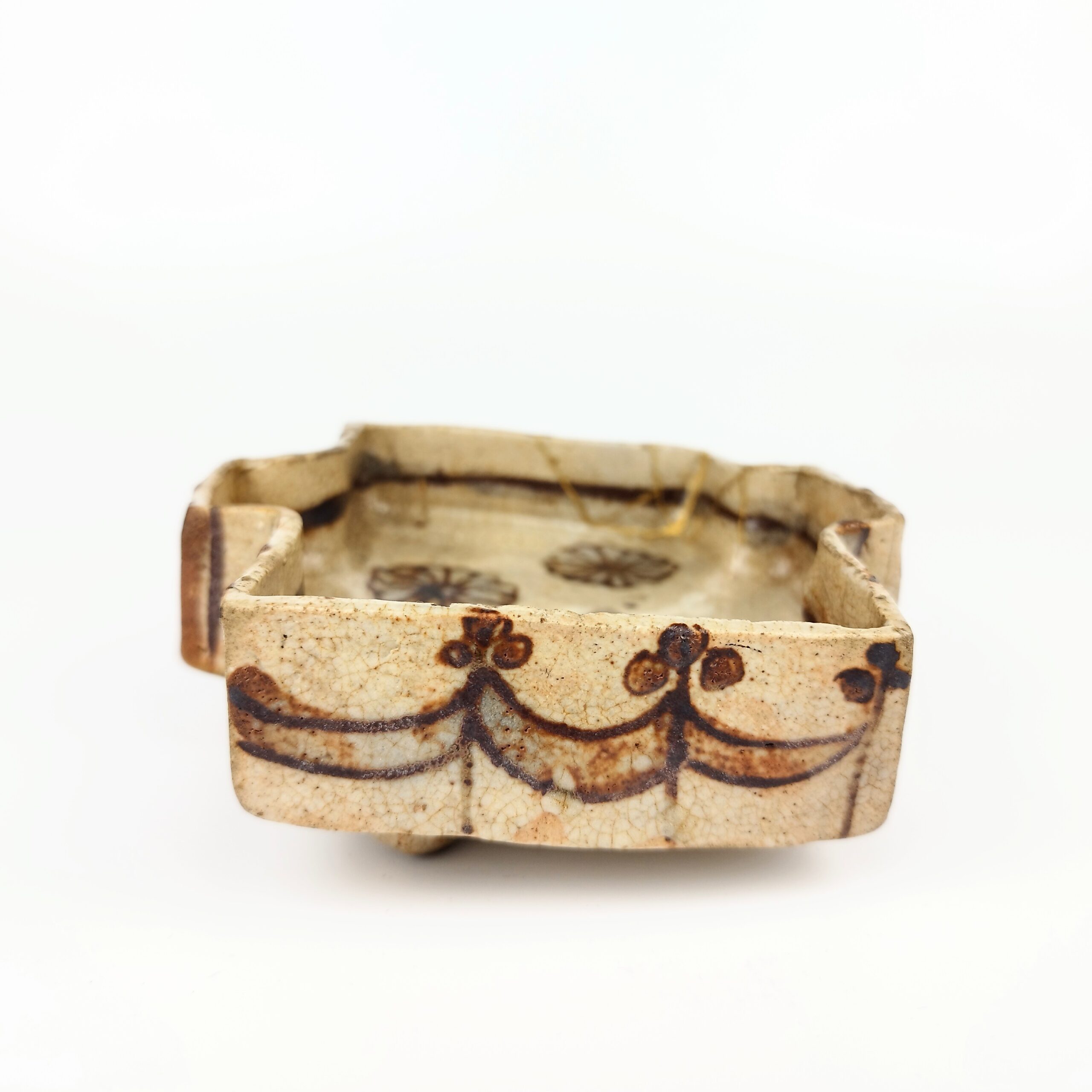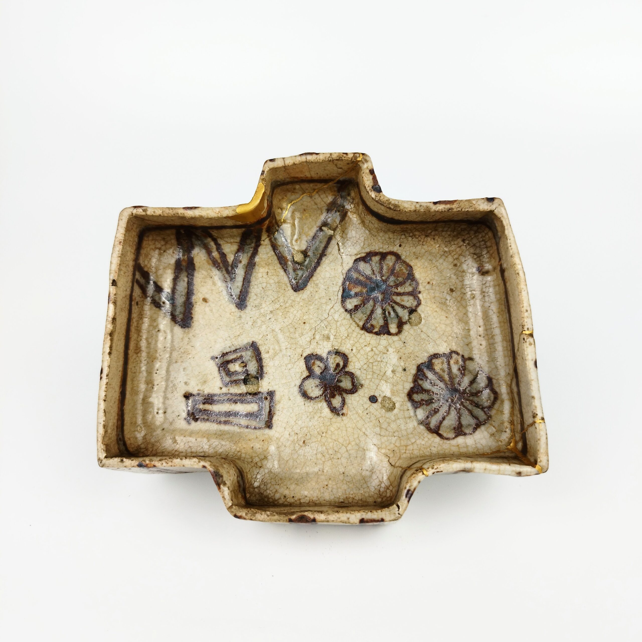 japanese antique Oribe dish with 3 legs,design of flowers,kintsugi