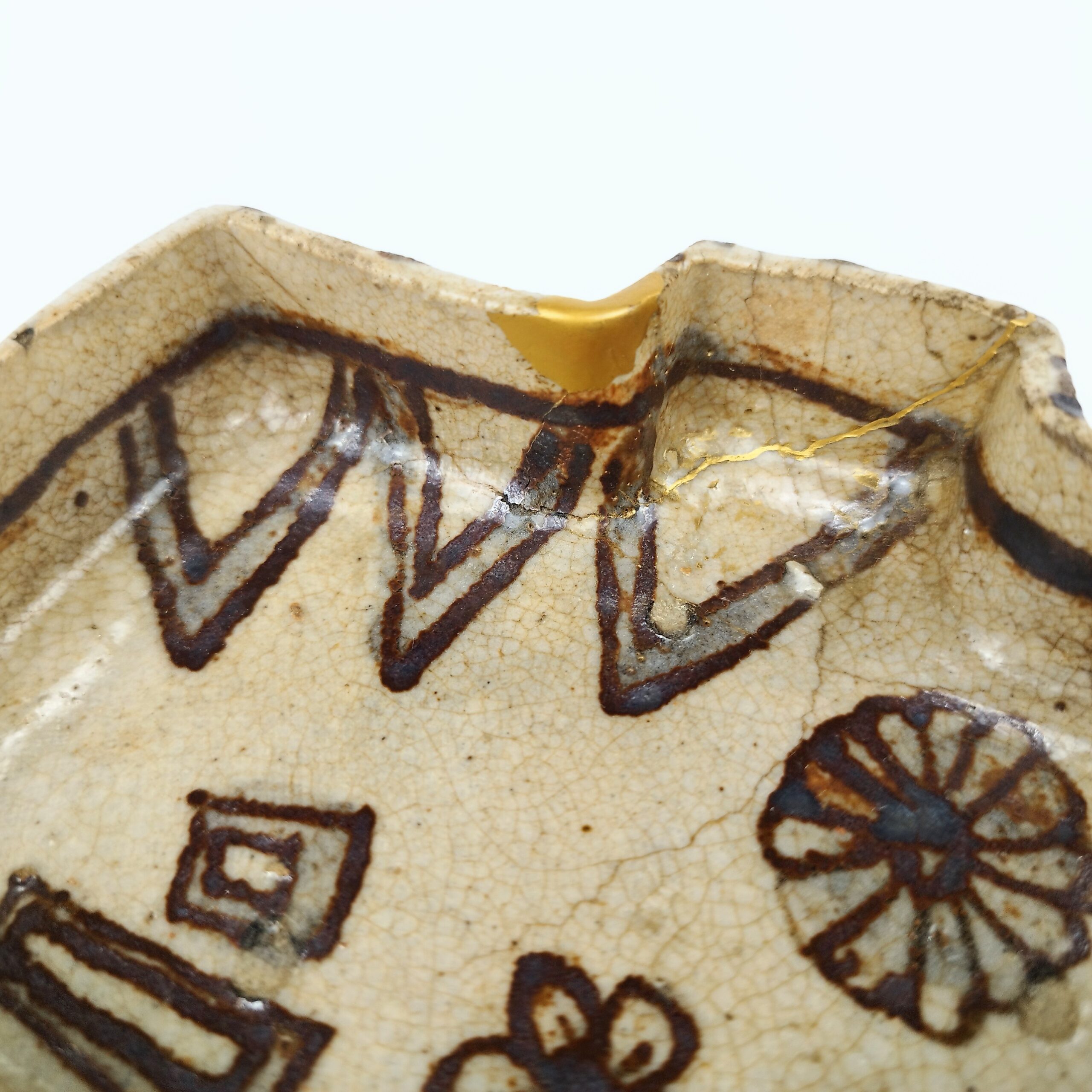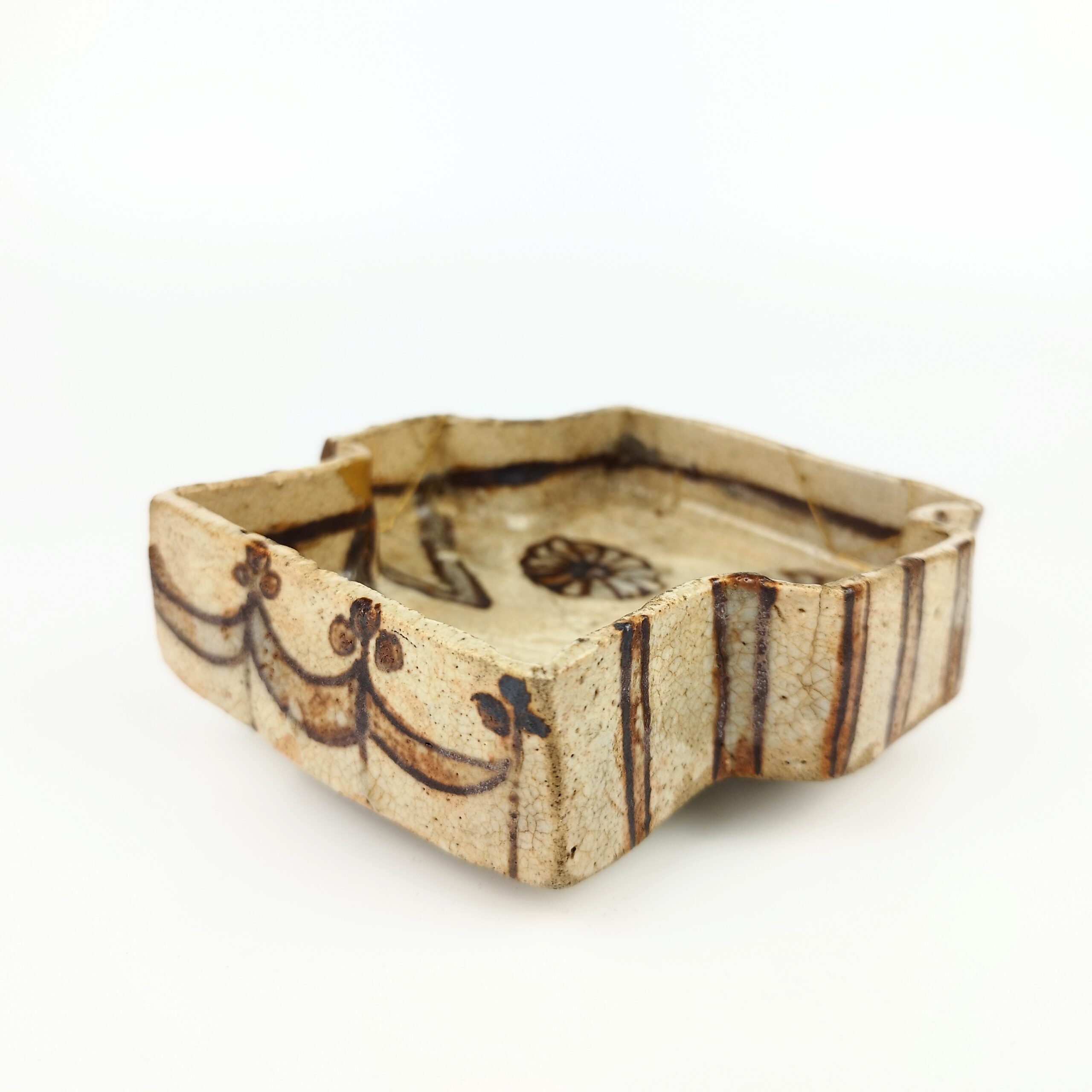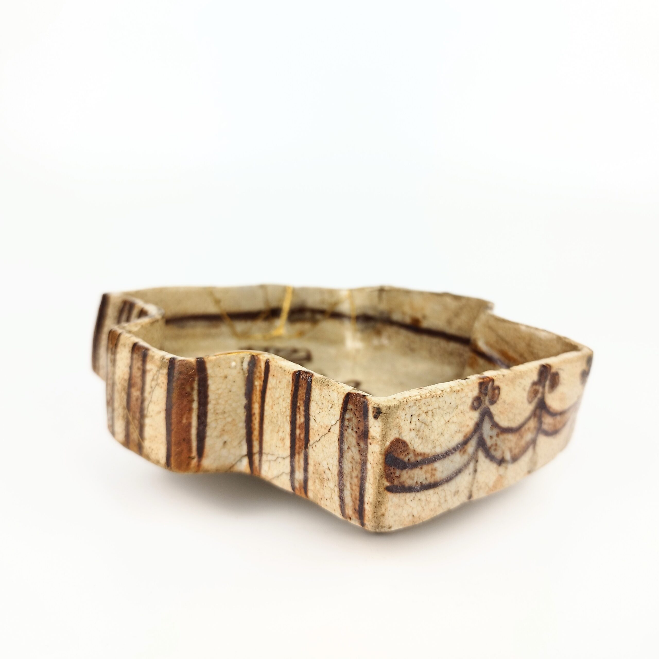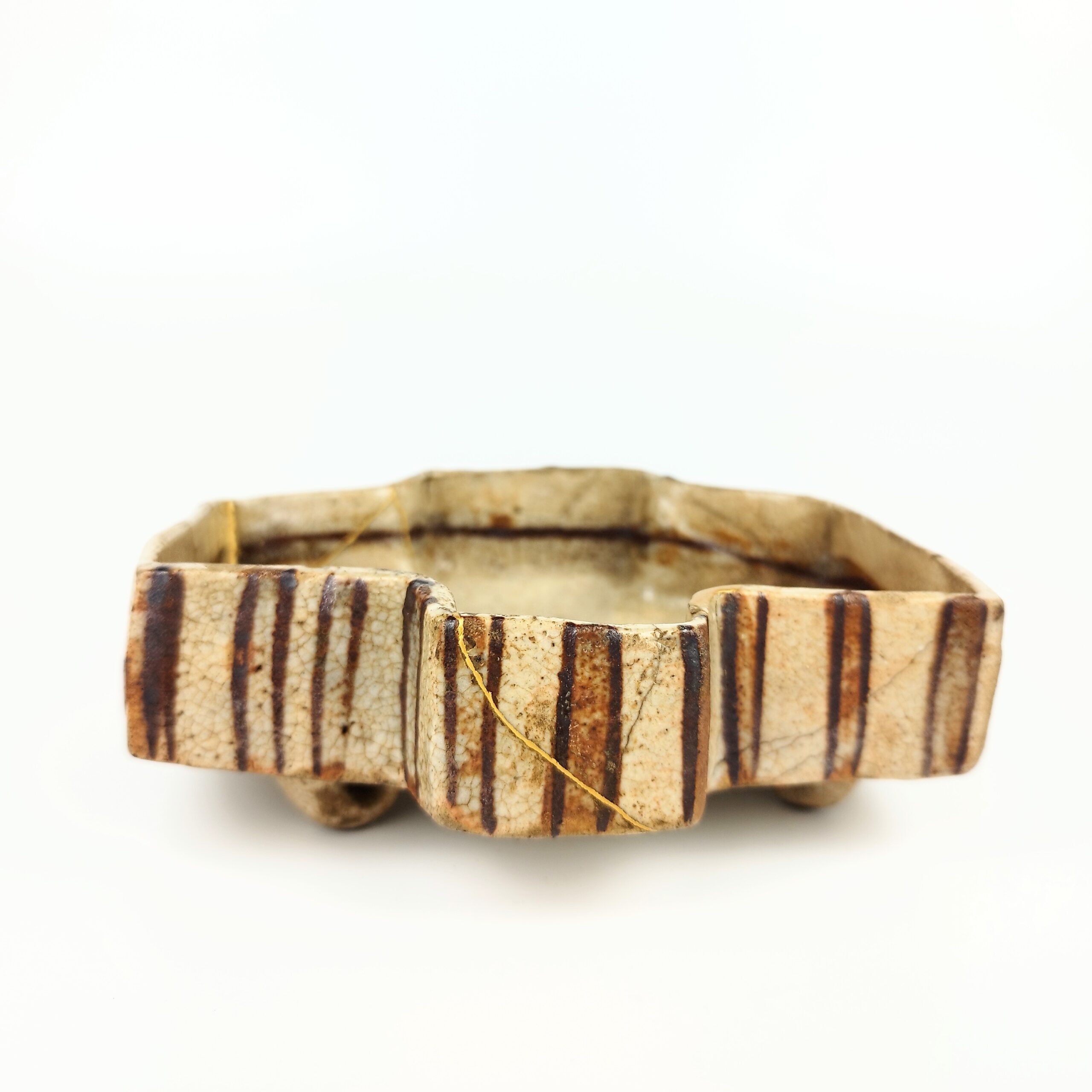 japanese antique Oribe dish with 3 legs,design of flowers,kintsugi