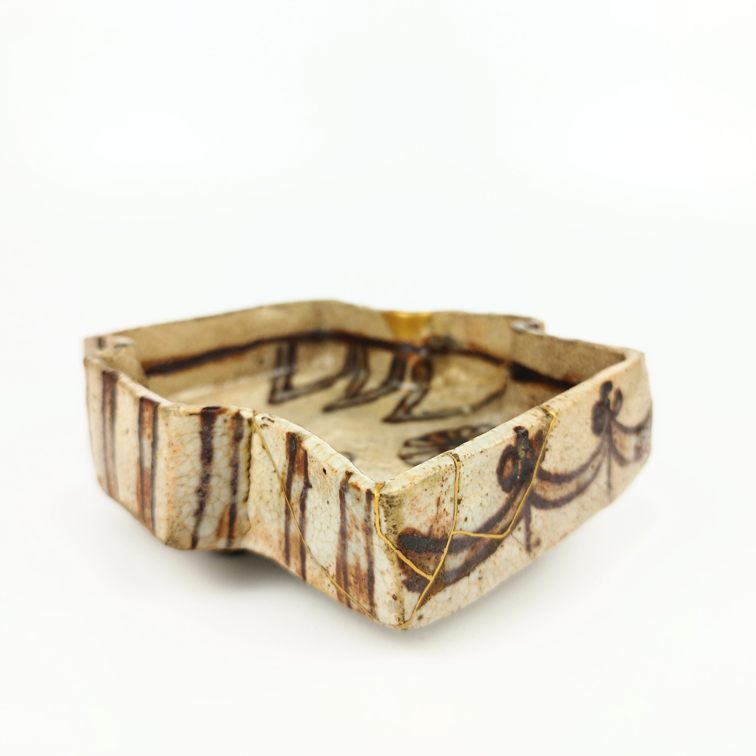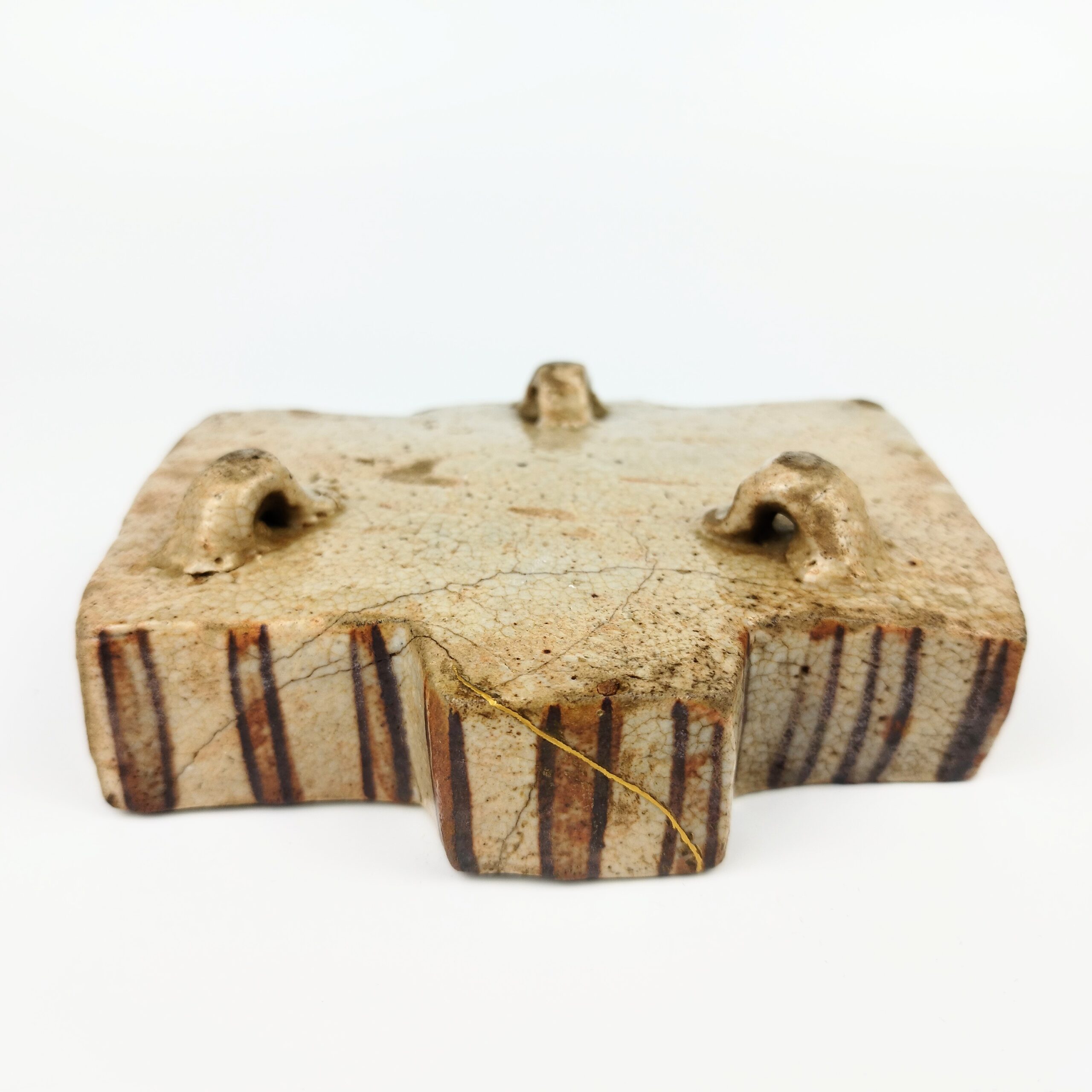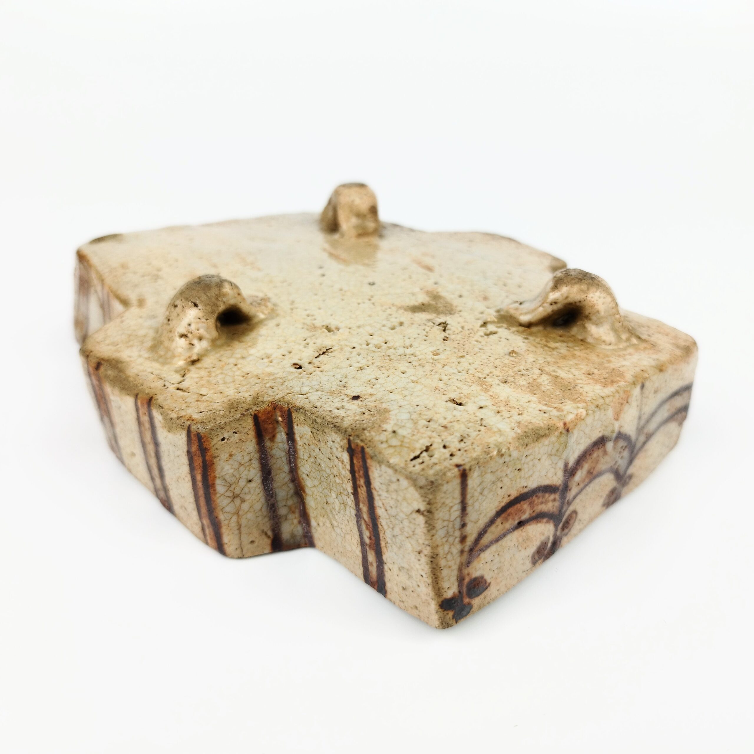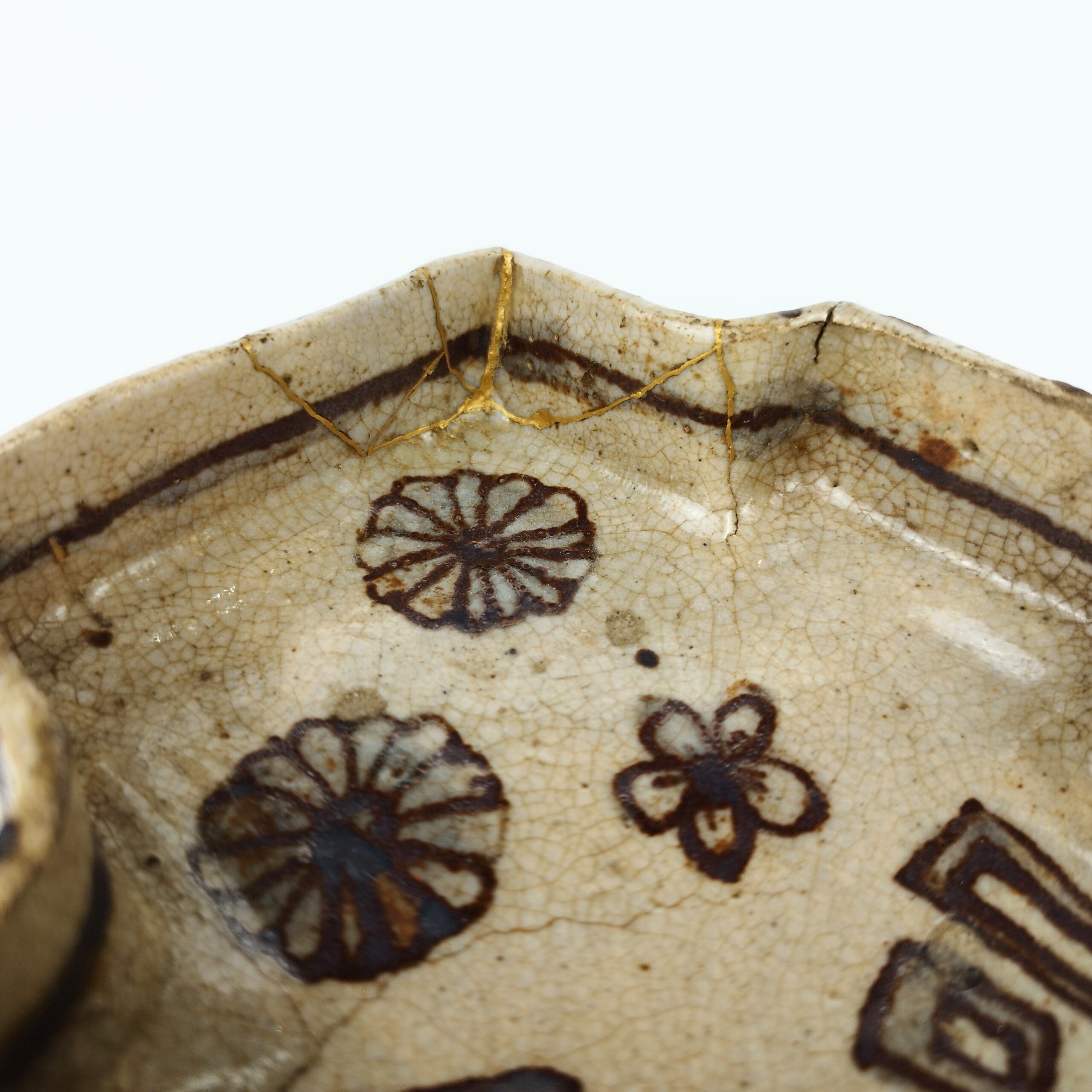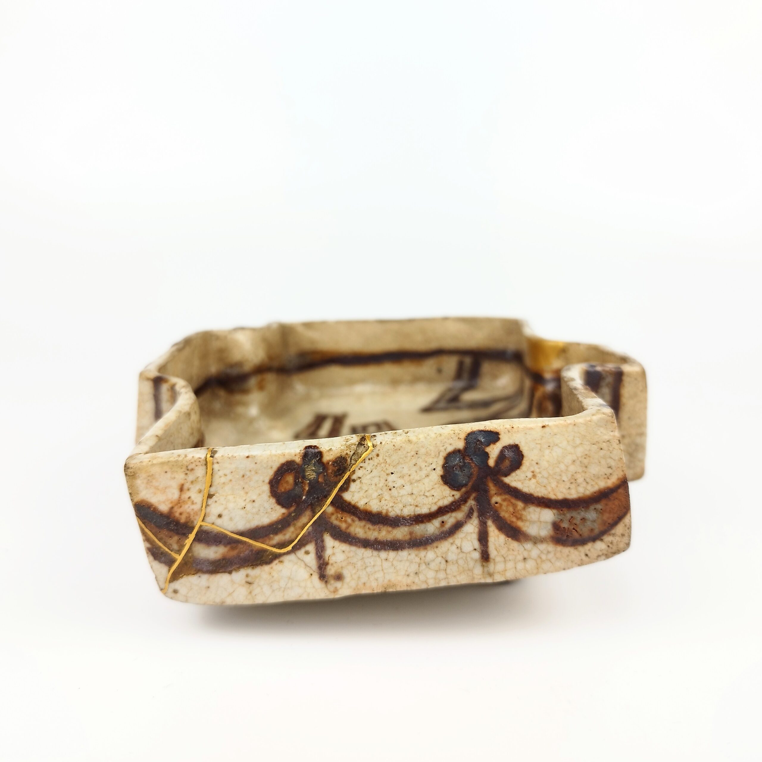 japanese antique Oribe dish with 3 legs,design of flowers,kintsugi