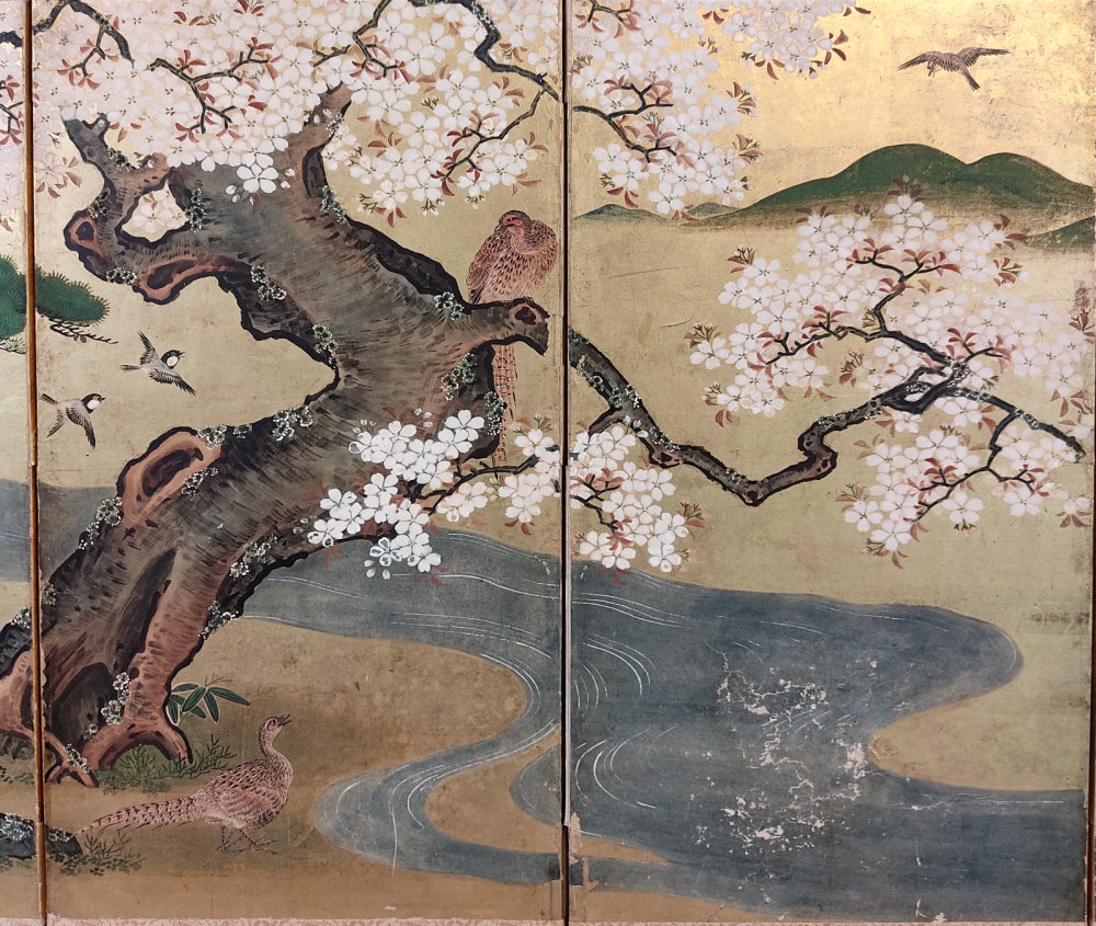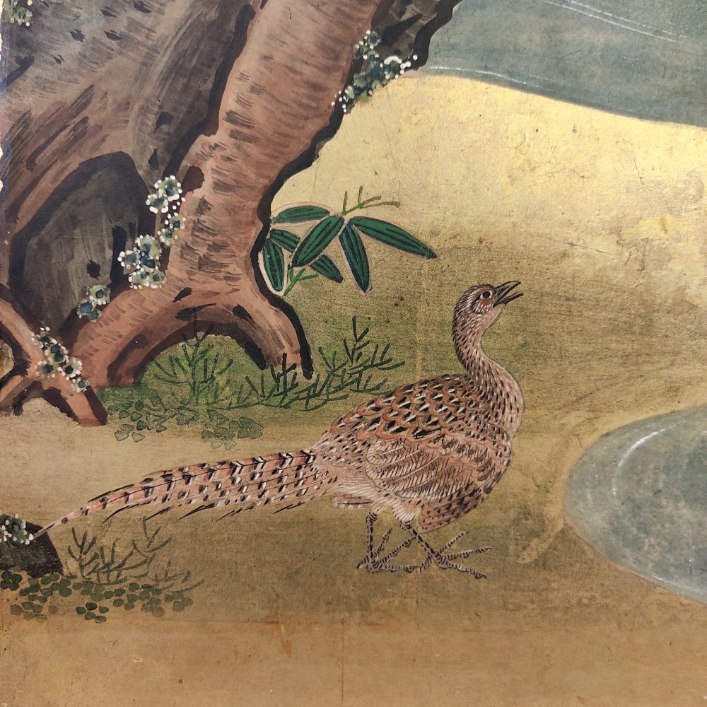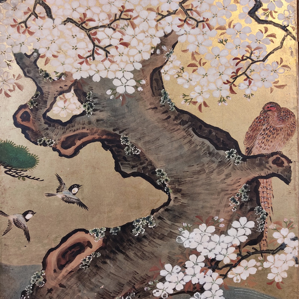Six hold paper screen painted in ink and color on a gold ground with cherry blossoms and pheasants