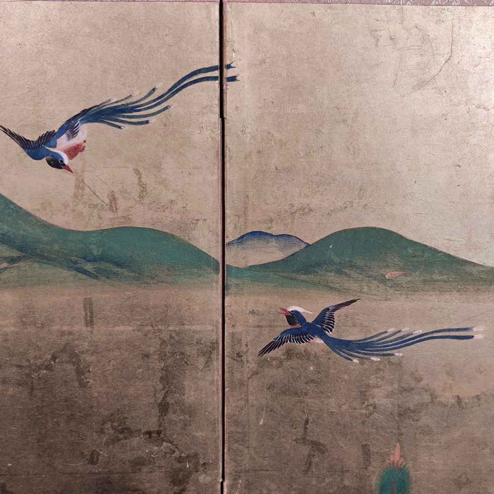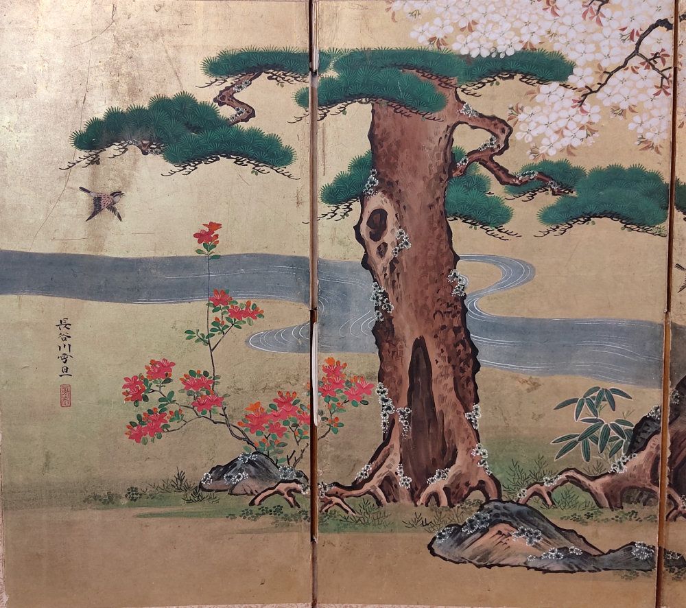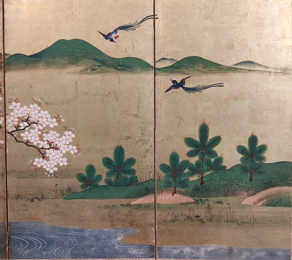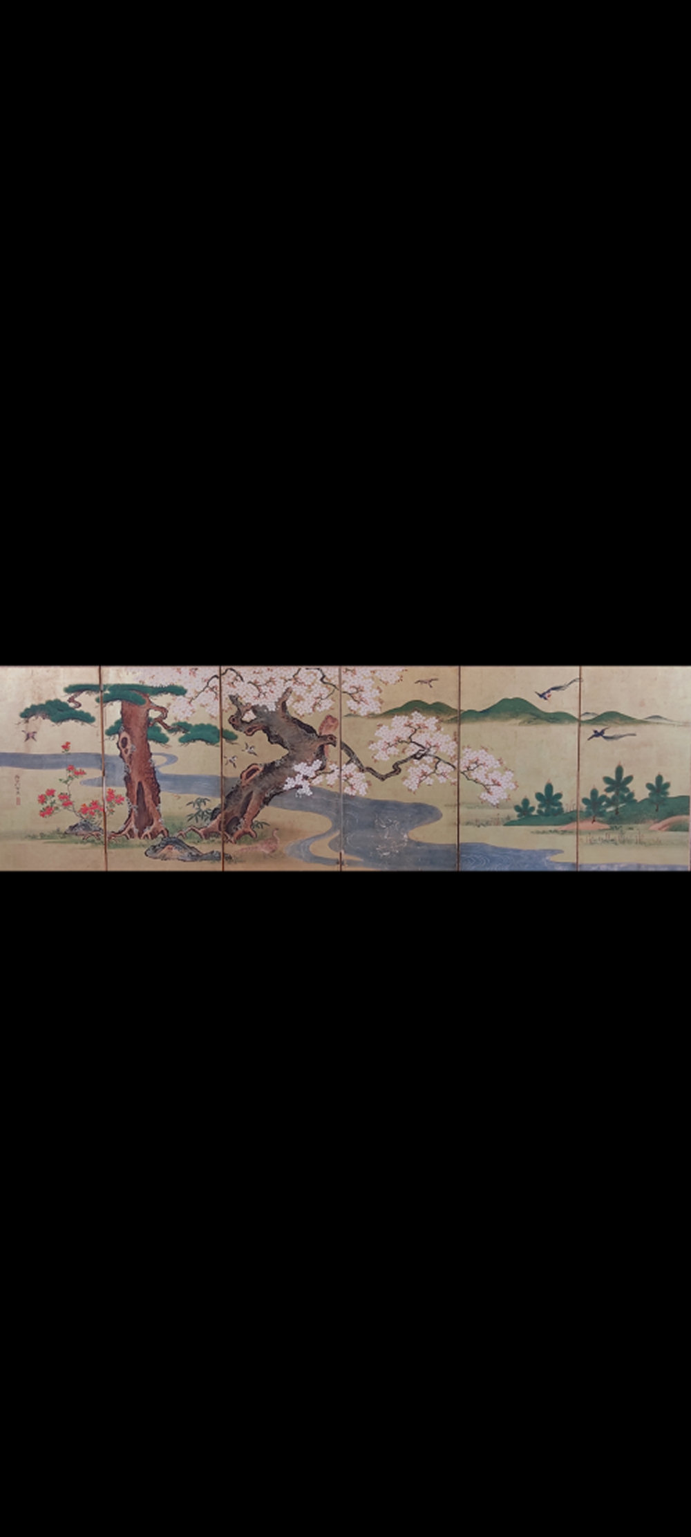 Six hold paper screen painted in ink and color on a gold ground with cherry blossoms and pheasants