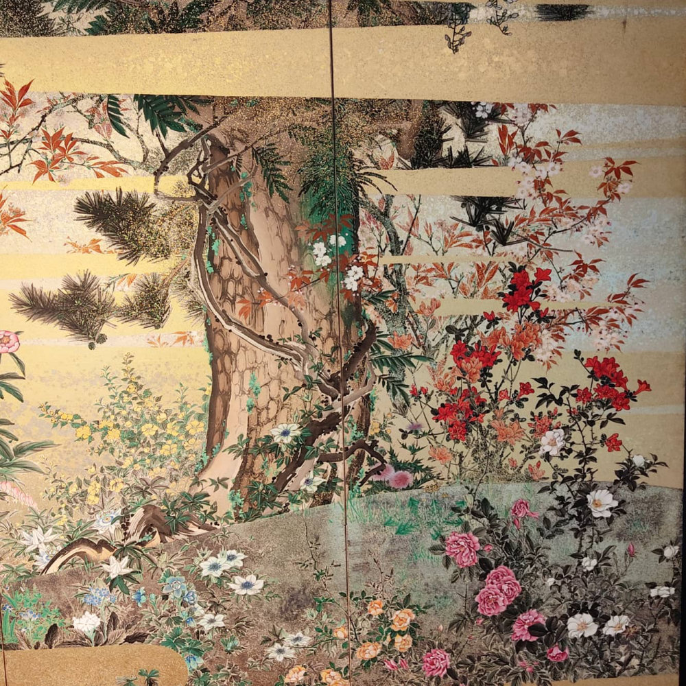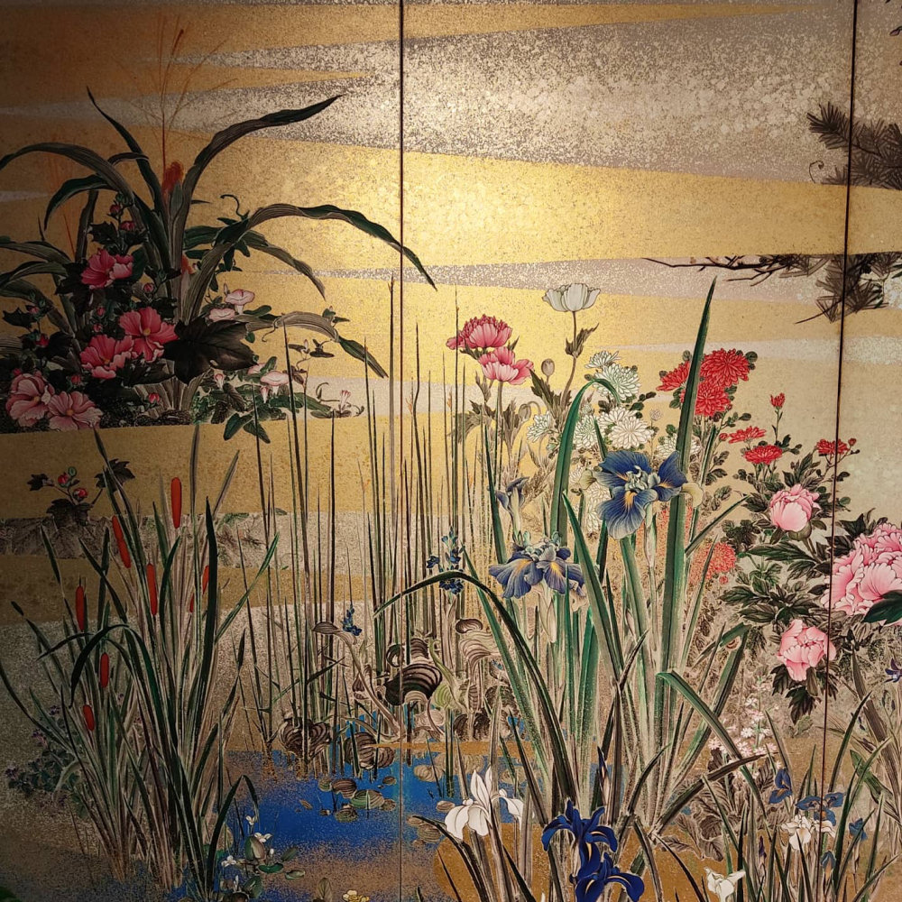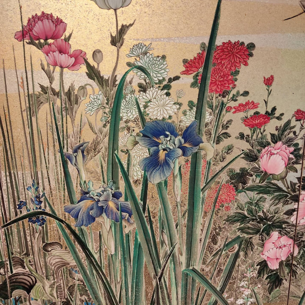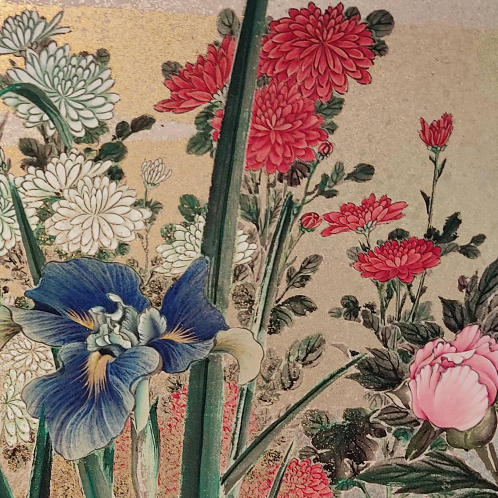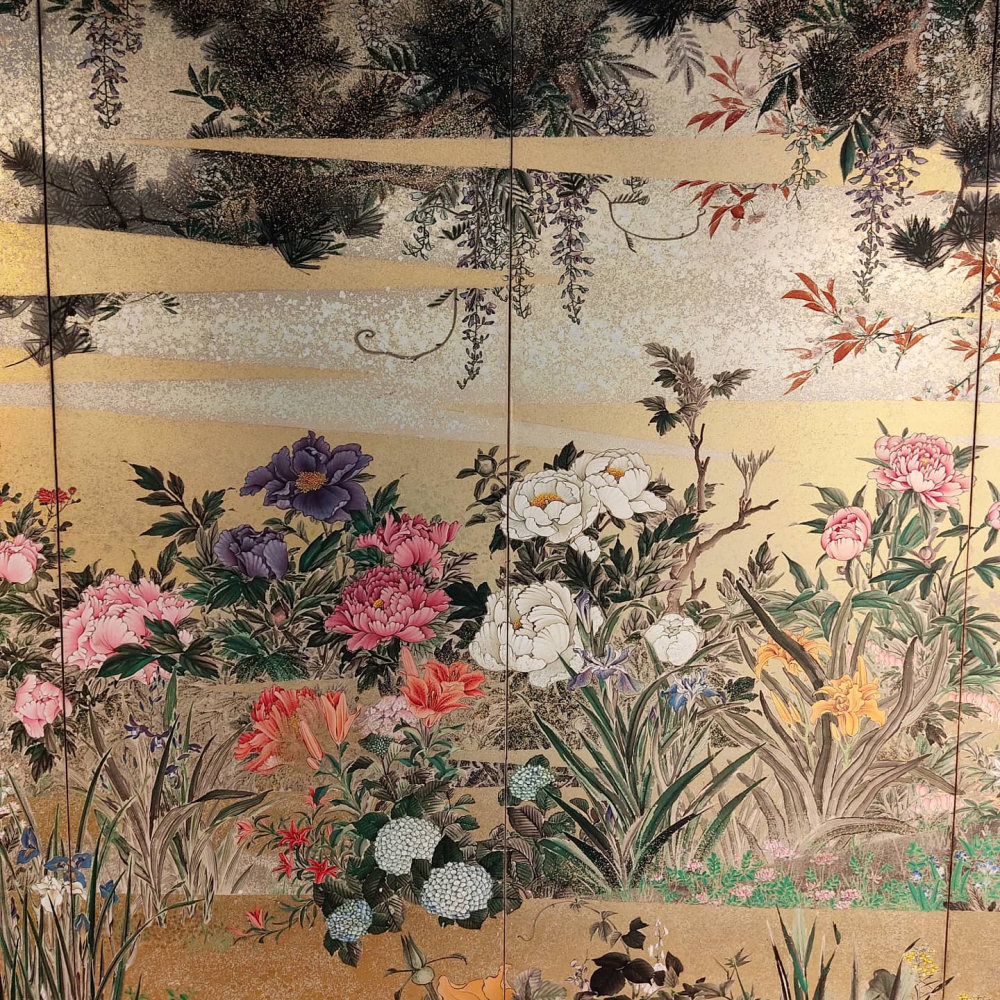 Six hold paper screen painted in ink and color on a gold ground with flowers