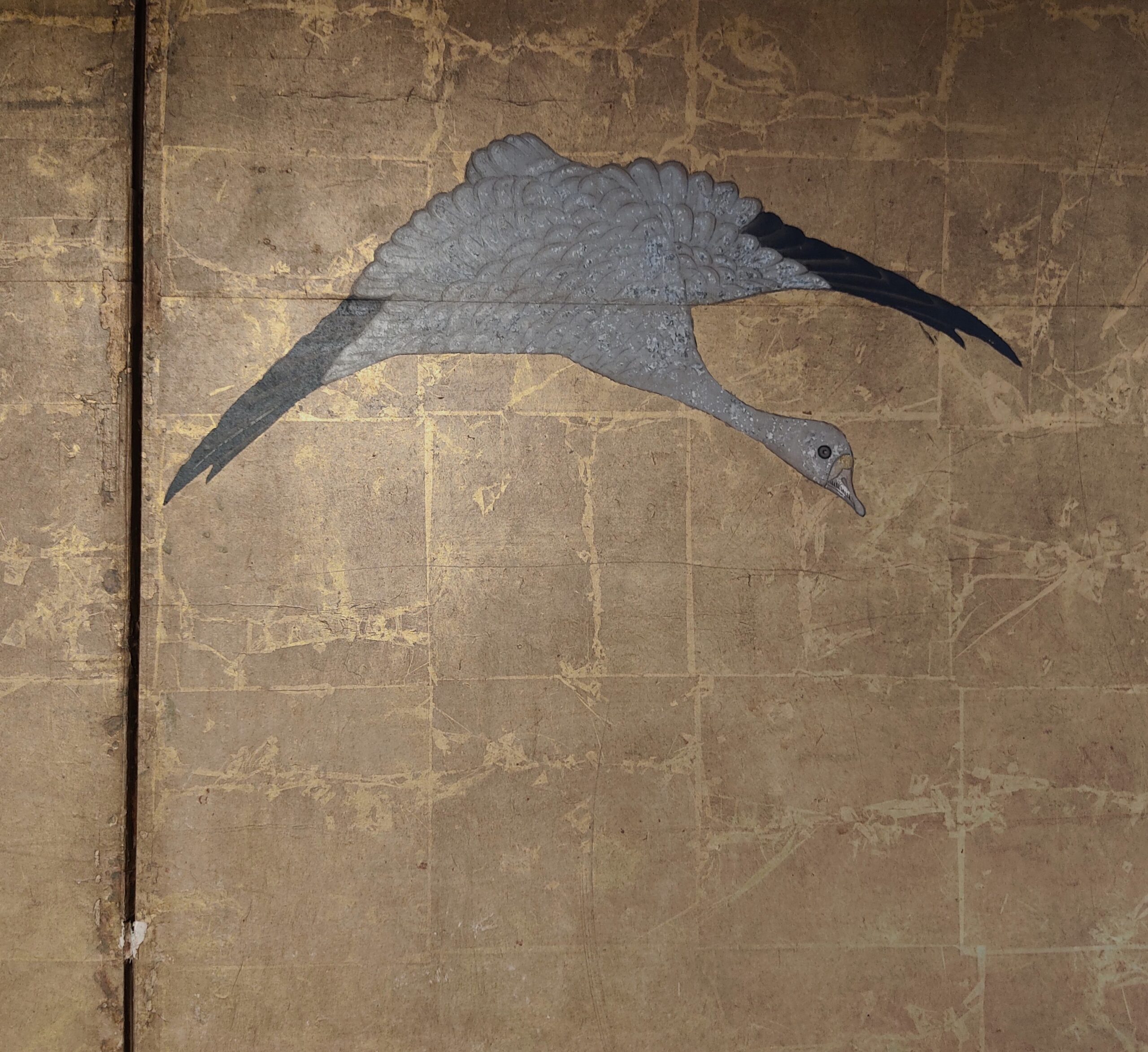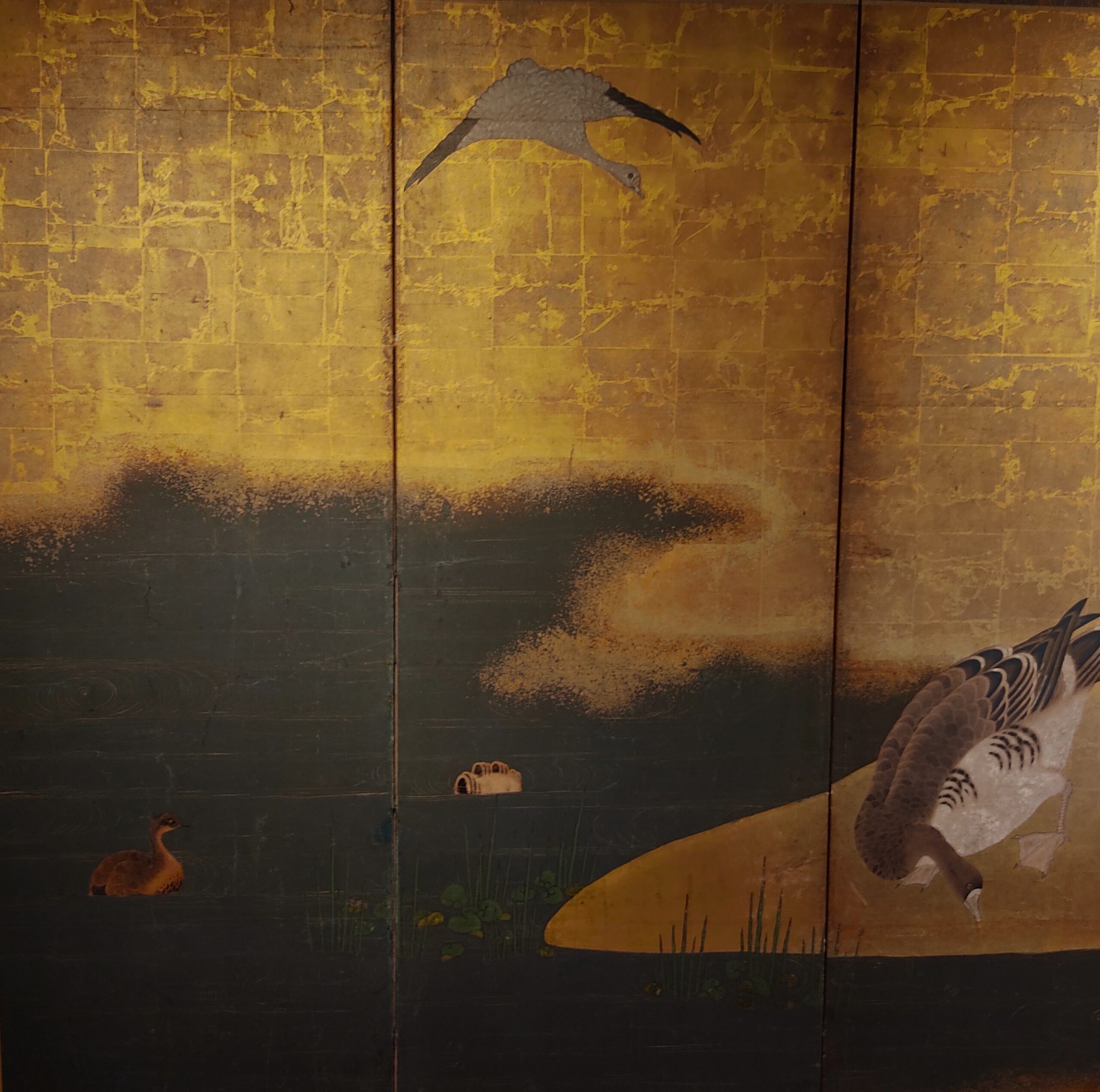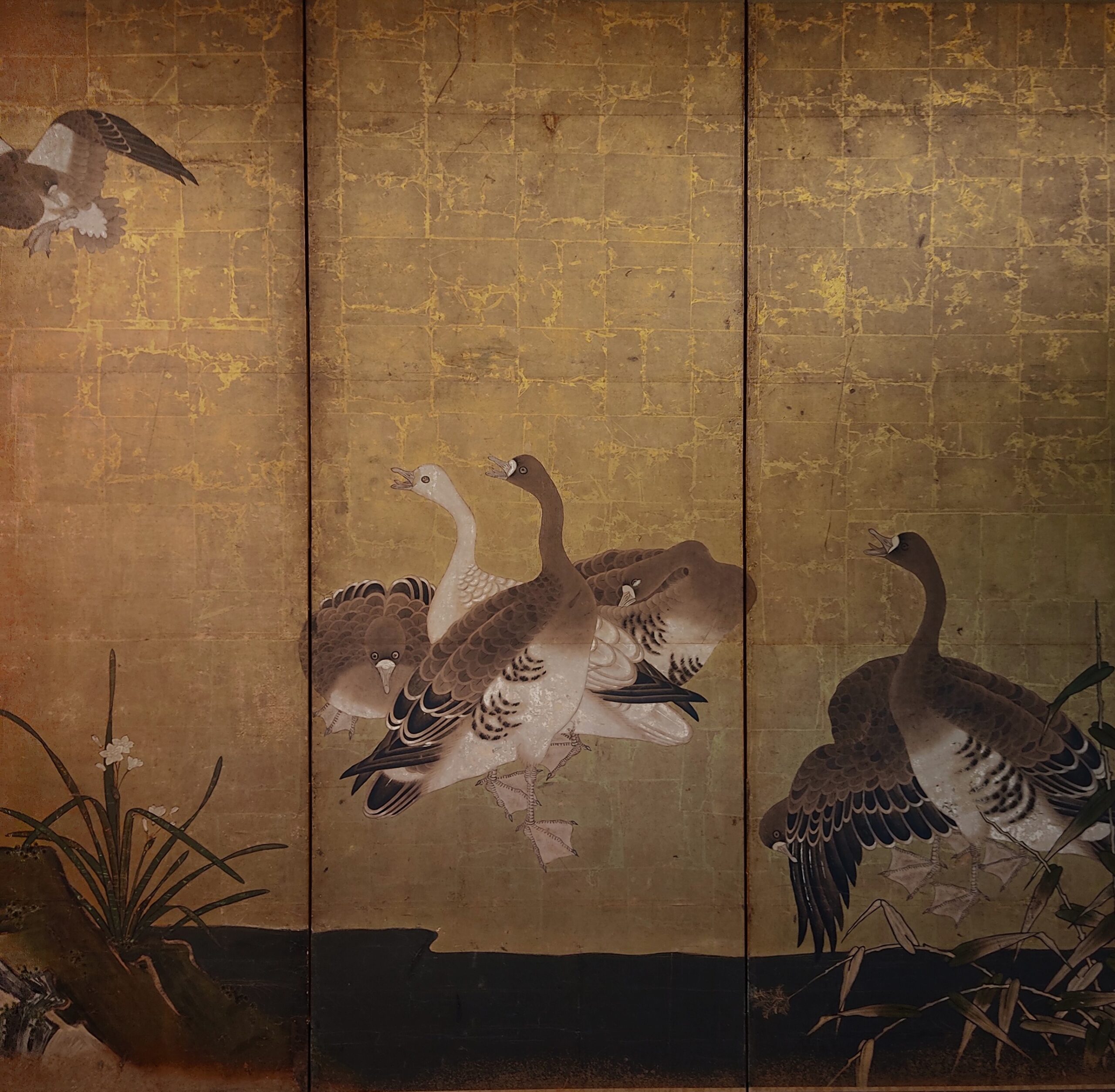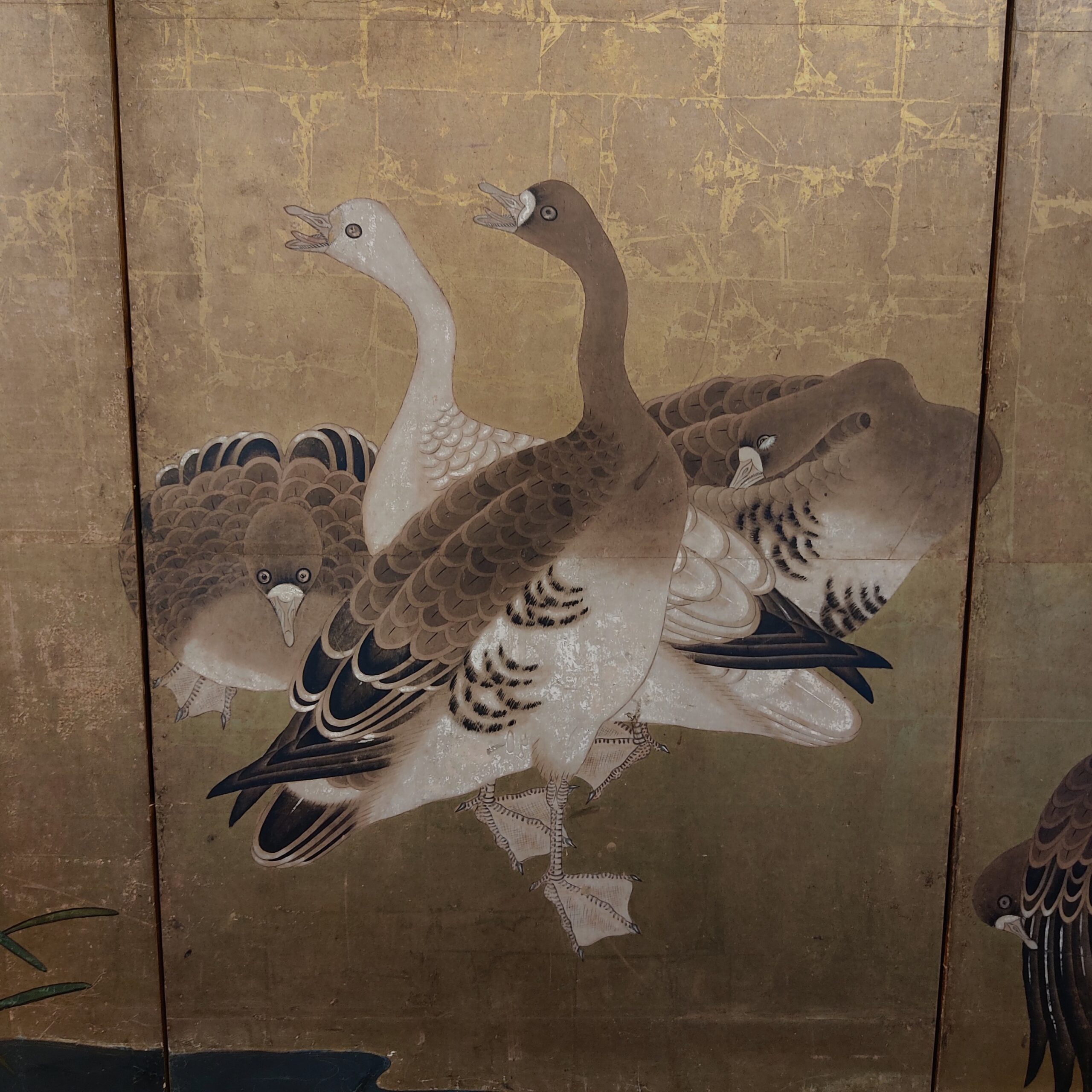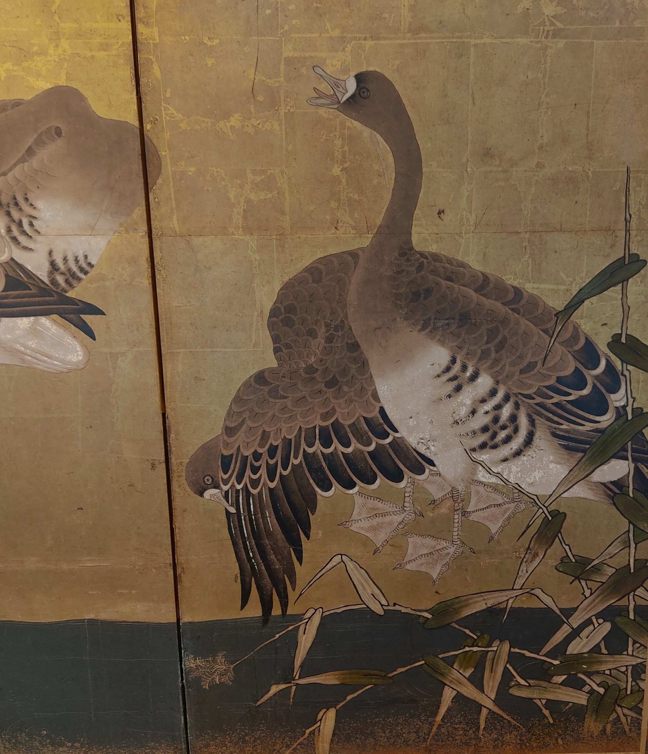 Six hold paper screen painted in ink and color on a gold ground with geese and reed