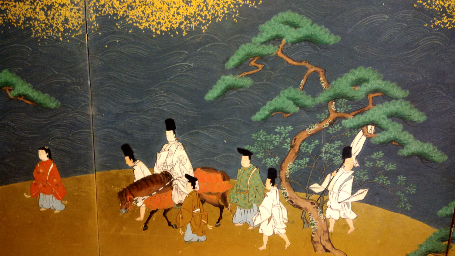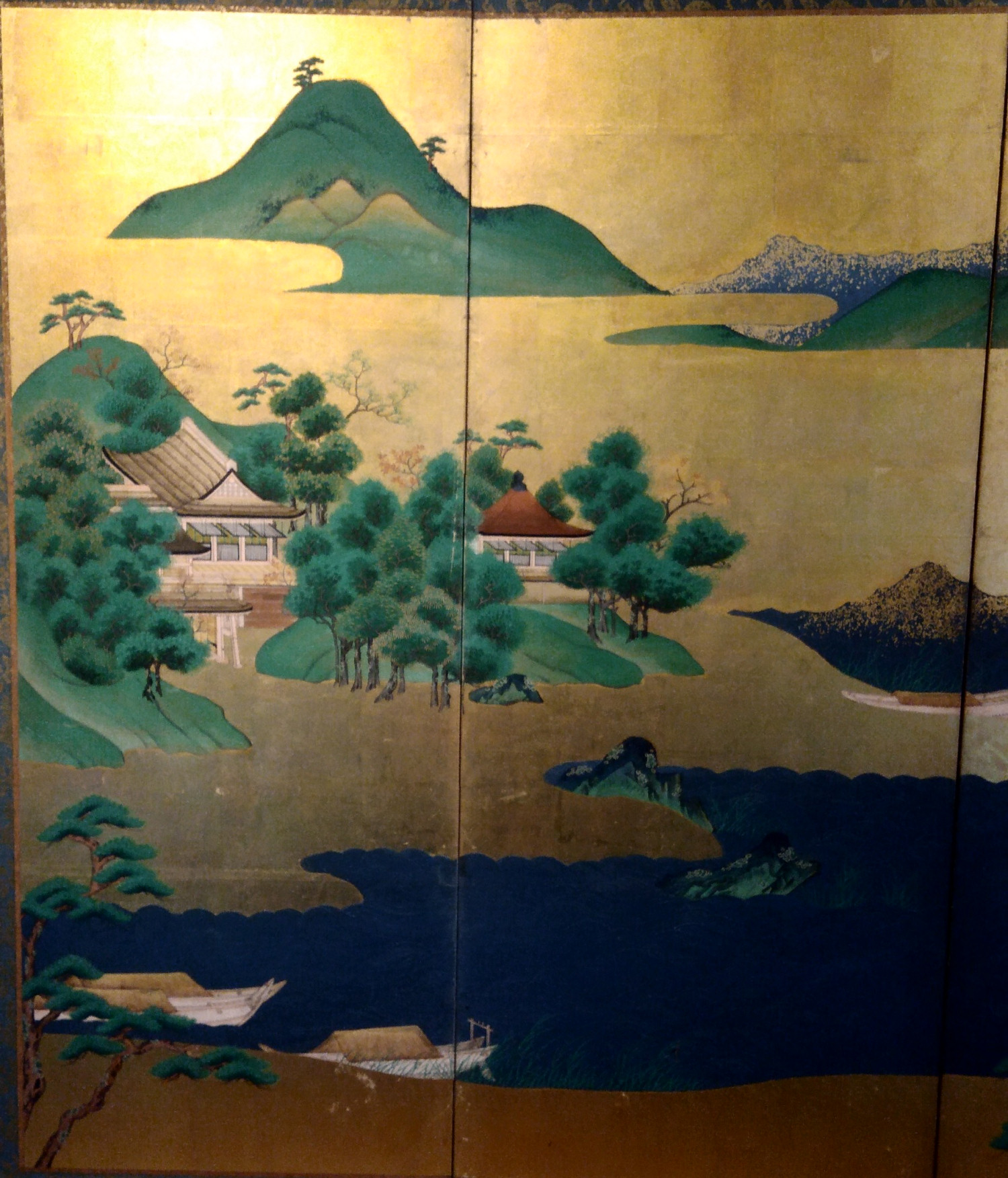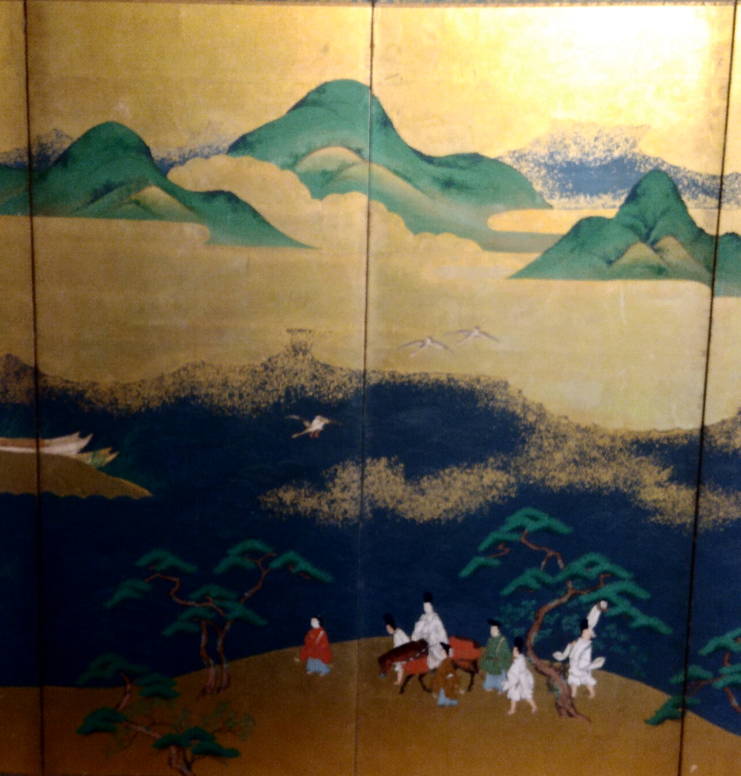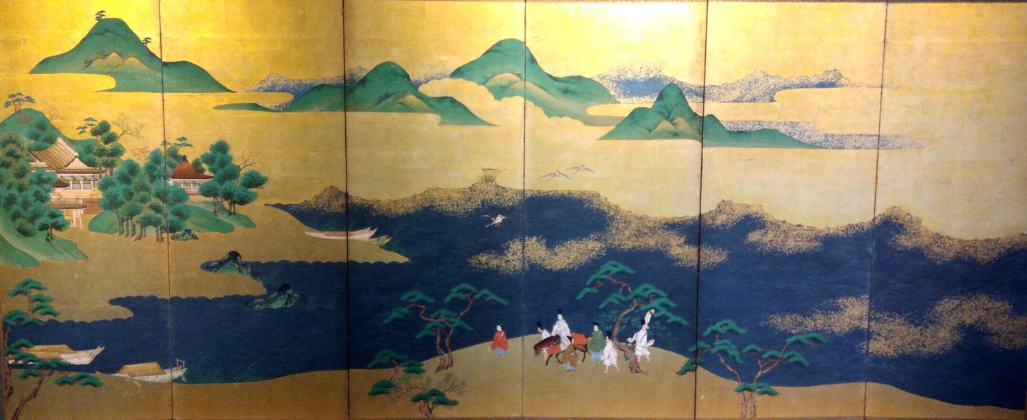 Six hold paper screen painted in ink and color on a gold ground with genre painting