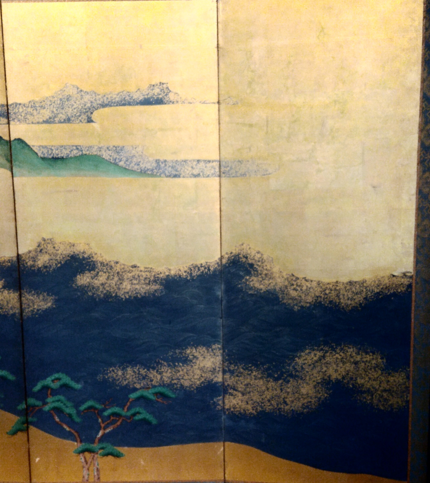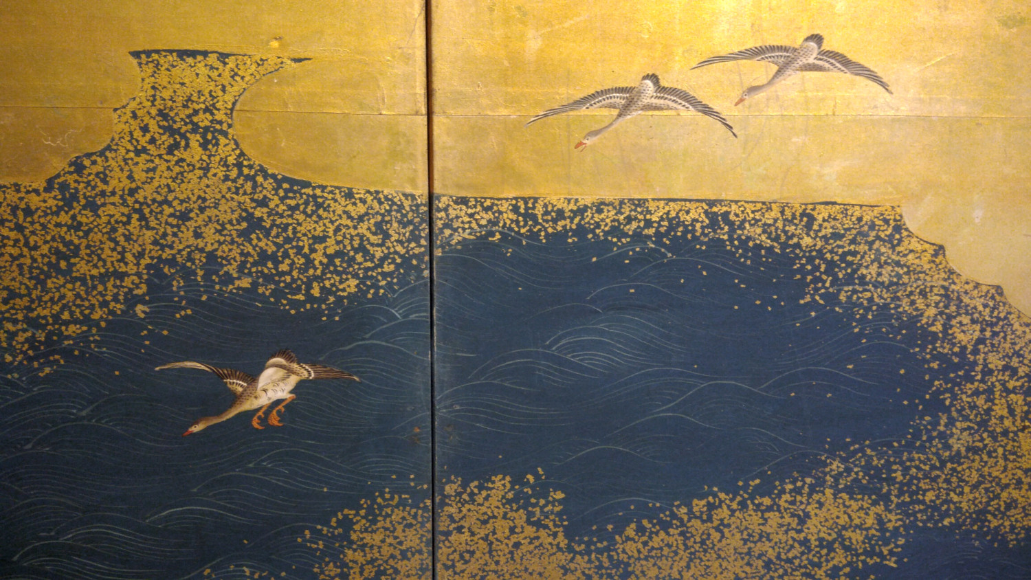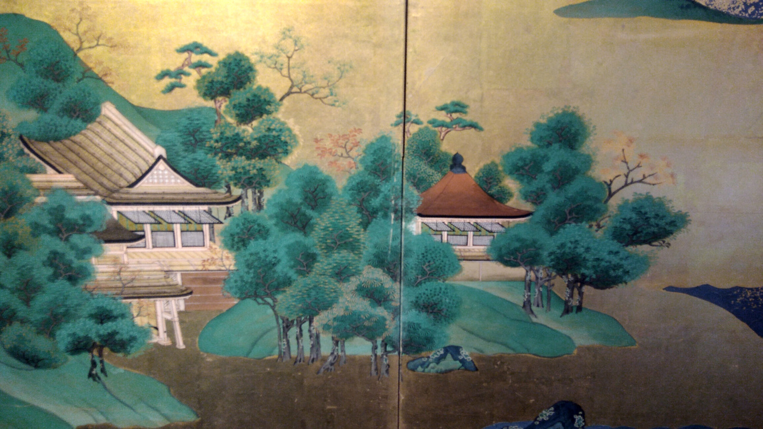 Six hold paper screen painted in ink and color on a gold ground with genre painting