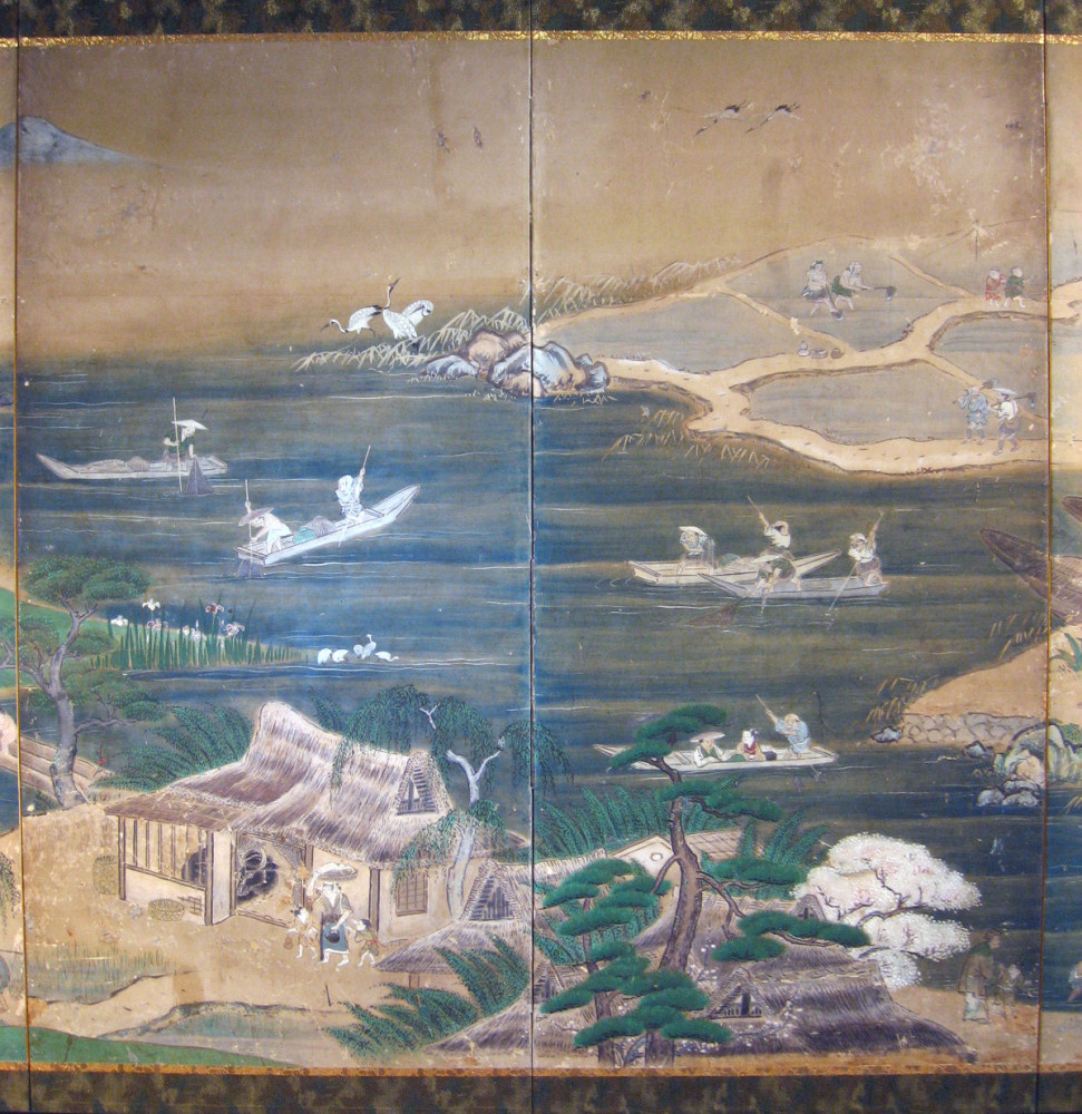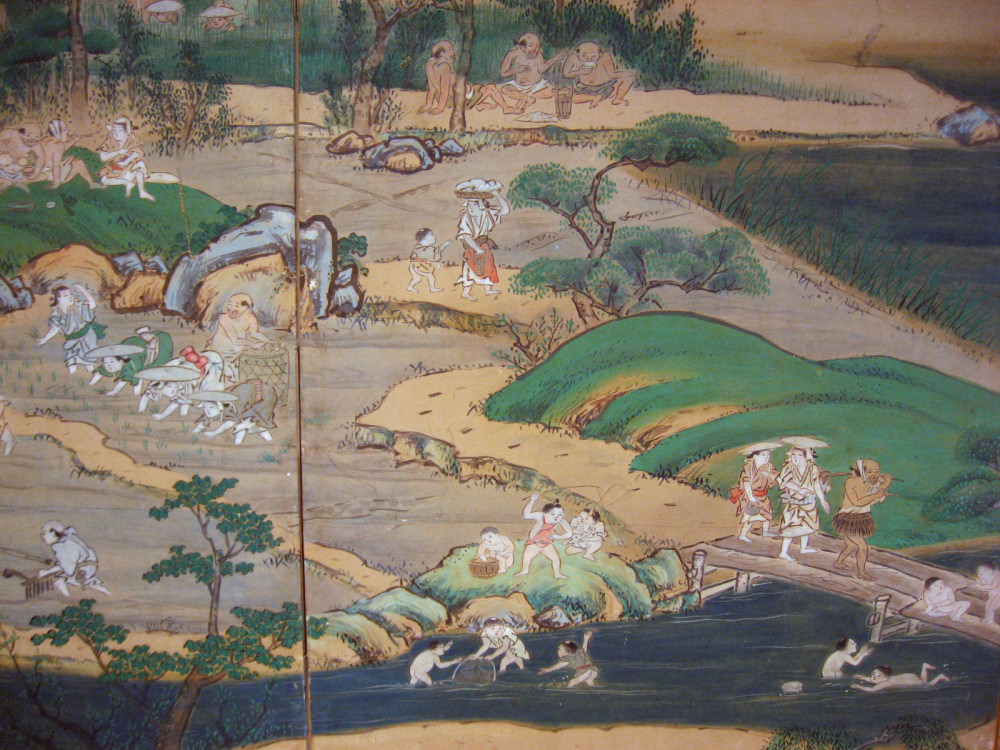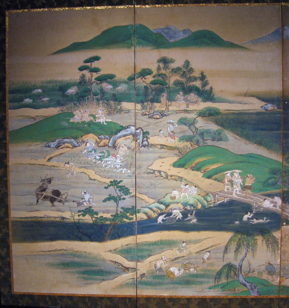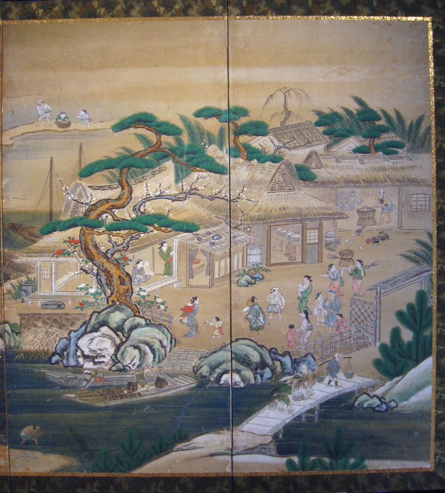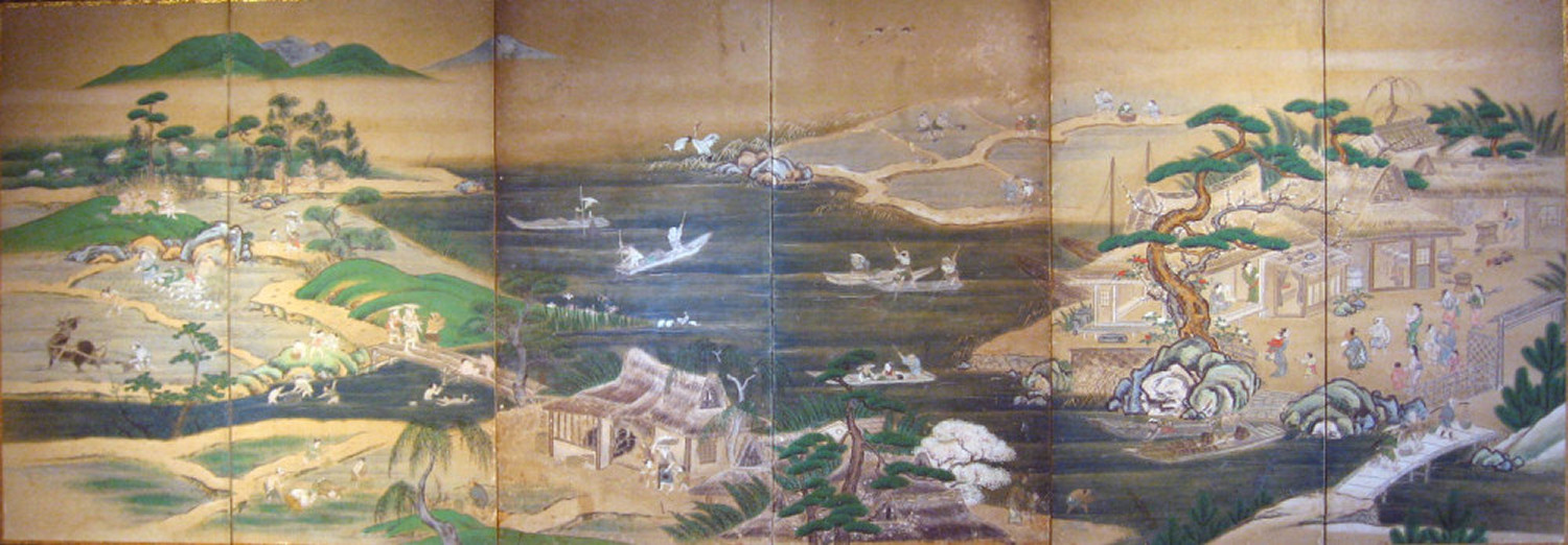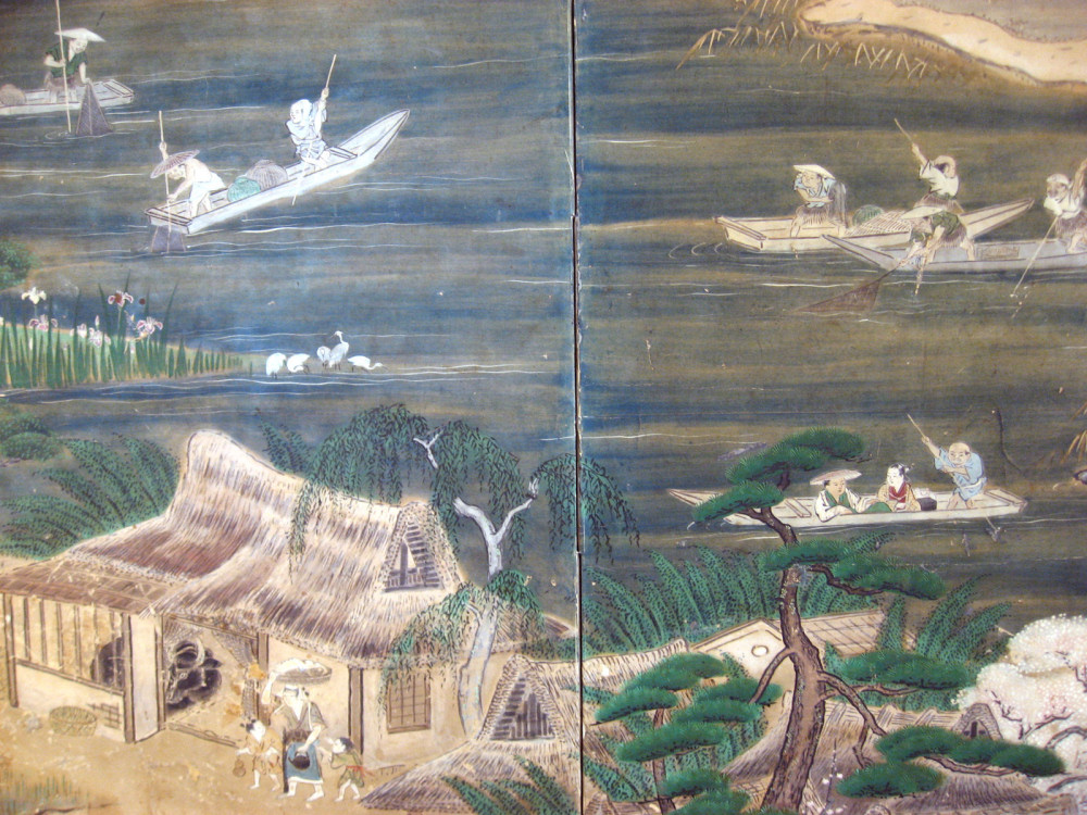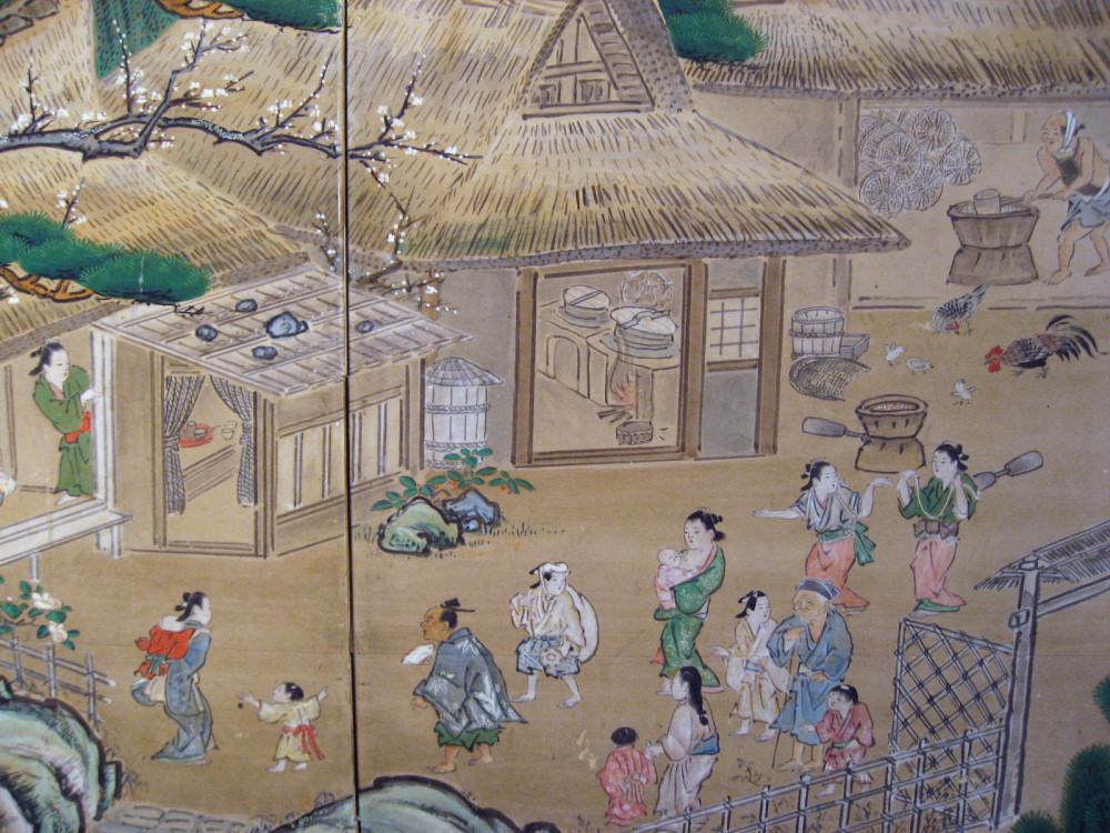 japanese antique Six hold paper screen painted in ink and color on a gold ground with genre painting