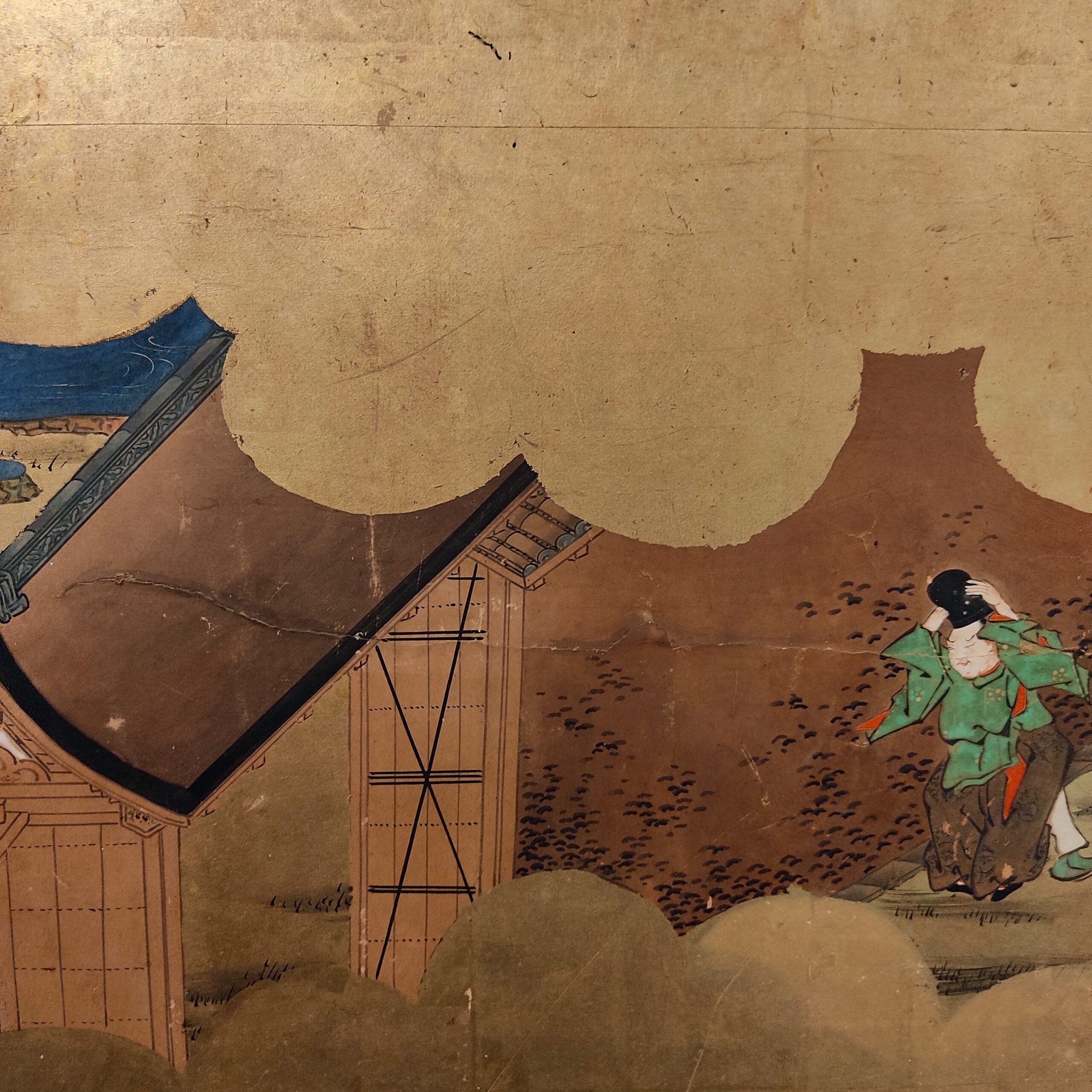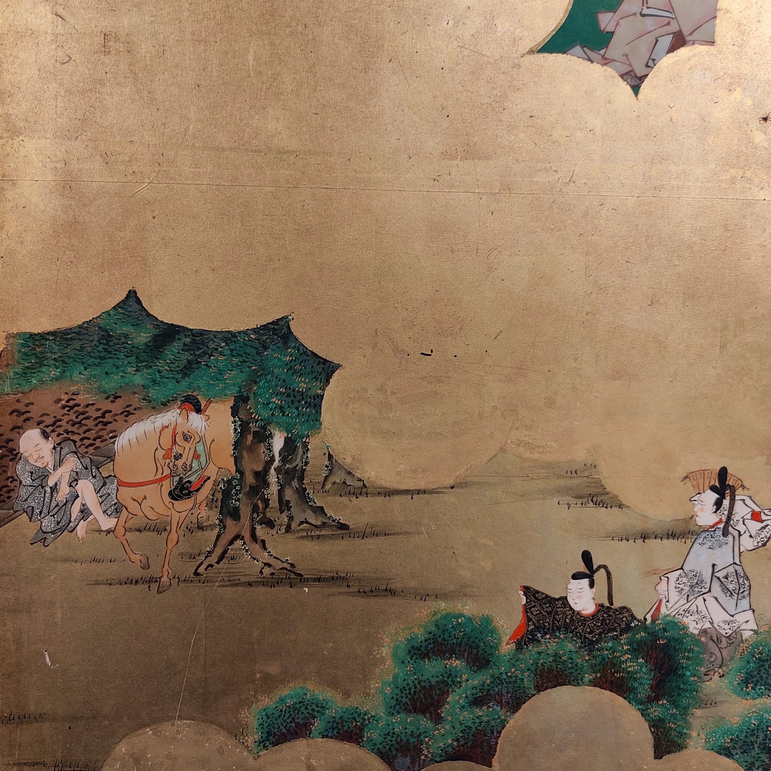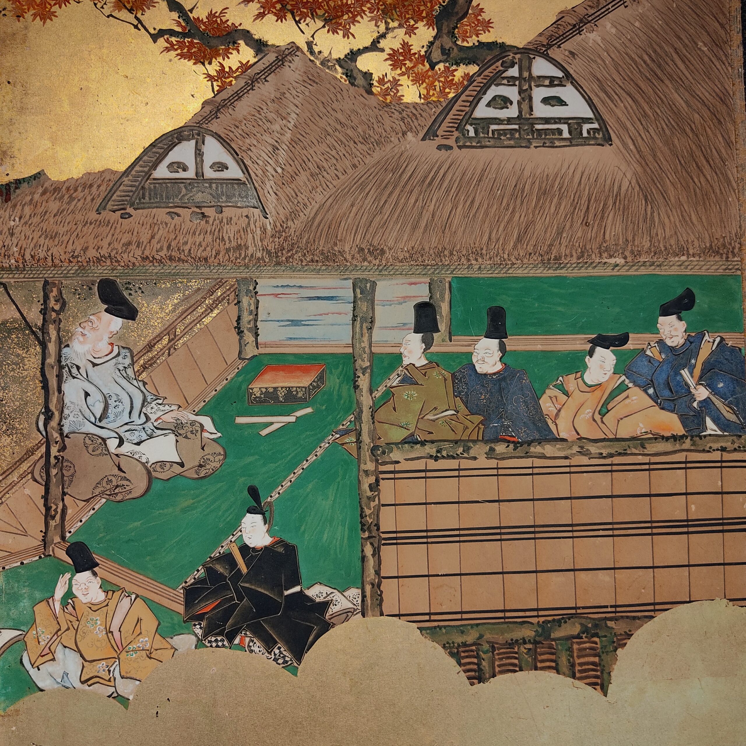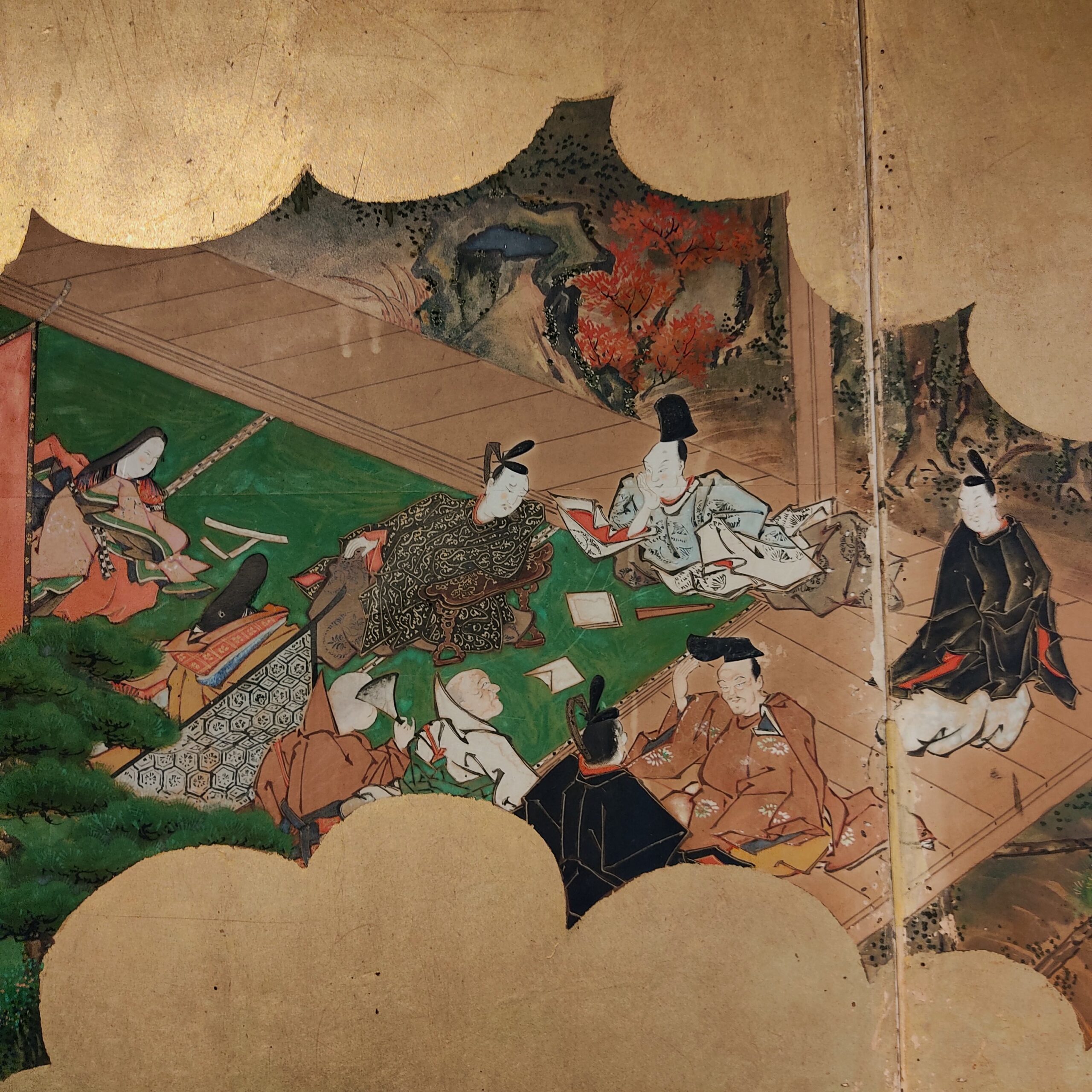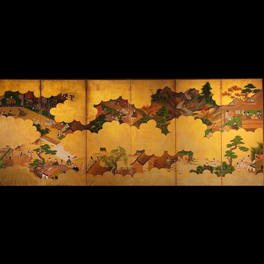 japanese antique Six hold paper screen painted in ink and color on a gold ground with genre painting