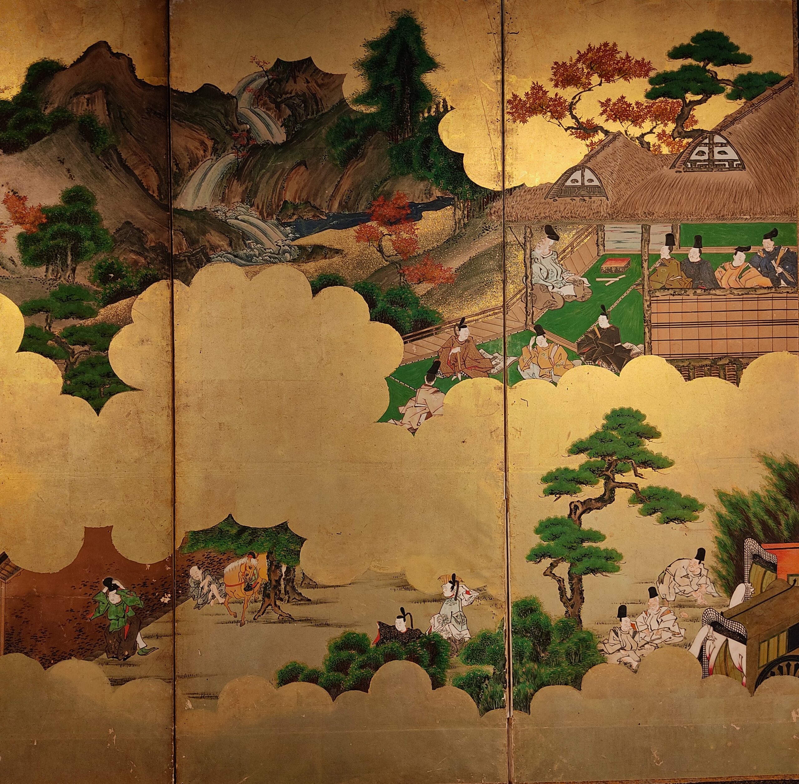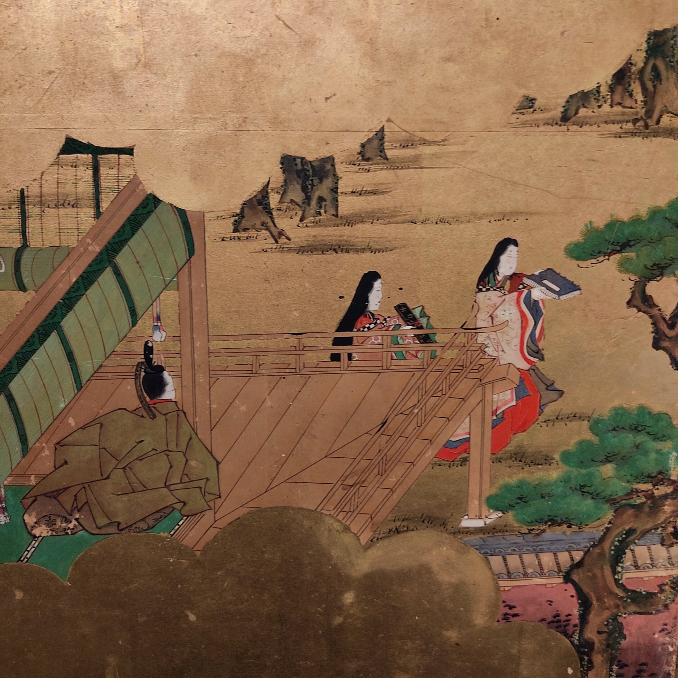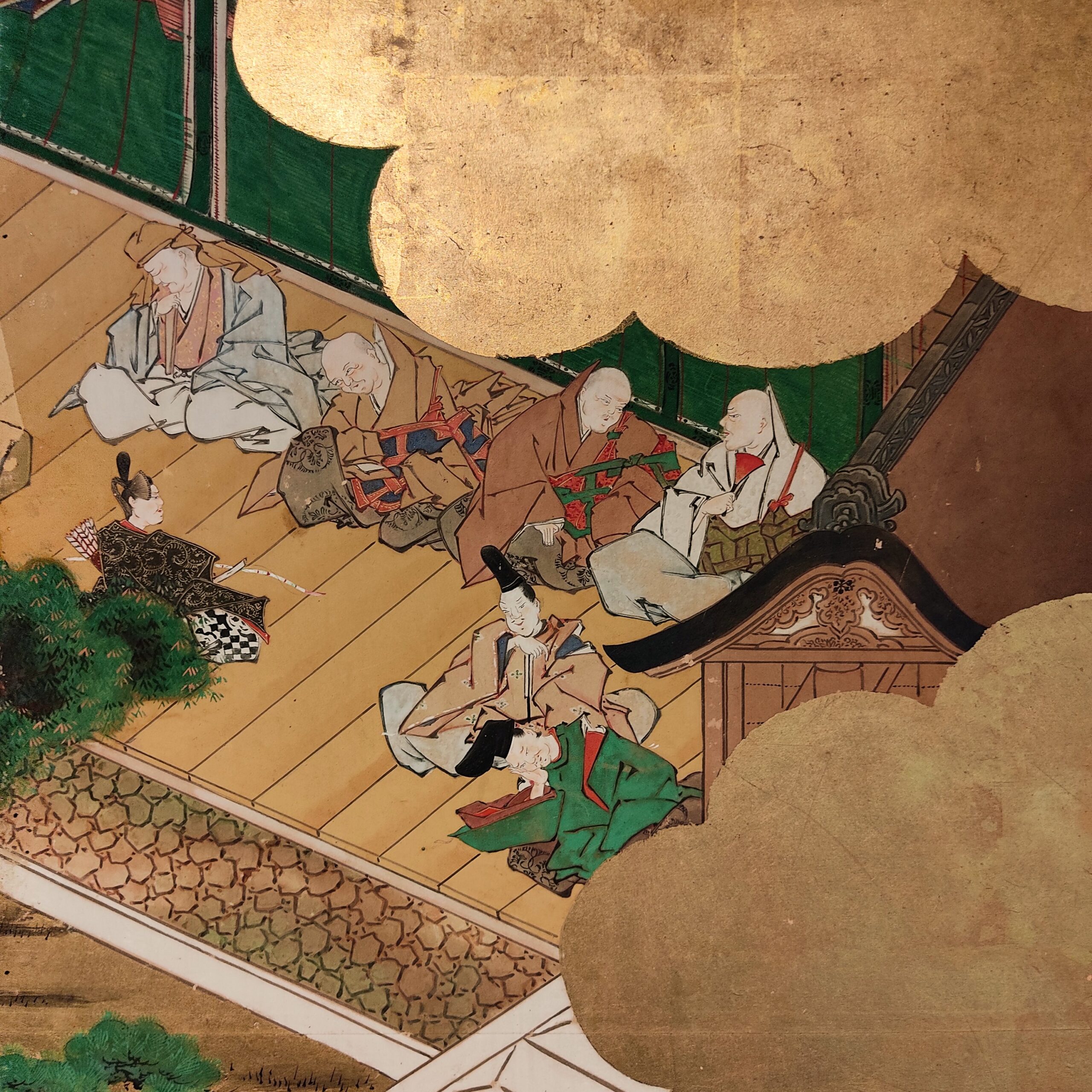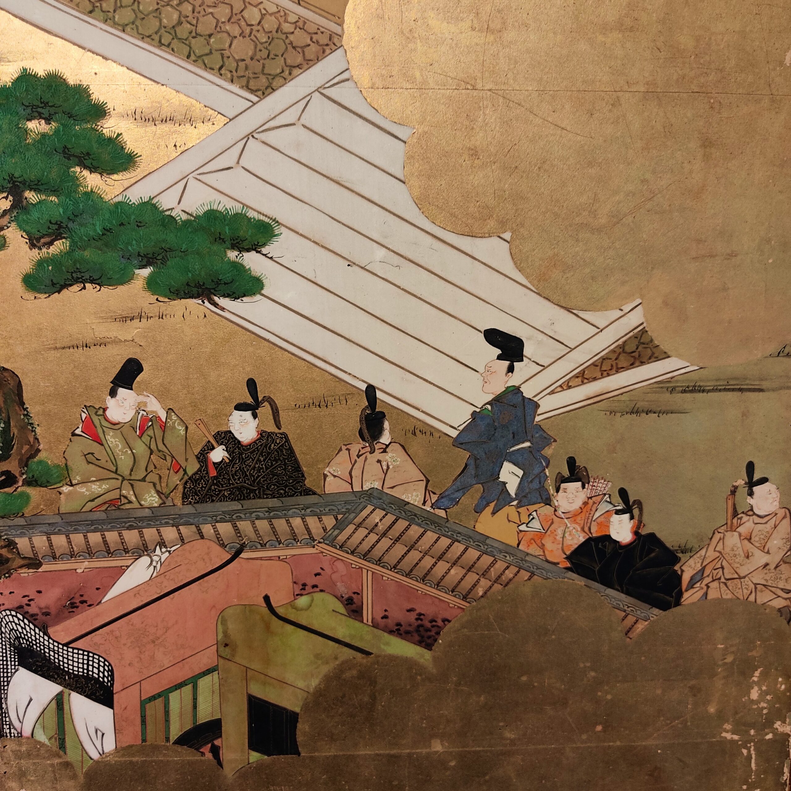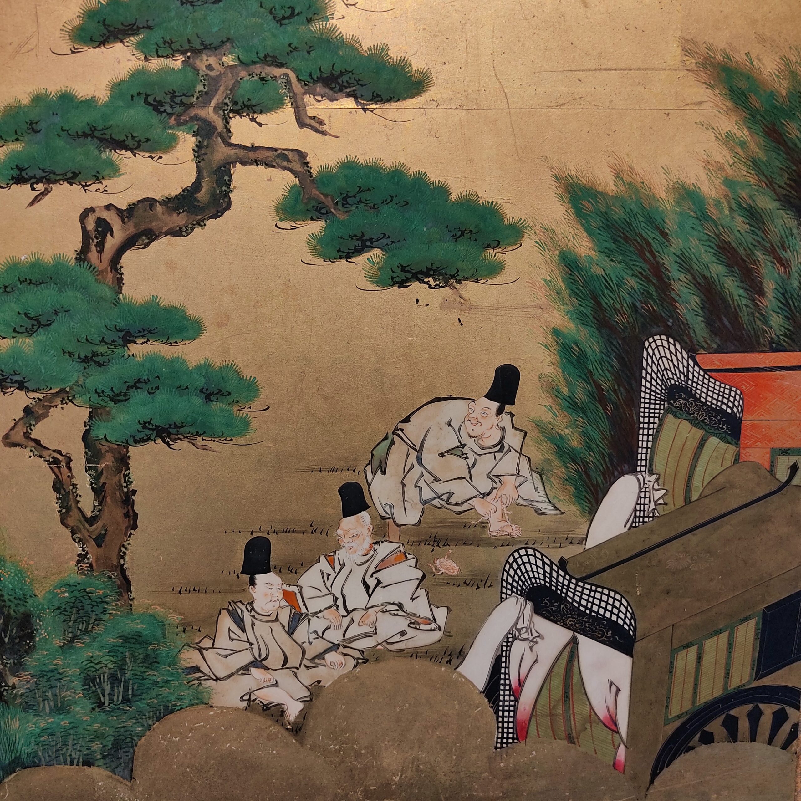 japanese antique Six hold paper screen painted in ink and color on a gold ground with genre painting