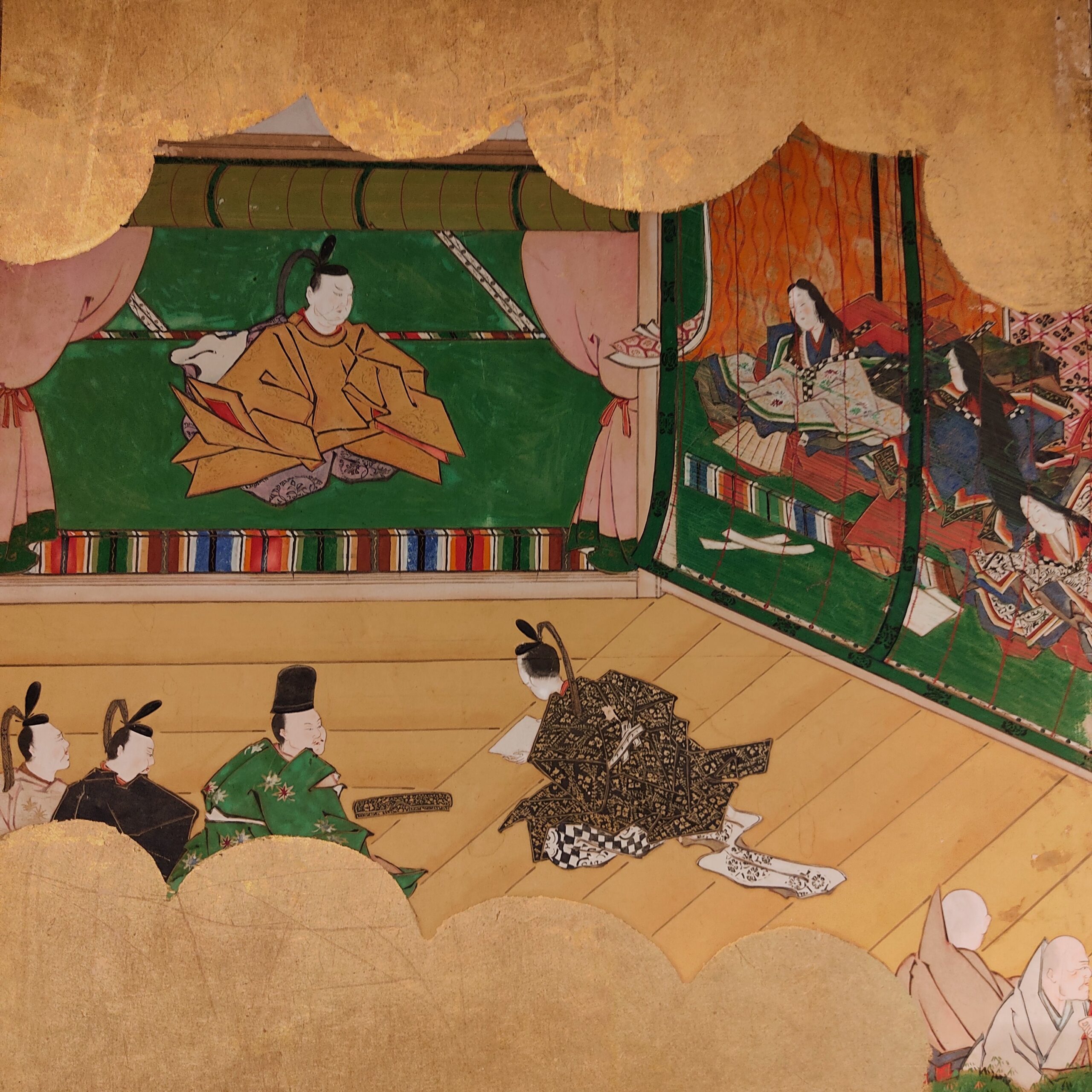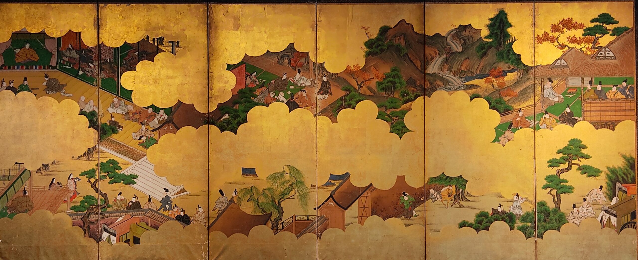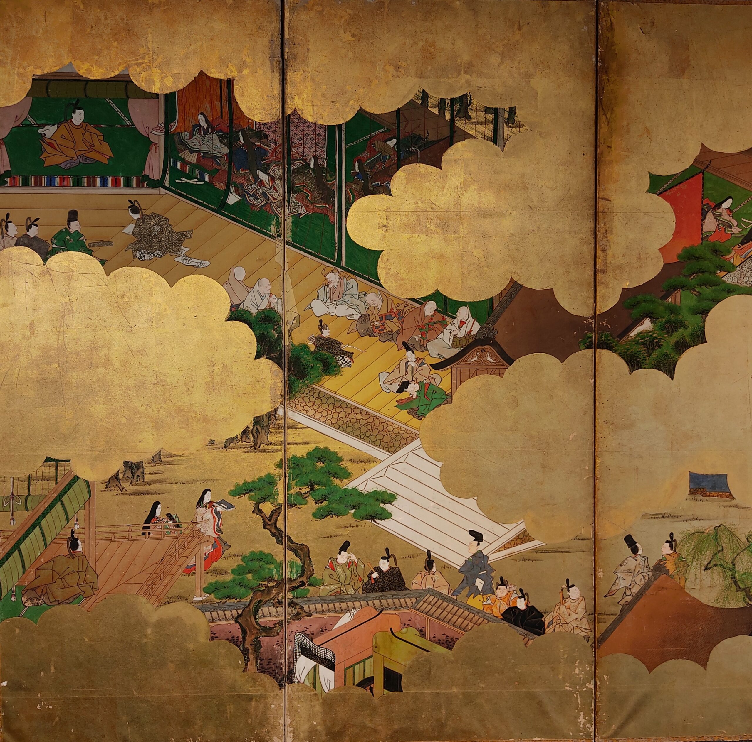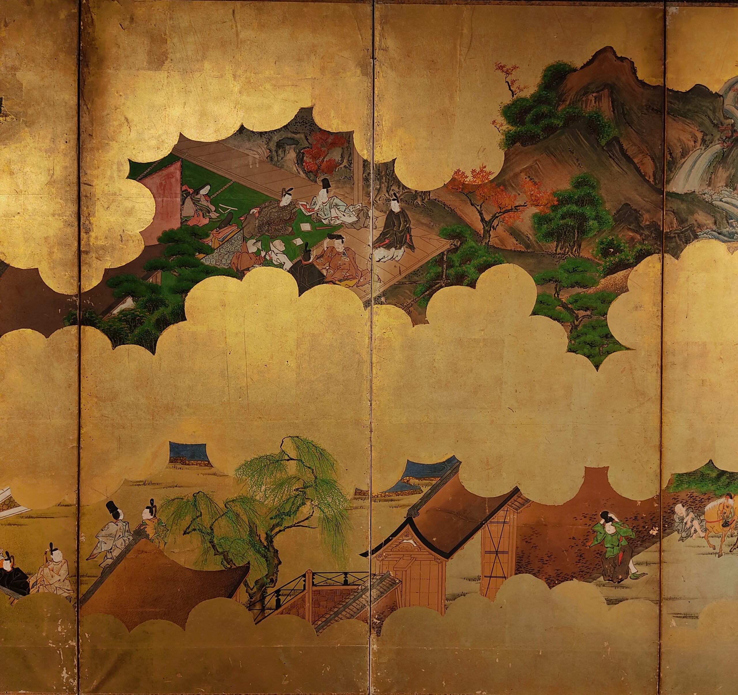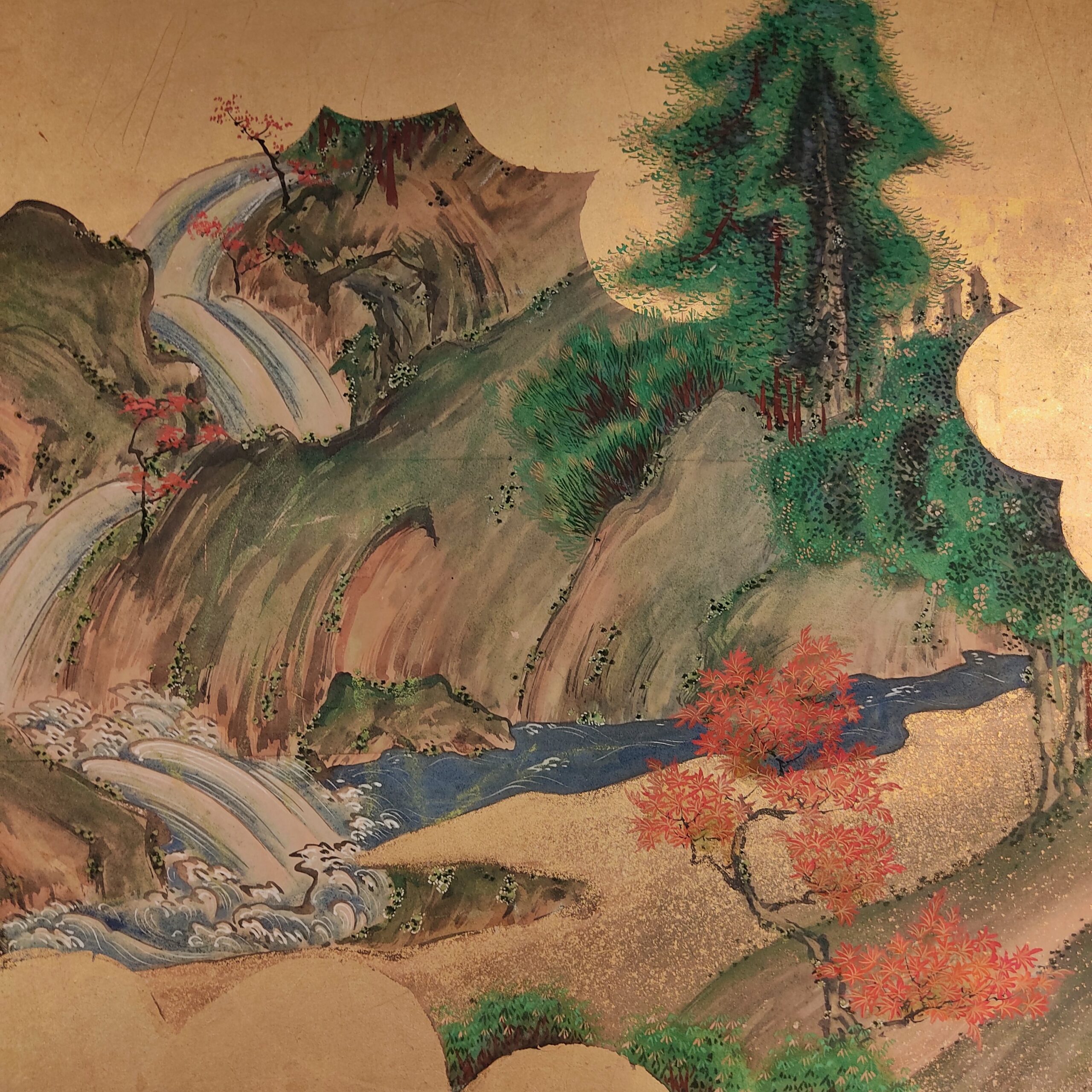 japanese antique Six hold paper screen painted in ink and color on a gold ground with genre painting