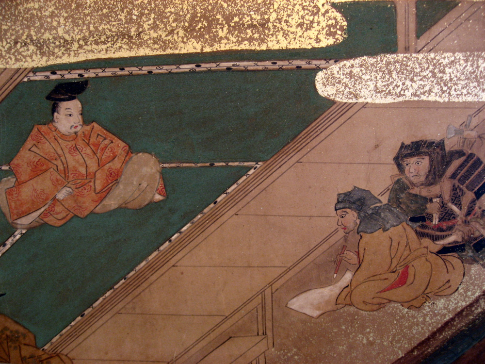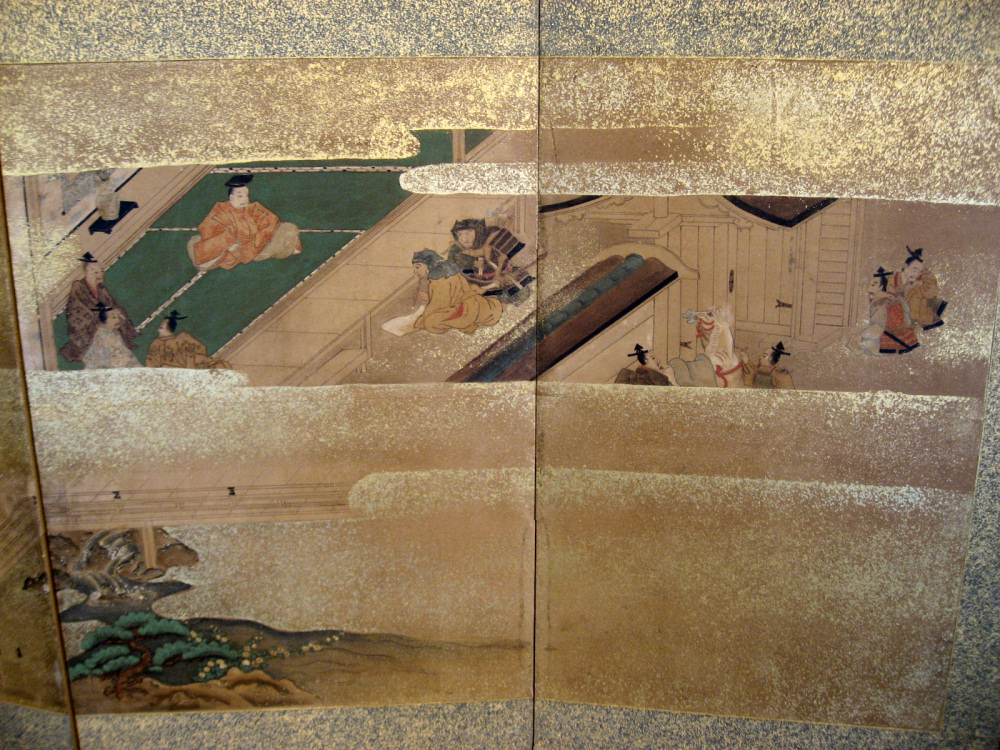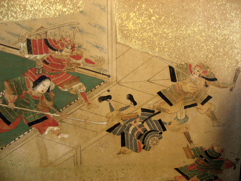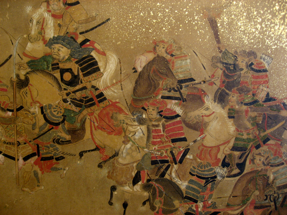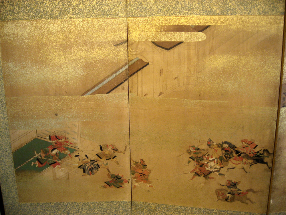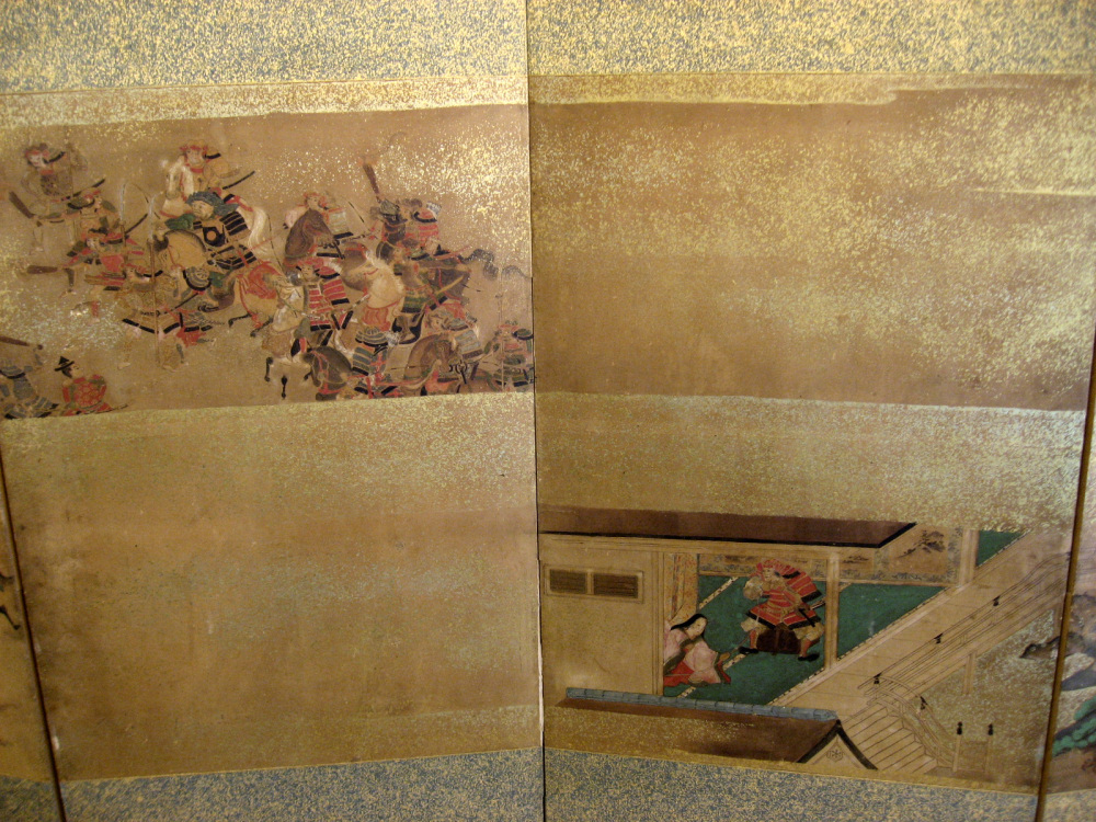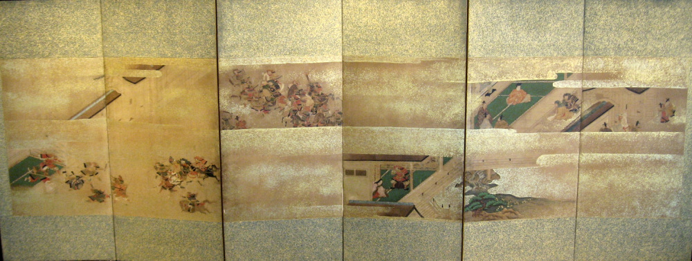 japanese antique Small six hold paper screen painted in ink and color on a gold ground with Samurai
