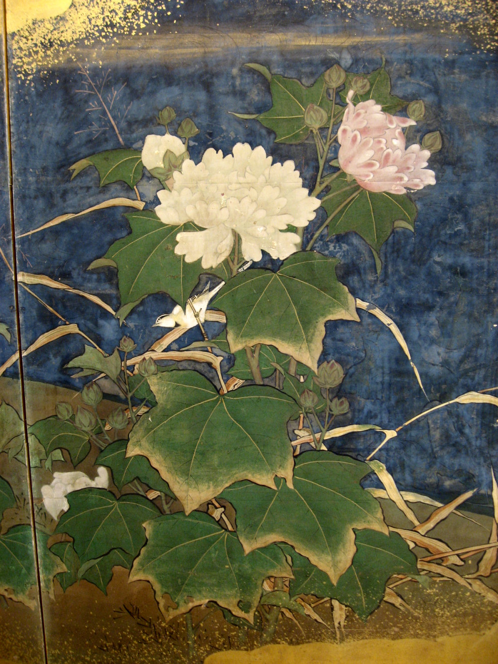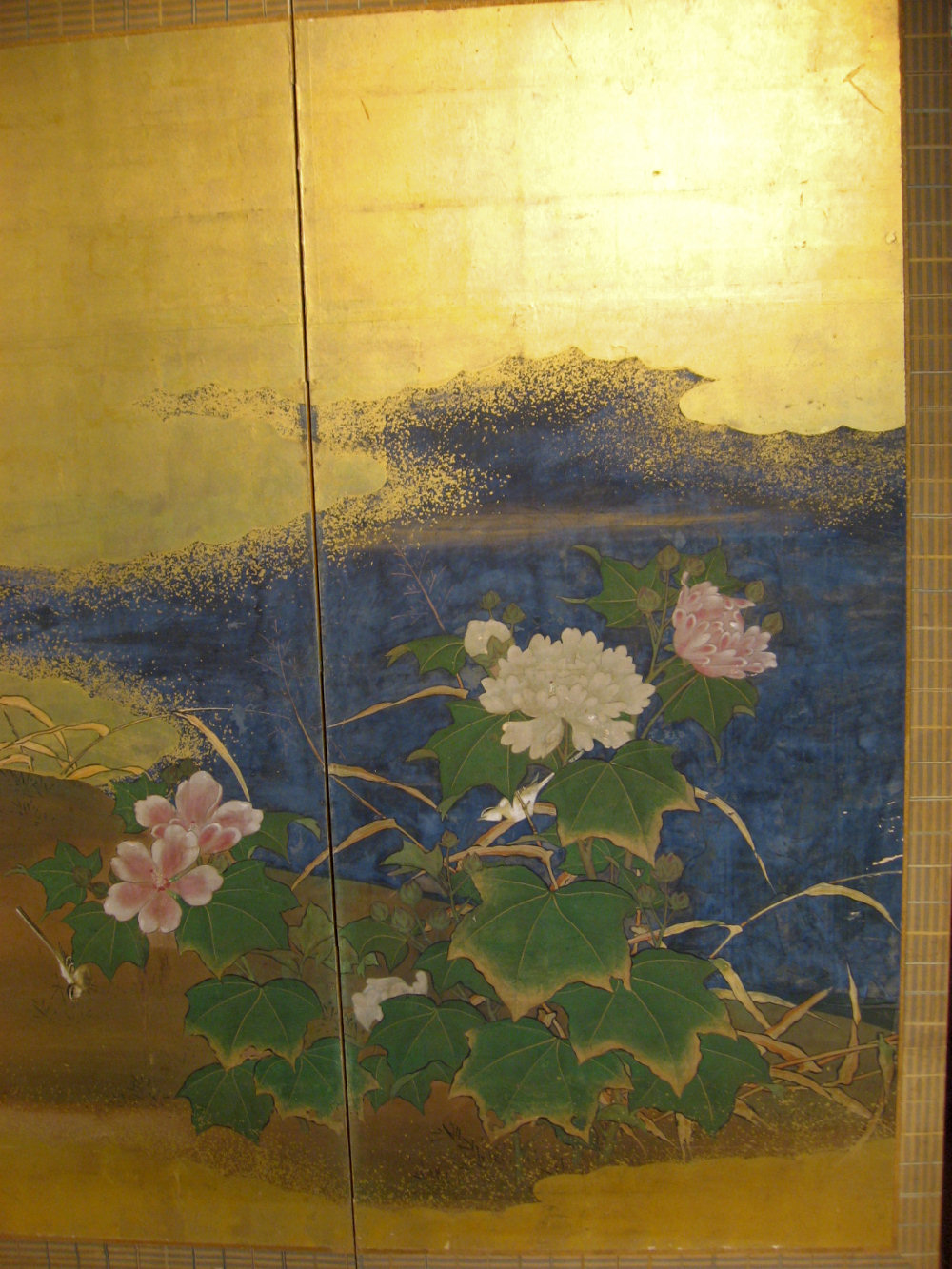 Two hold paper screen painted in ink and color on a gold ground with flowers and birds