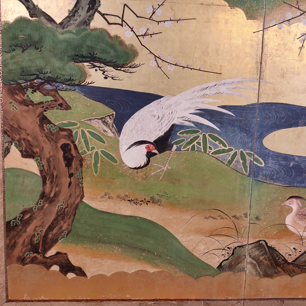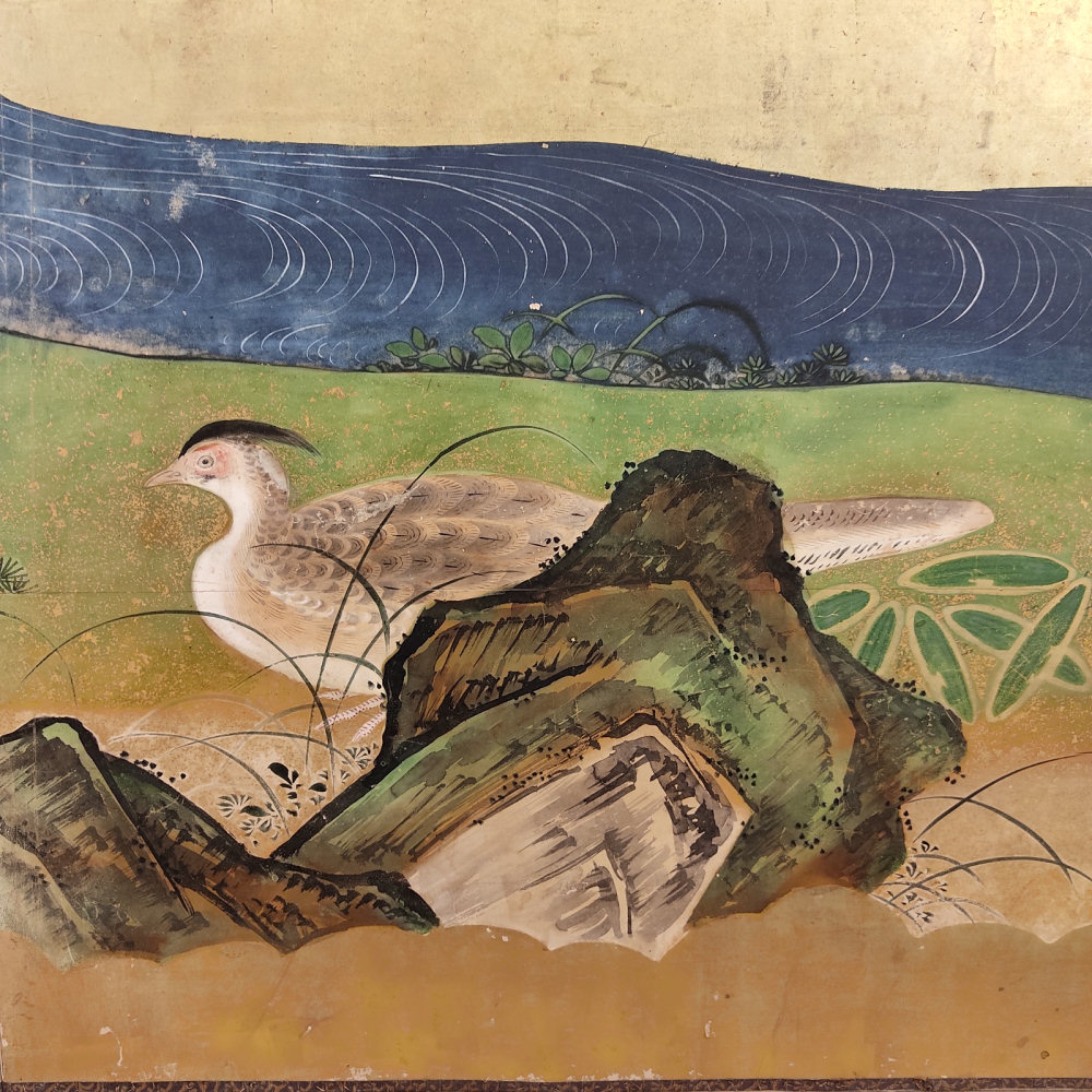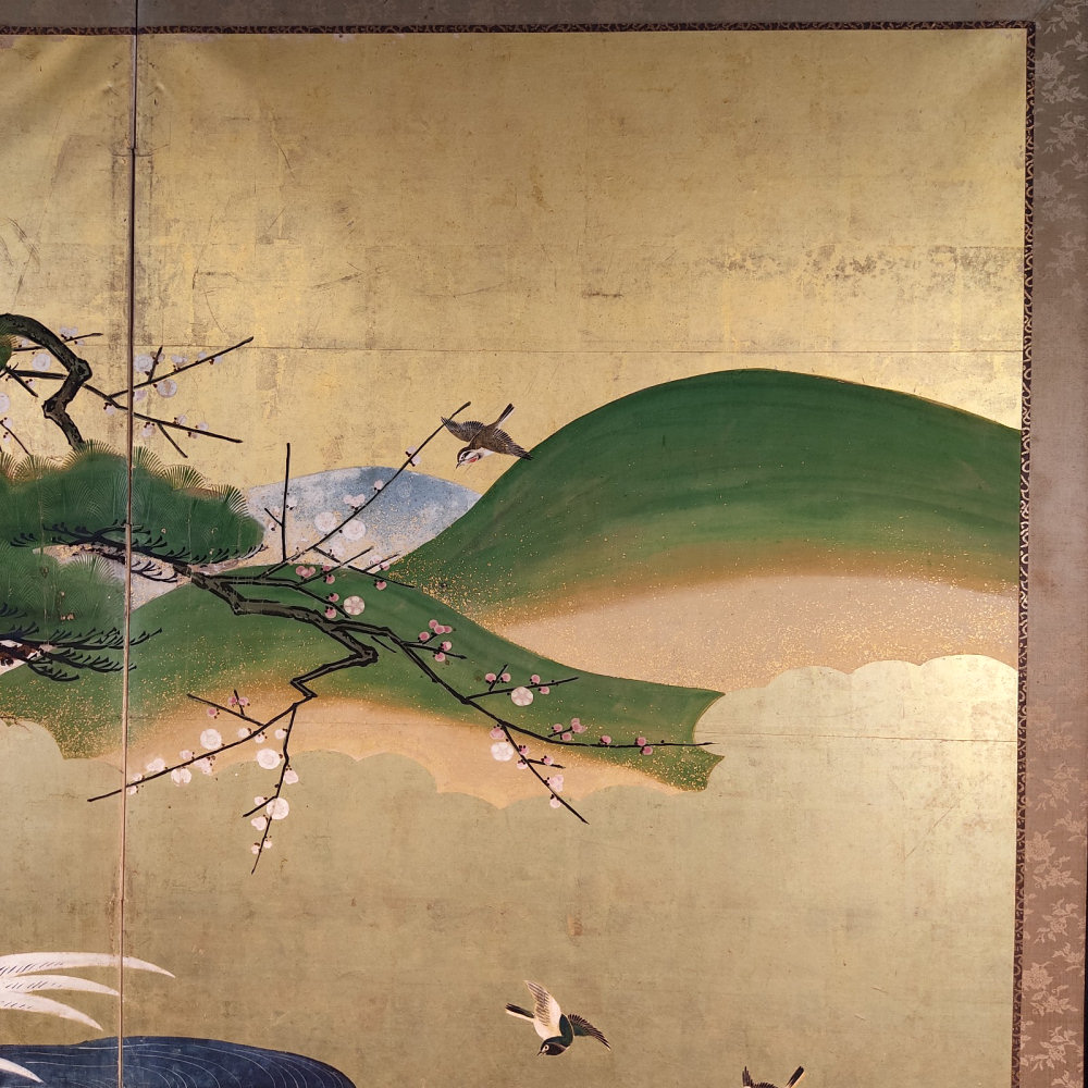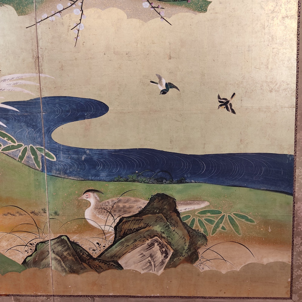 japanese antique two hold paper screen painted in ink and color on a gold ground with flowers and birds