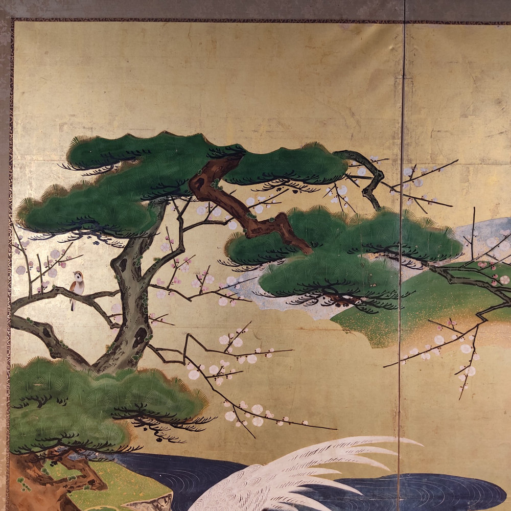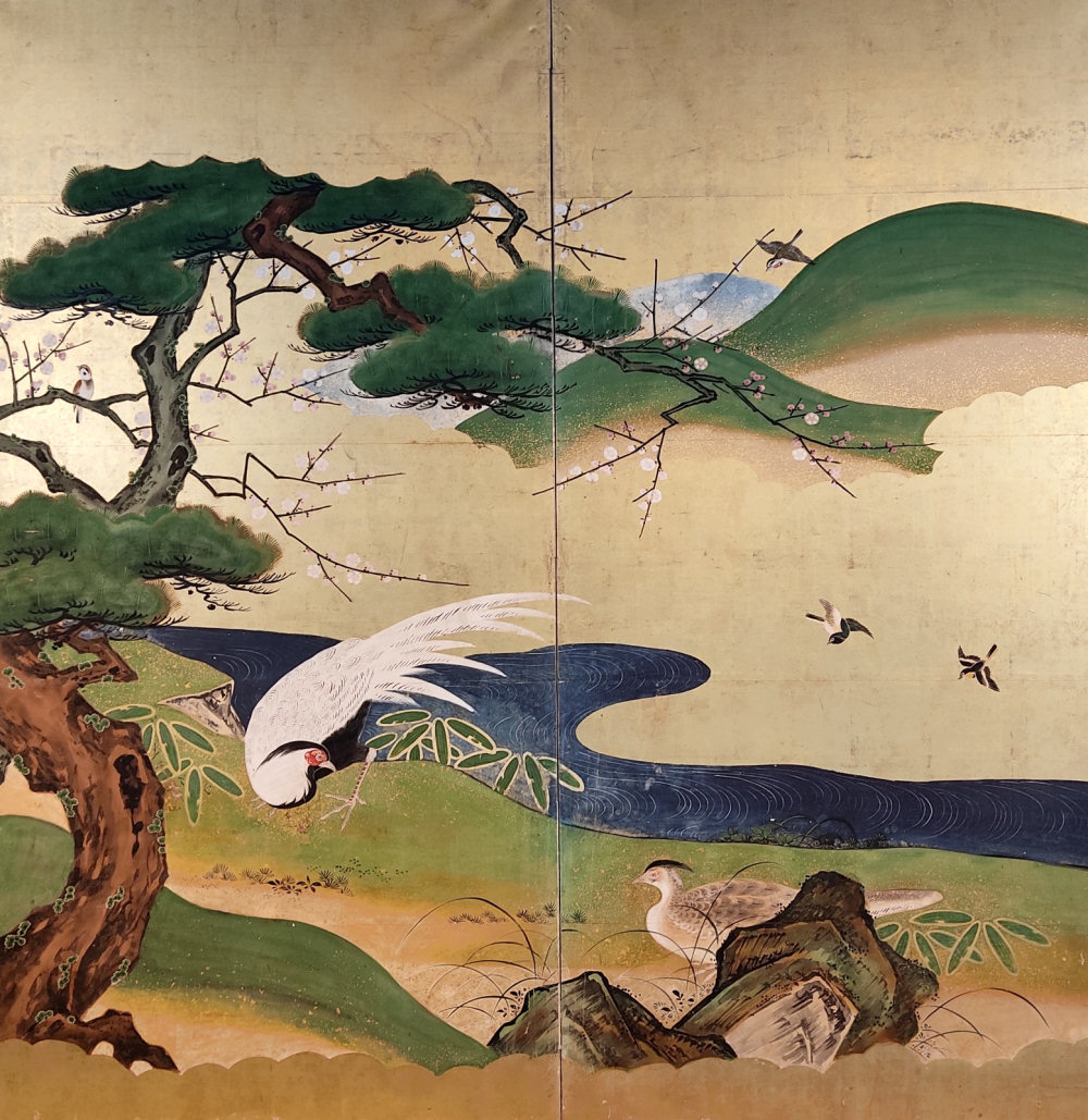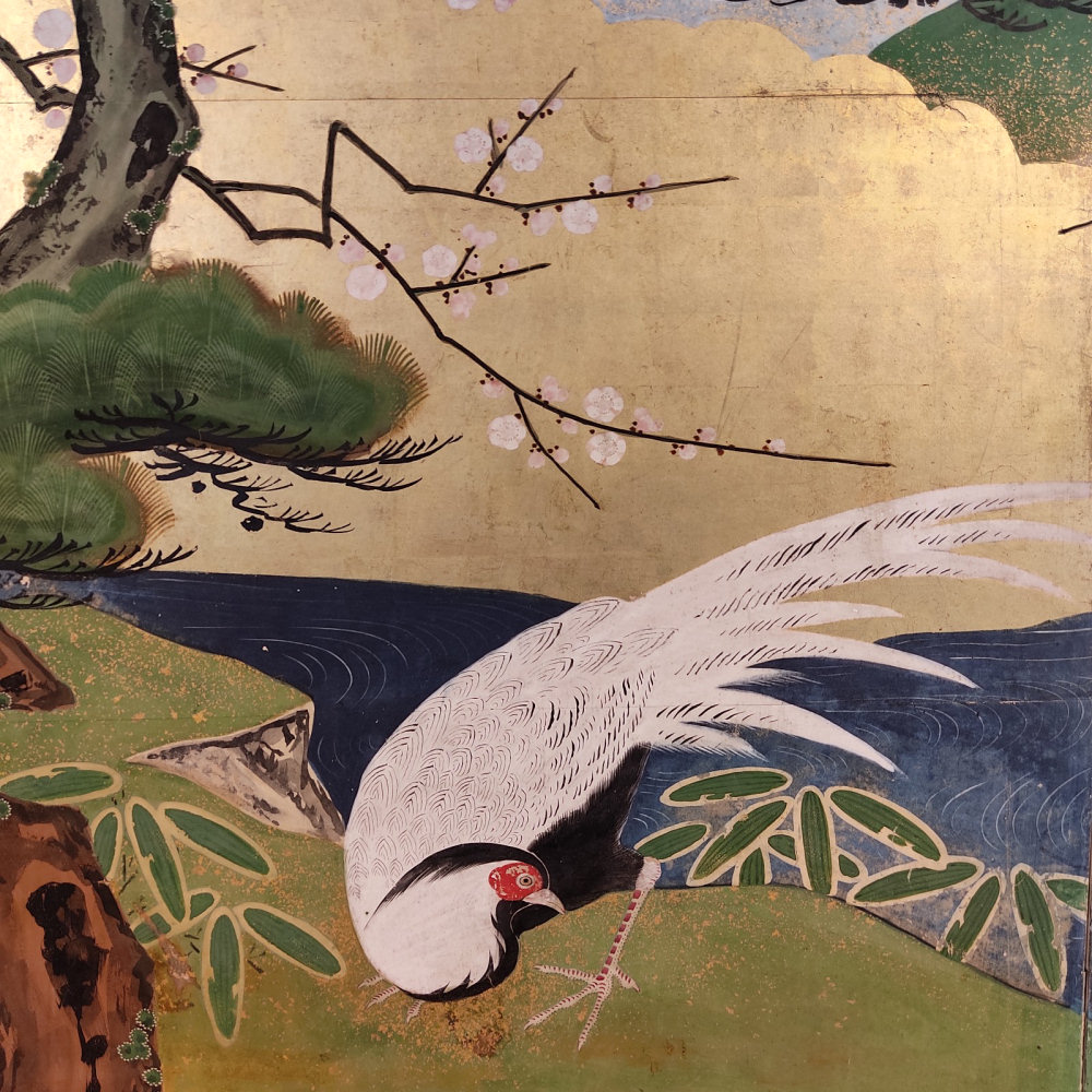 japanese antique two hold paper screen painted in ink and color on a gold ground with flowers and birds